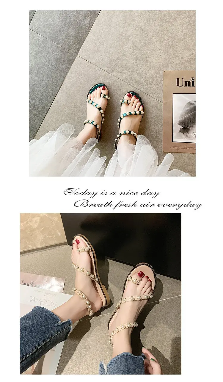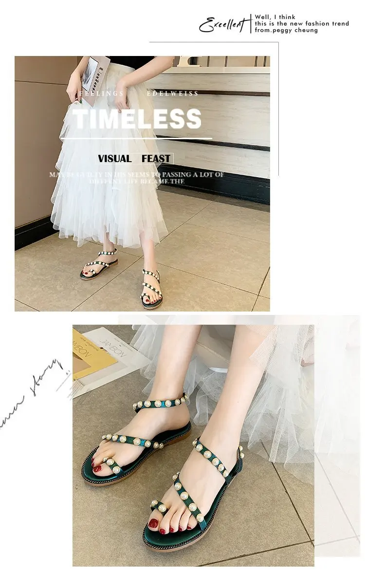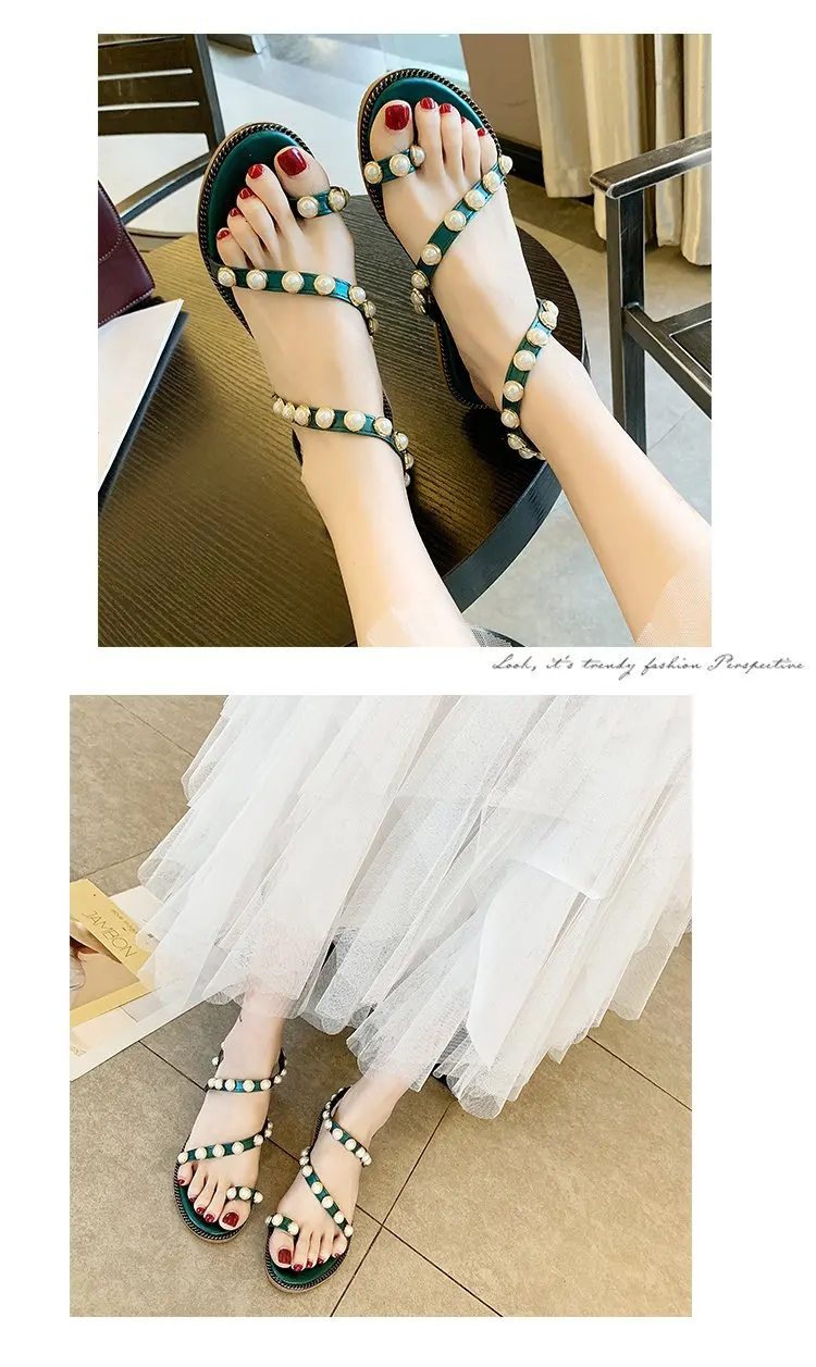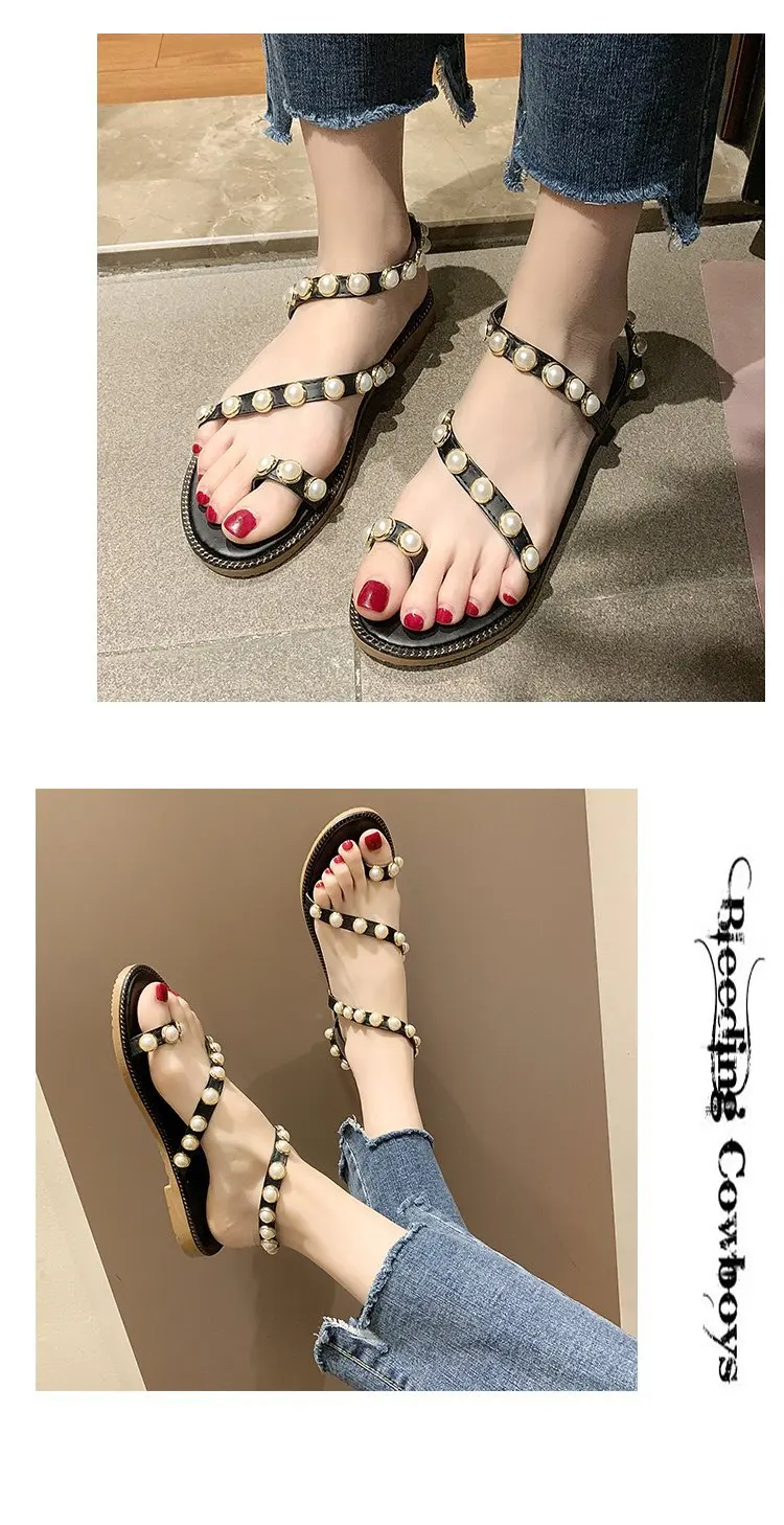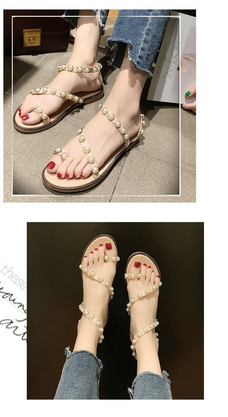pearl rivets punk sandals women clip toe beading gladiator sandalias mujer slip on lazy shoes woman beach espadrilles sandales