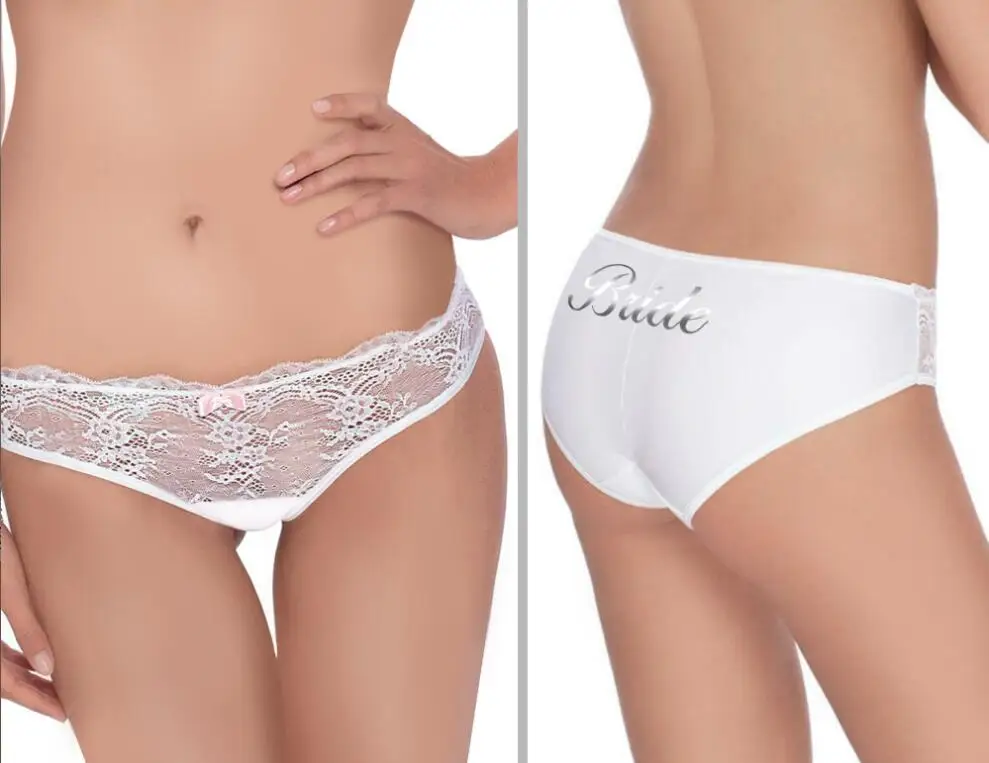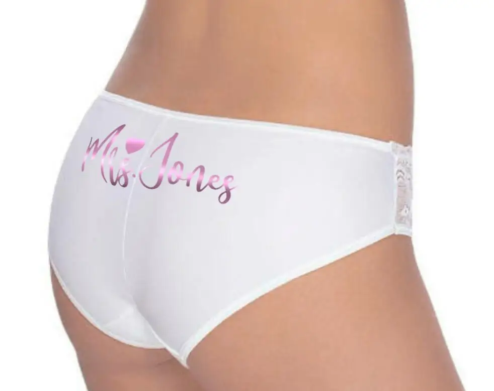 Why not make your day extra special with these beautiful wedding panties, personalized with your soon to be surname or initials, printed in any choice of colour from our colour options chart (please see photograph) metallic to give a touch of luxury!