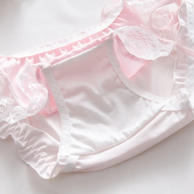 Pink bra set for teenage students thin molded cup lingerie solid color lace-up triangle cup bra underwear