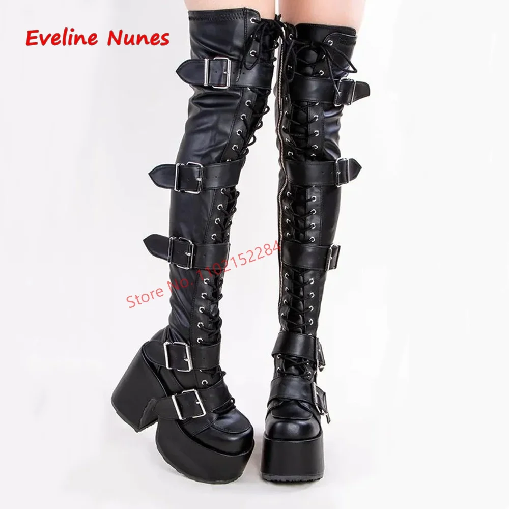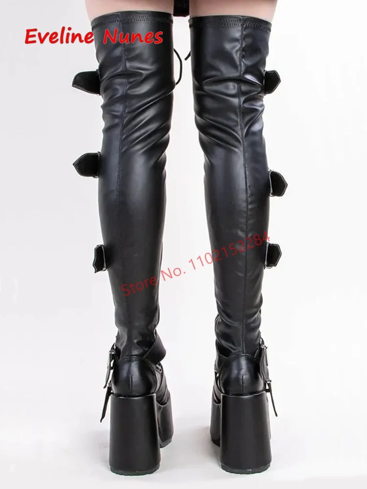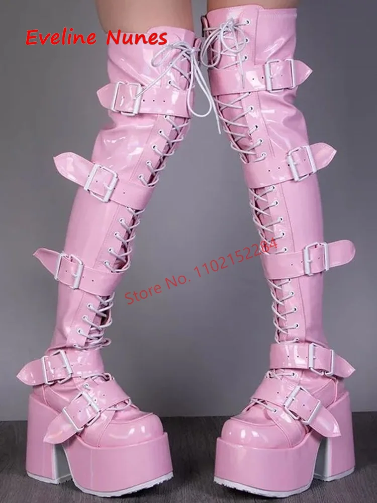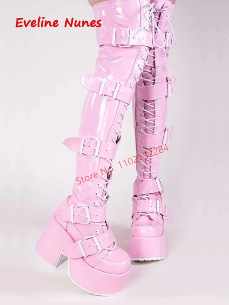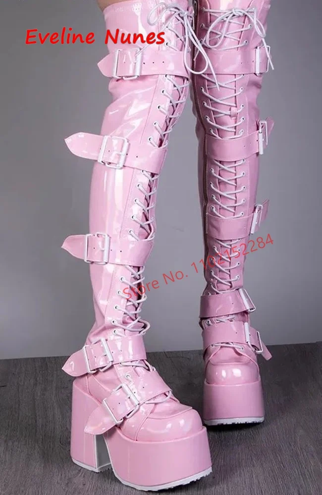 Pink Platform Over The Knee Boots Women’s Luxury Brand Leather Round Toe Chunky Heel Fashion Plus Size Sexy Elastic Shoes