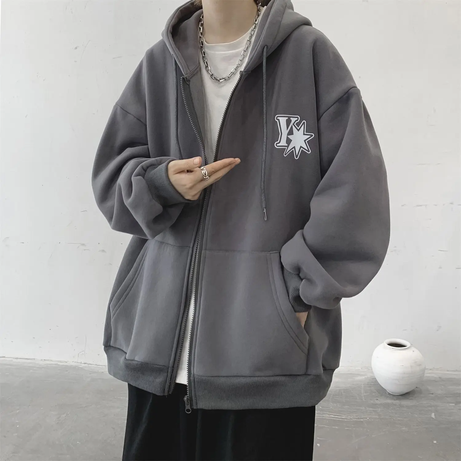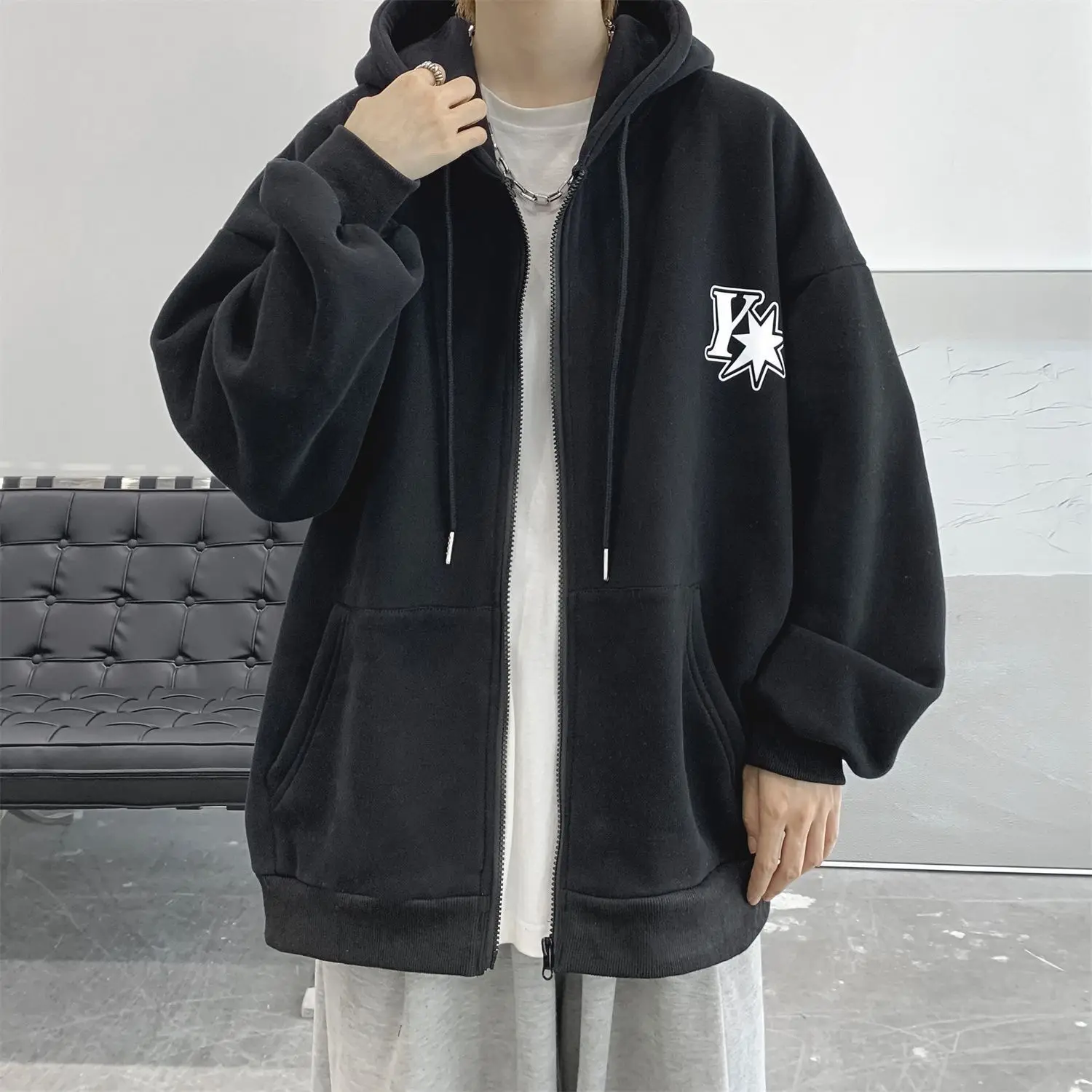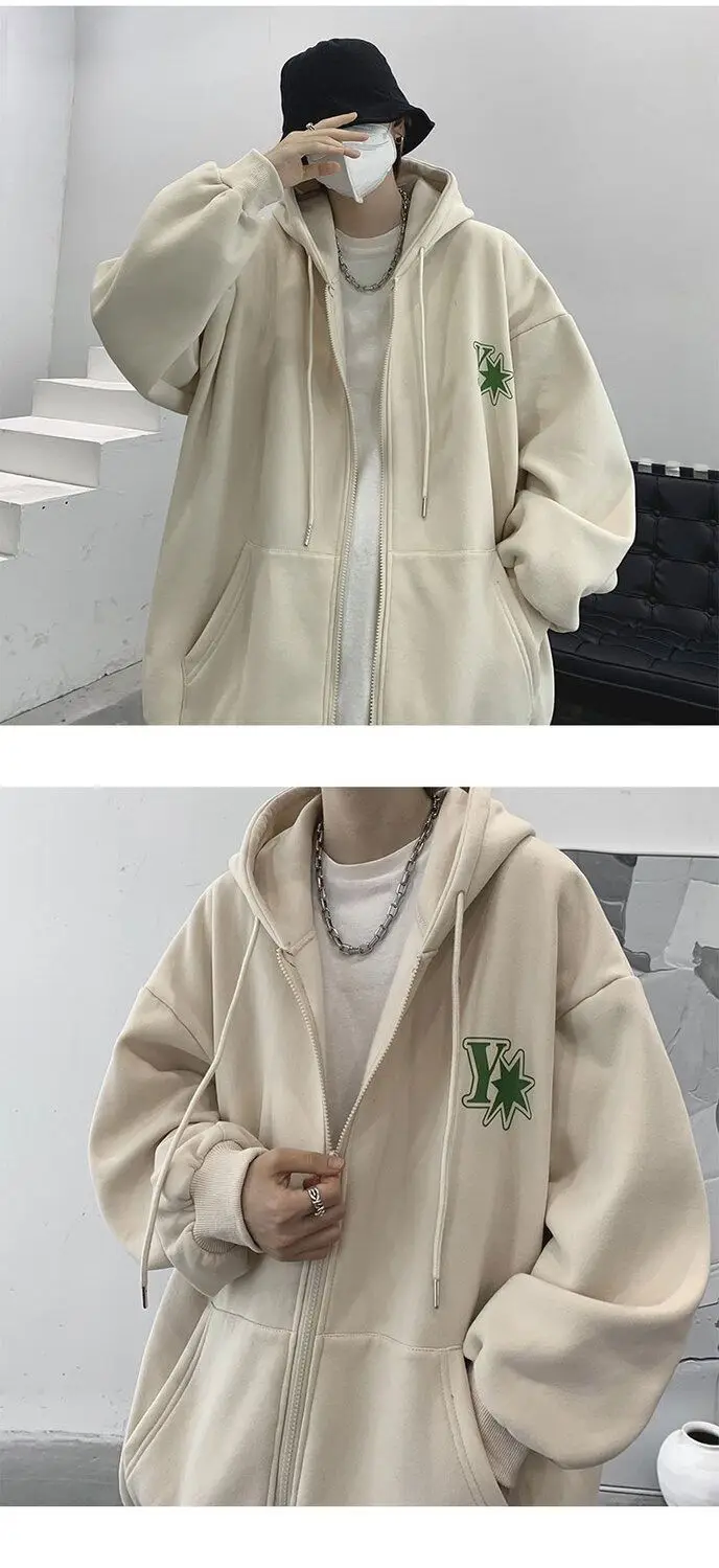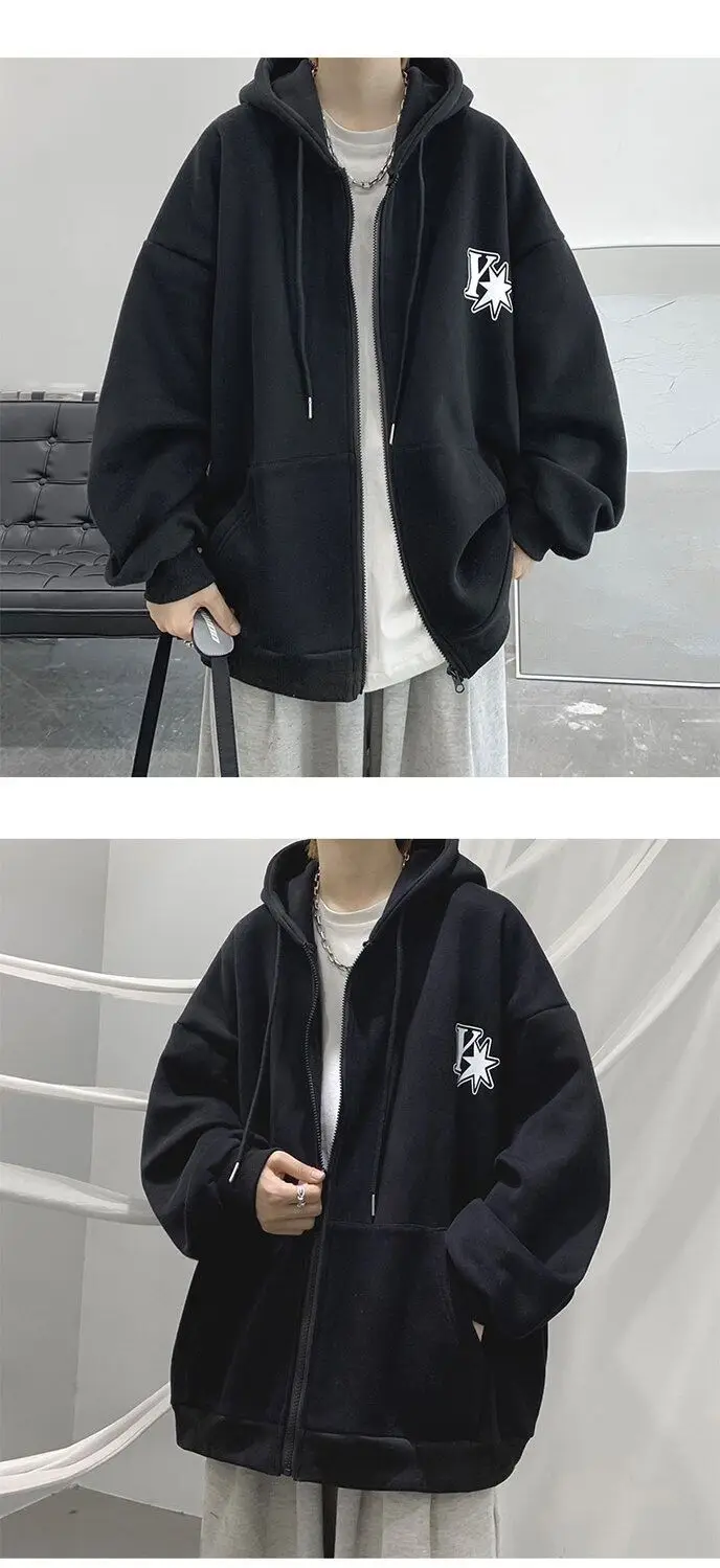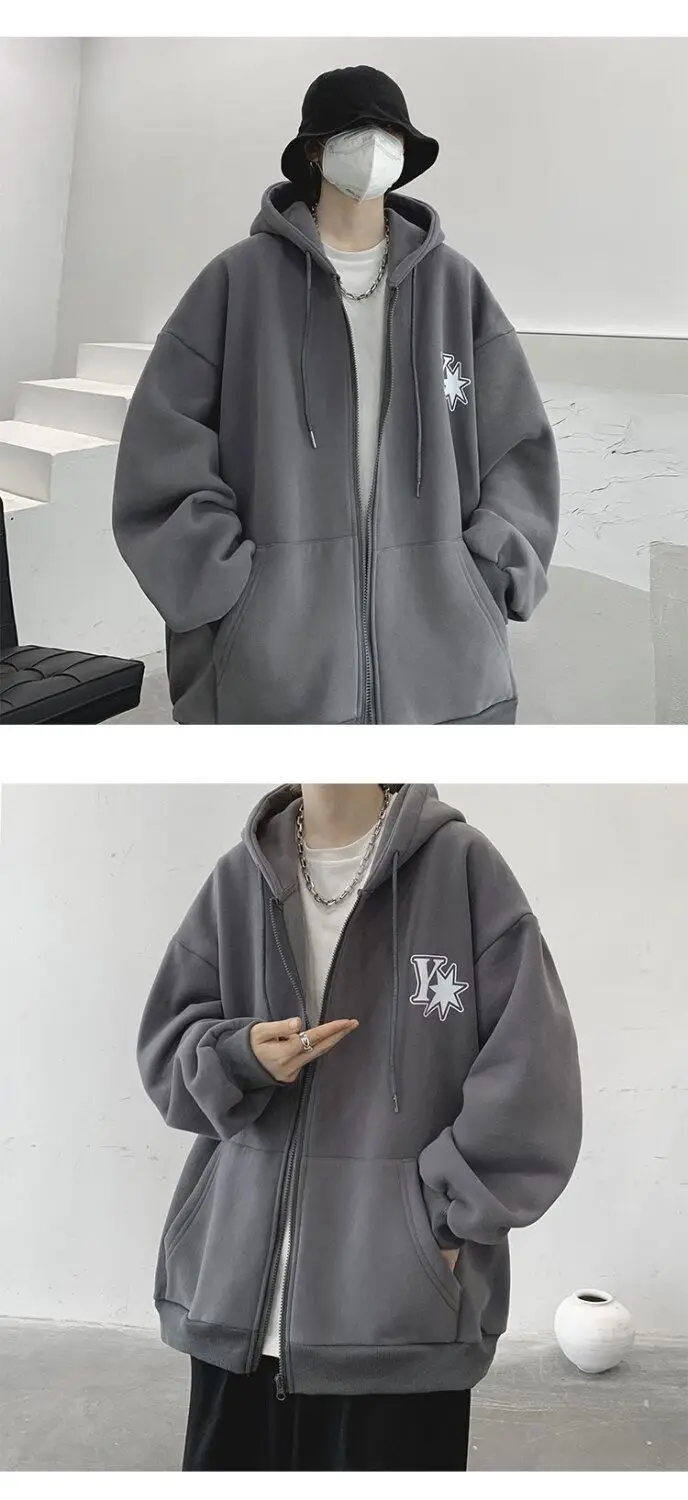 Plush and thick hooded cardigan sweater for men’s autumn and winter loose and versatile fashion brand ins zipper jacket