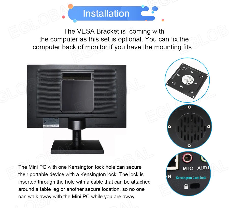 1xMini PC, 1xPower Adapter, 1xPower Cord, 1xScrews Bag, 1xVESA mount |