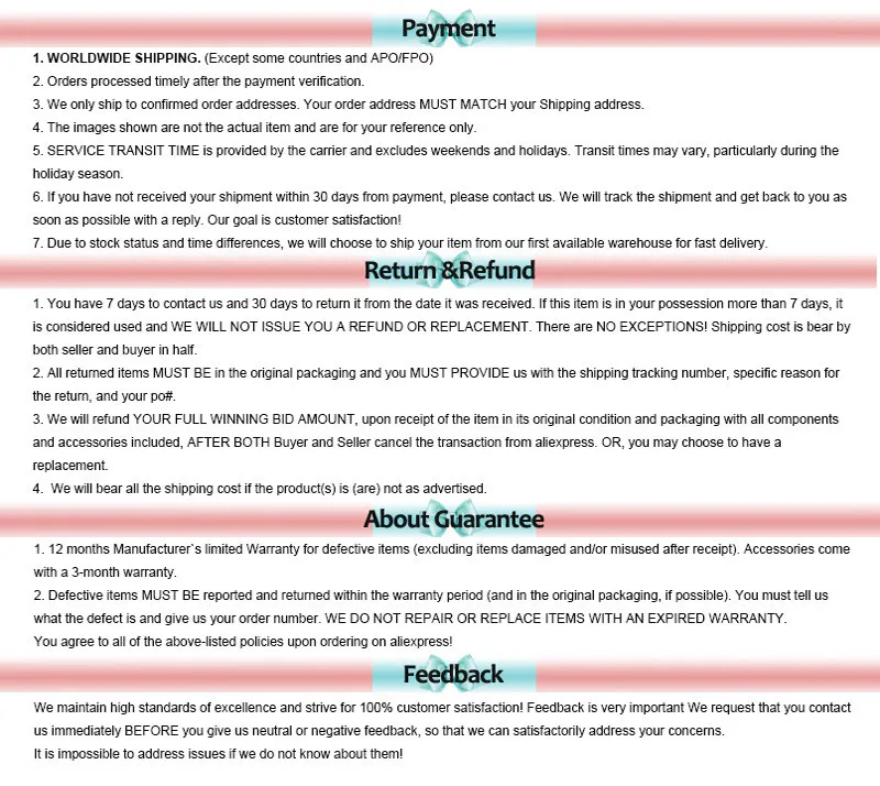 • If you did not receive the product within the guaranteed time( 45 days not including 2-5 day processing) you can request a refund or a reshipment.