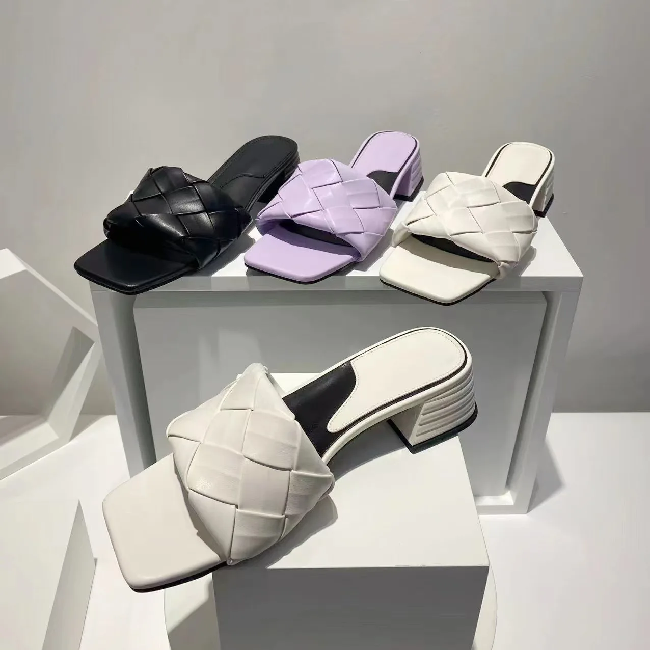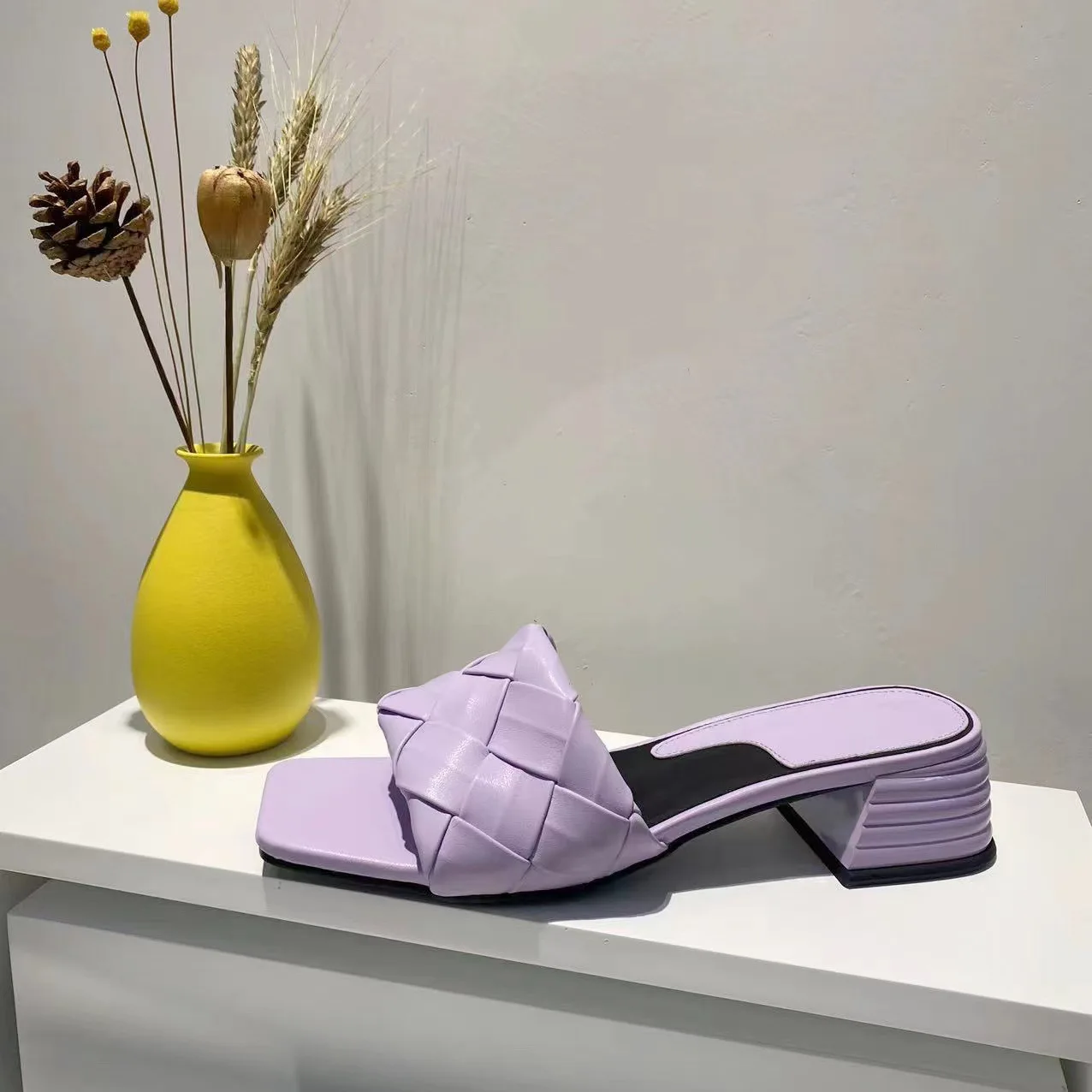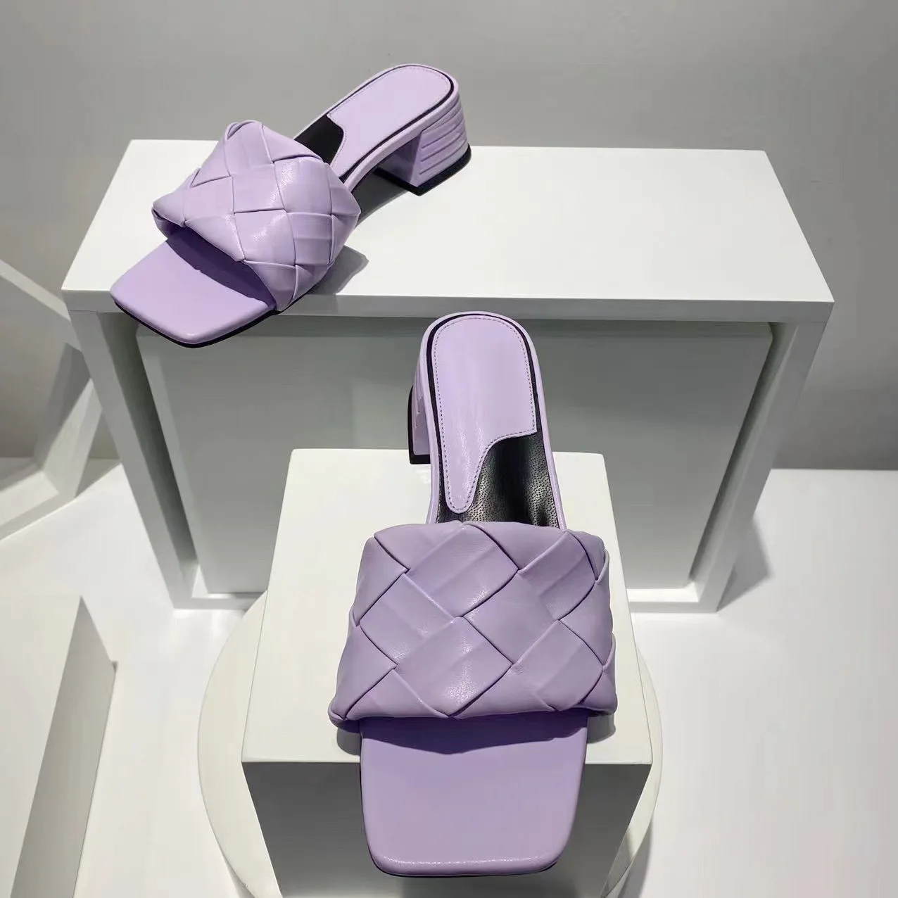 purple/white leather weaved slippers women thick med-high heels sandals mixed color outdoor slide shoes woman flip flops size 41