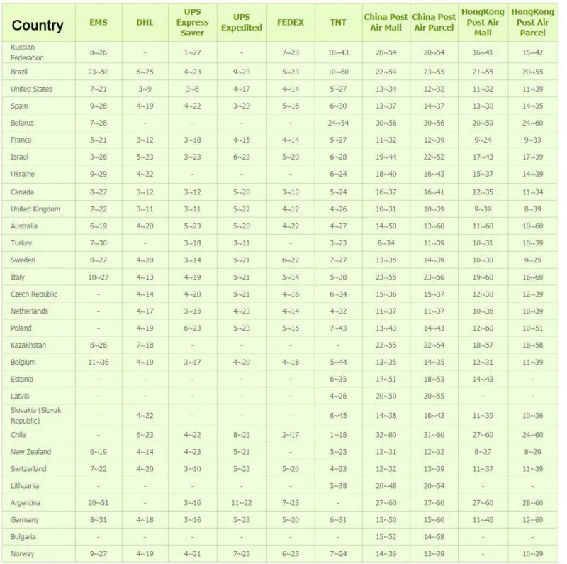 For the clients from Russia/USA/United Kingdom/Canada/France/Israel/Saudi Arabia/Australia/Norway, we can send Epacket(if the parcel weight is within 2kg), it is fast, the regular delivery time is about 15 days,but sometime is not controllable, so if do not receive the parcel within 15 days, please be patient, thanks for your consideration