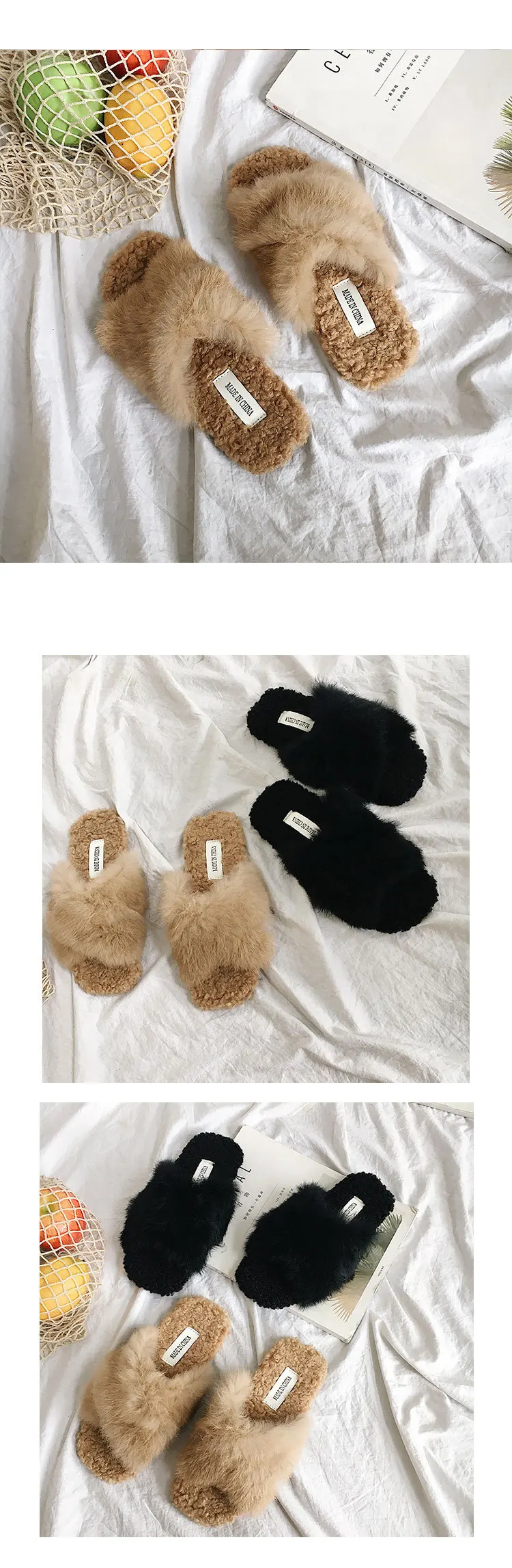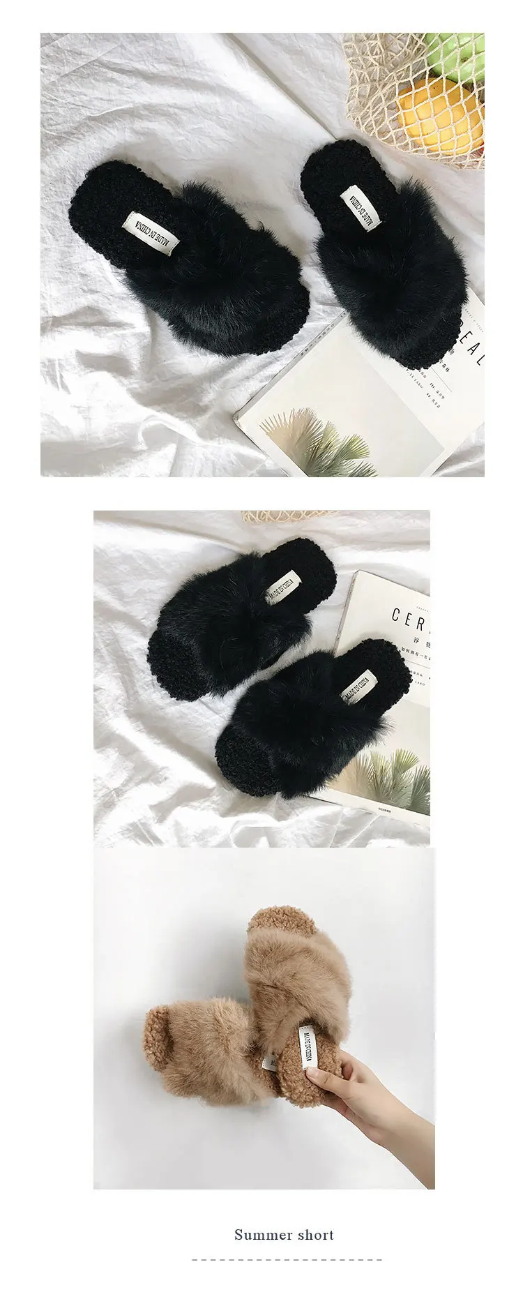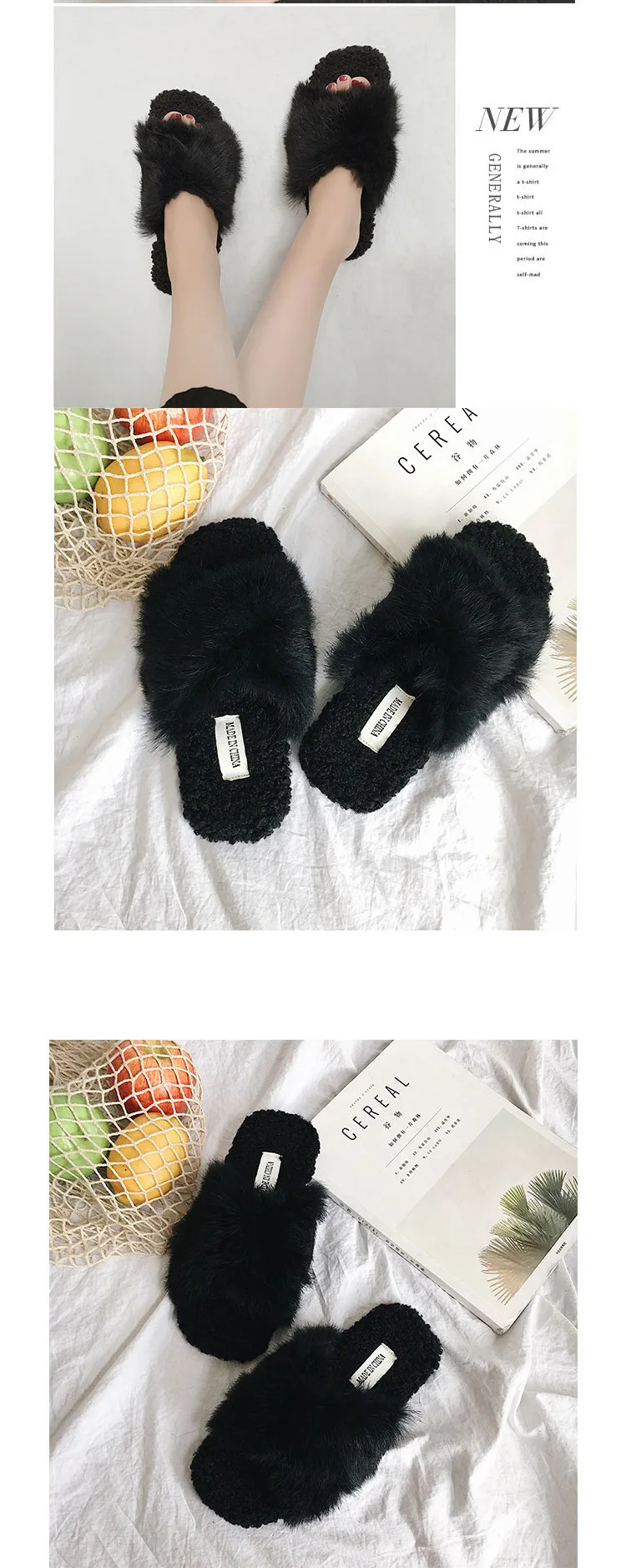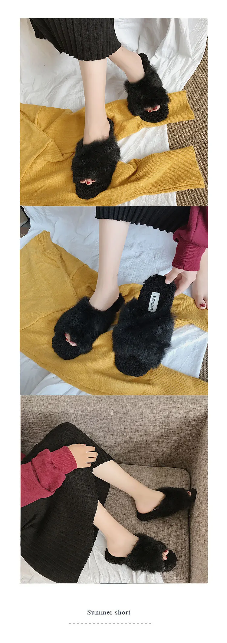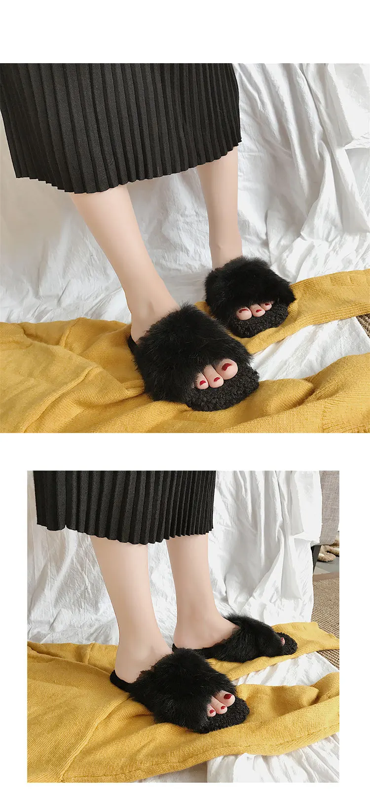 rabbit fur cross band thick bottom slides woman short plush mules shoes warm winter fur flip flops woman furry sandals slip on