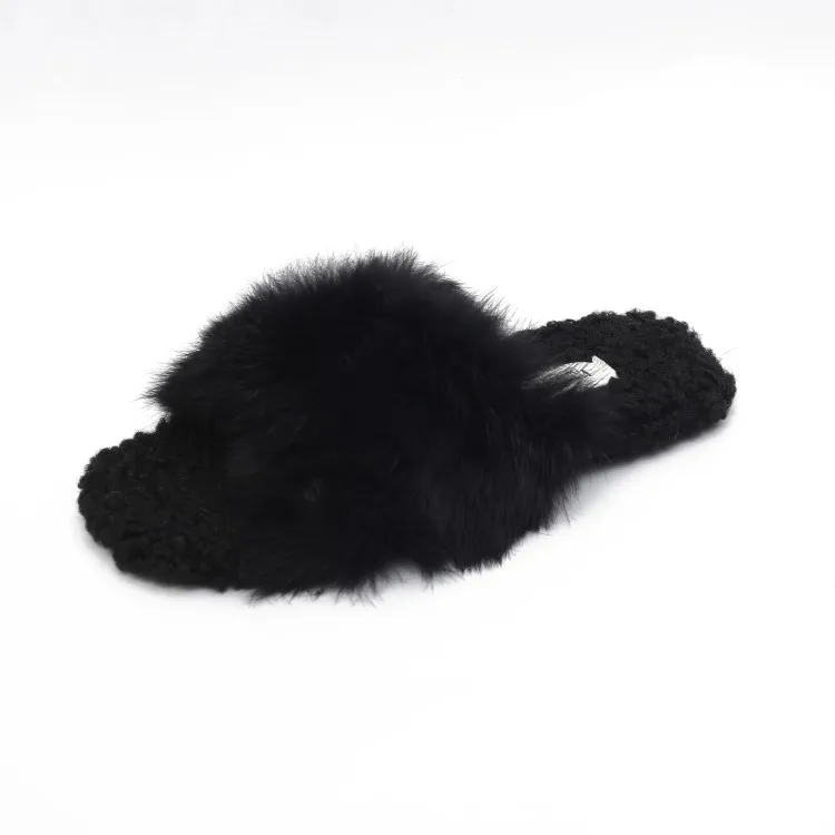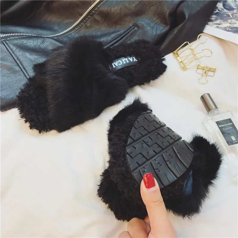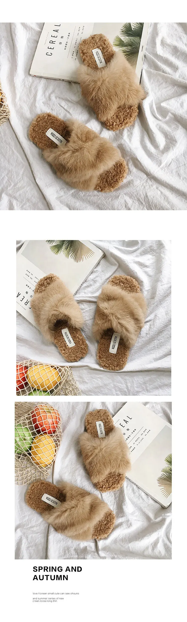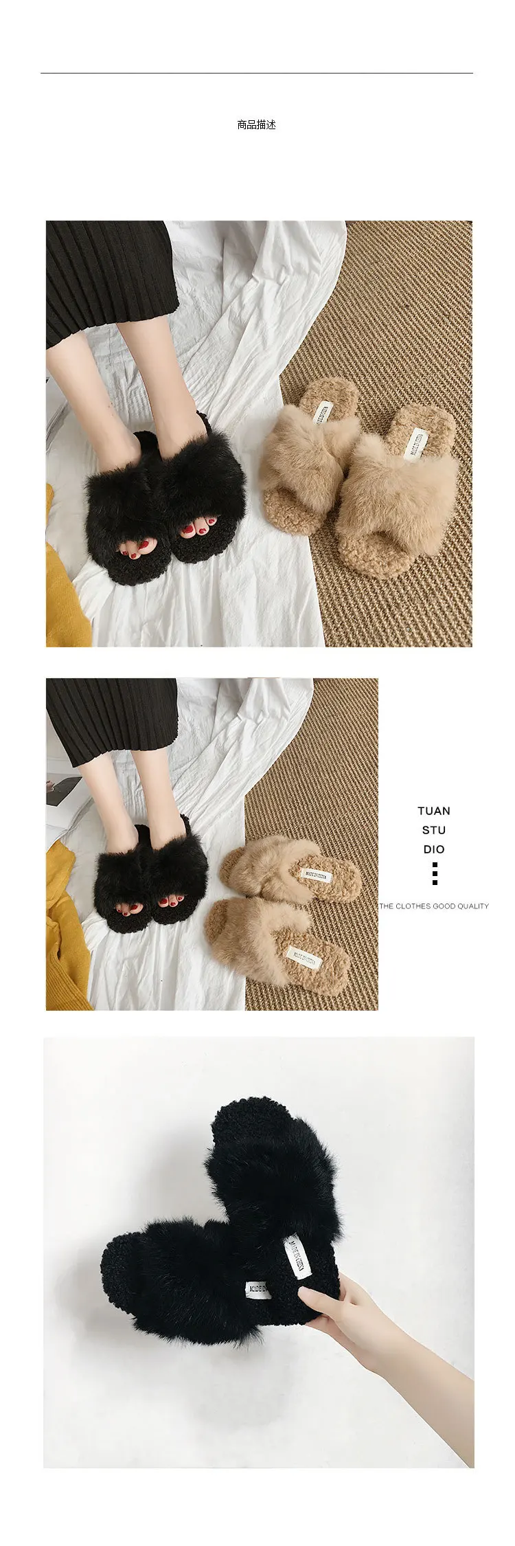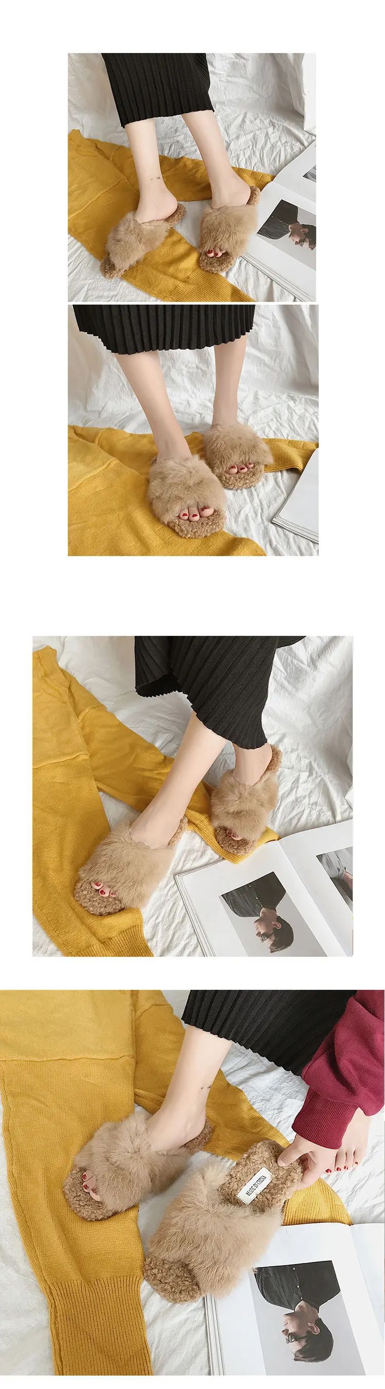 rabbit fur cross band thick bottom slides woman short plush mules shoes warm winter fur flip flops woman furry sandals slip on