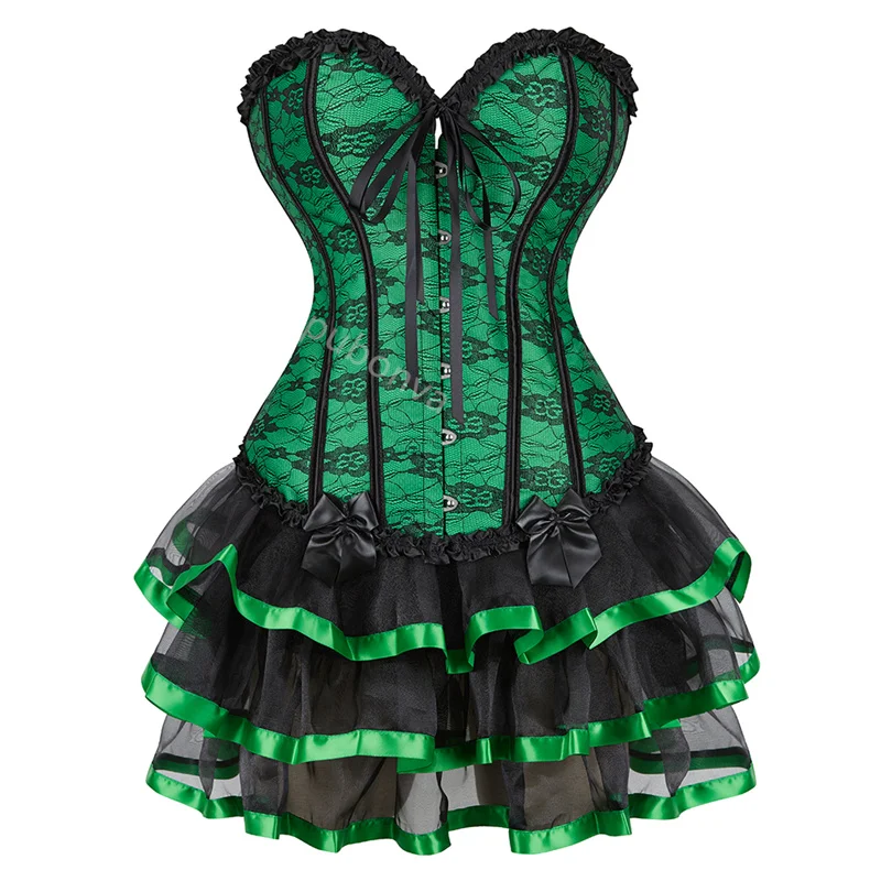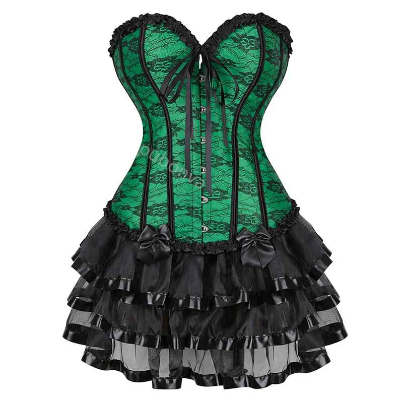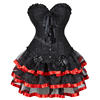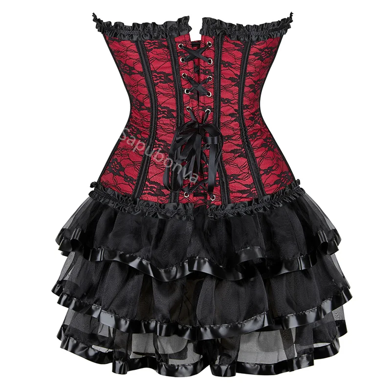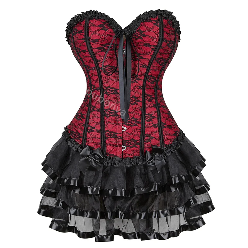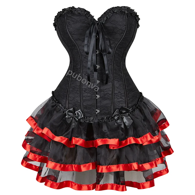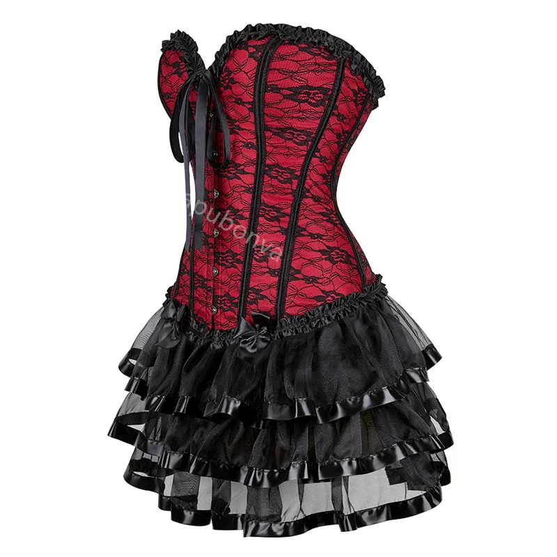Red Corset Dress Tutu Skrits Set Overbust With Lace Costume Party Sexy Burlesque Ladies Basques Outfit Plus Size Gothic Black