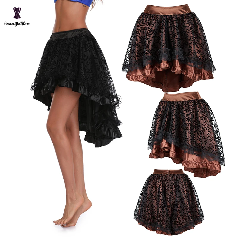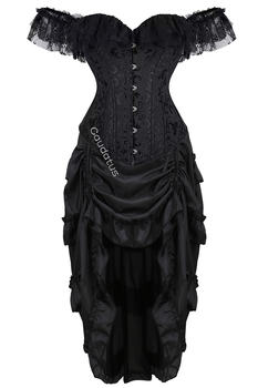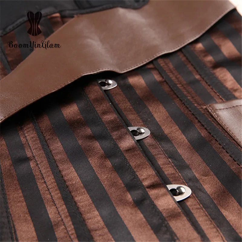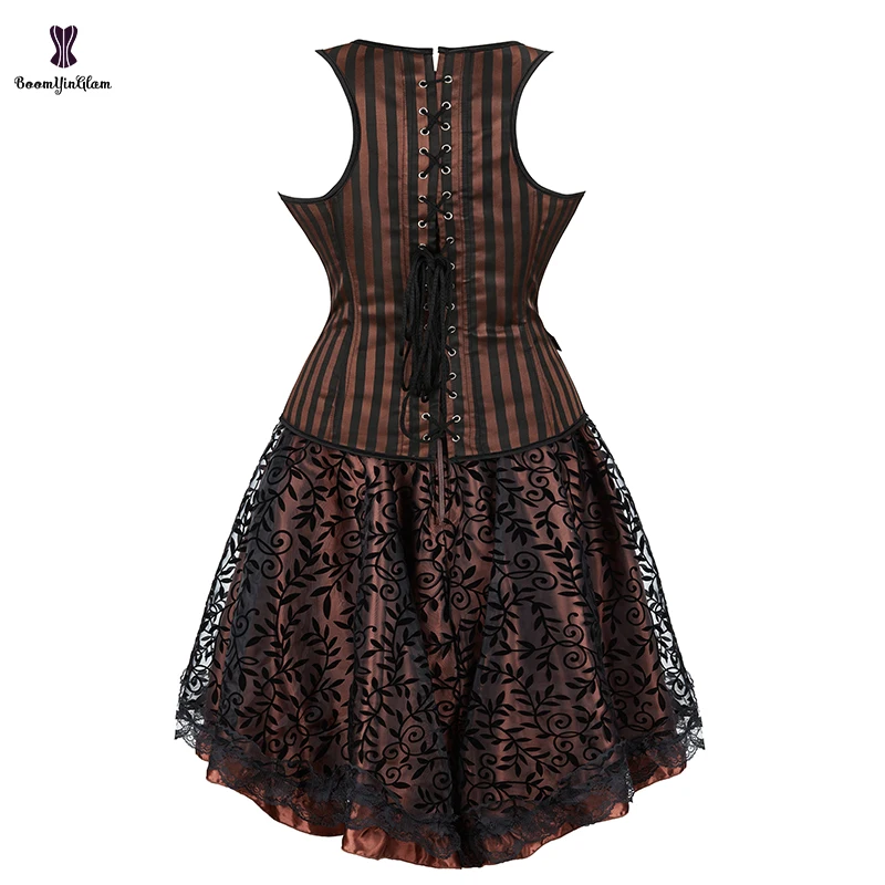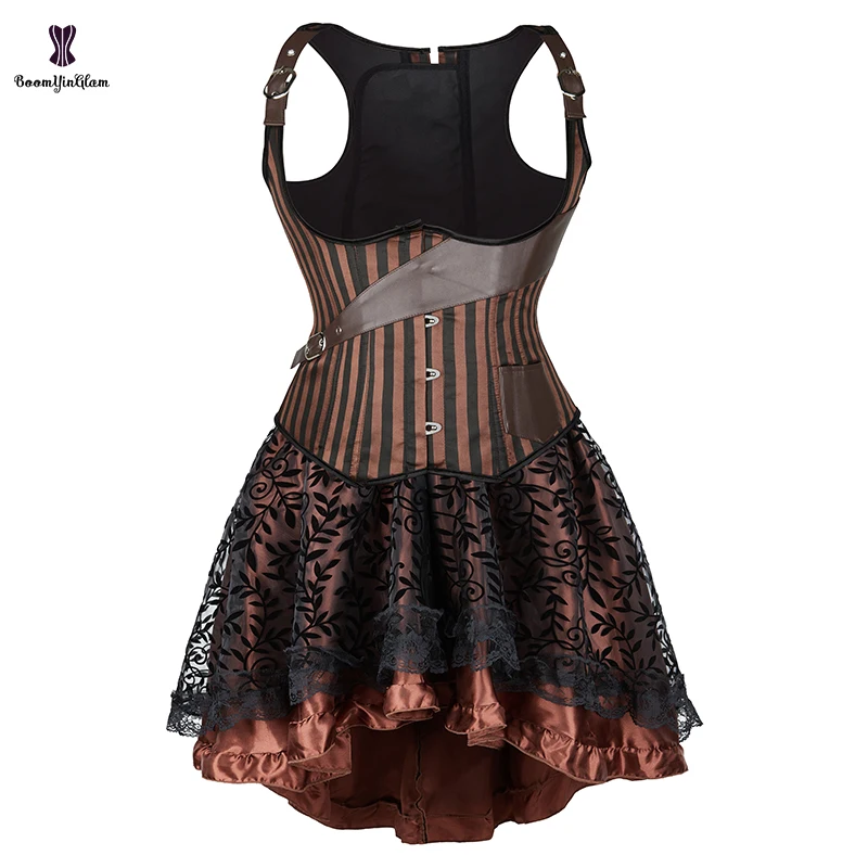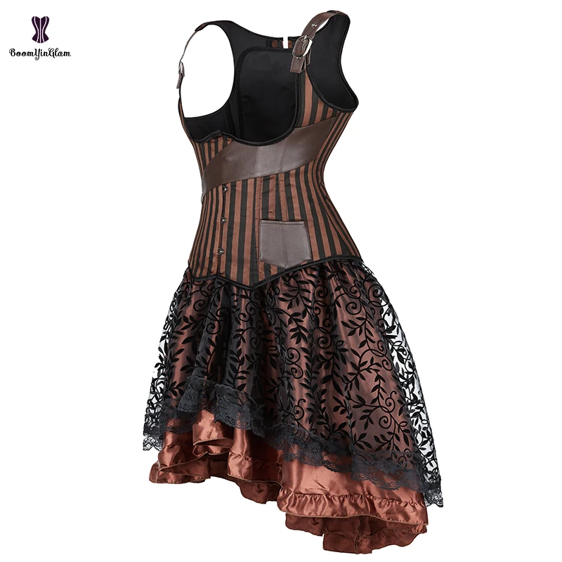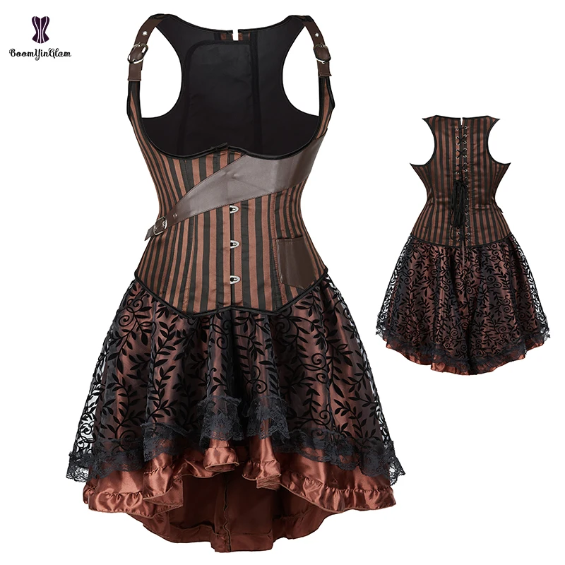 Removable Strap Korset Dress Suit Two Pieces One Set Brown Punk Style Vest Steel Boned Corset Top With Gothic Skirt For Women
