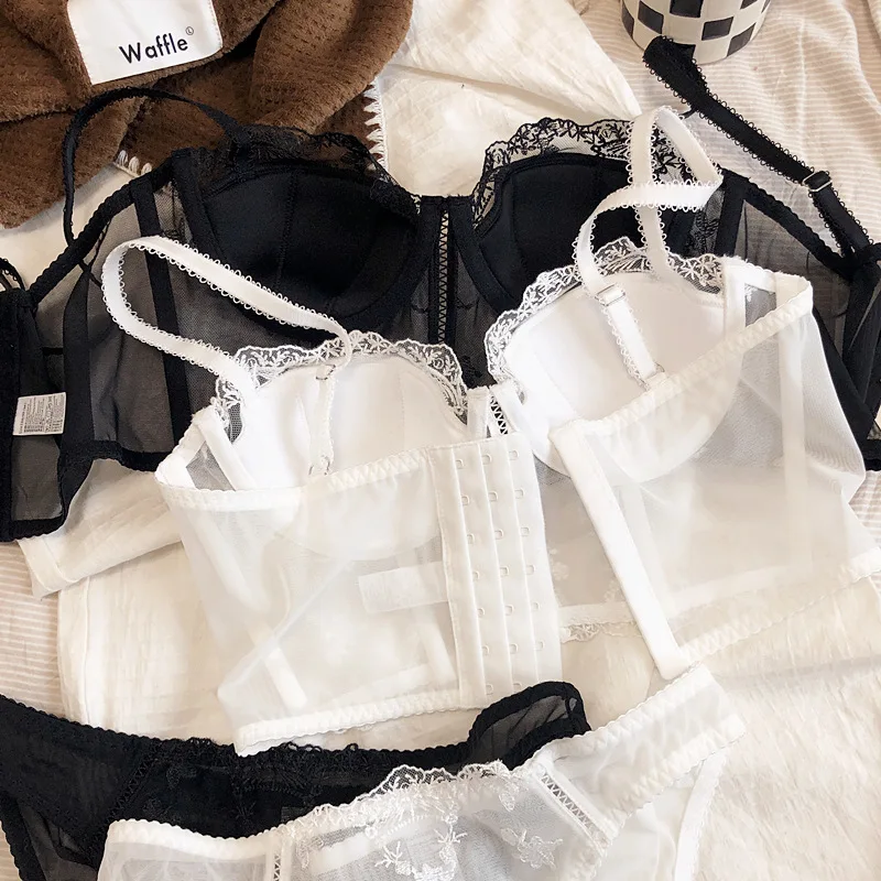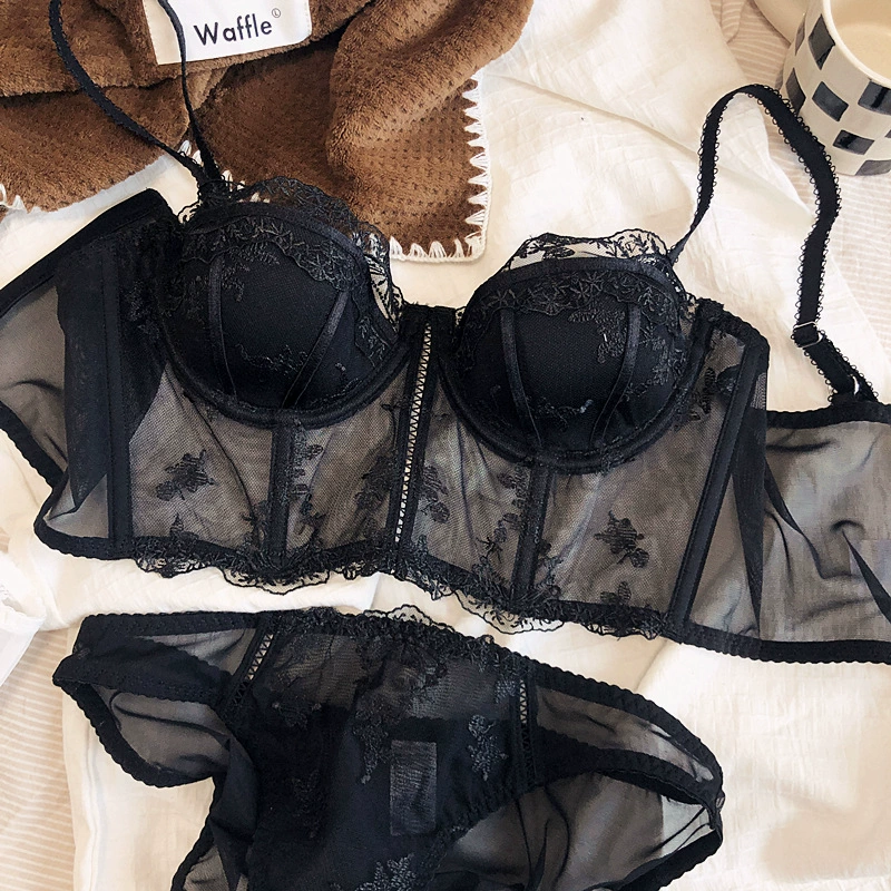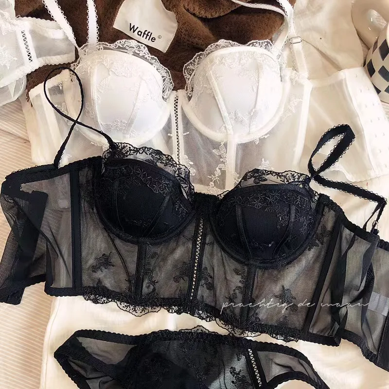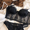 Retro Half Cup Lingerie Embroidered Lace Long Bra Panty Set Sexy Body Sculpting Push Up Top Vest Underwear