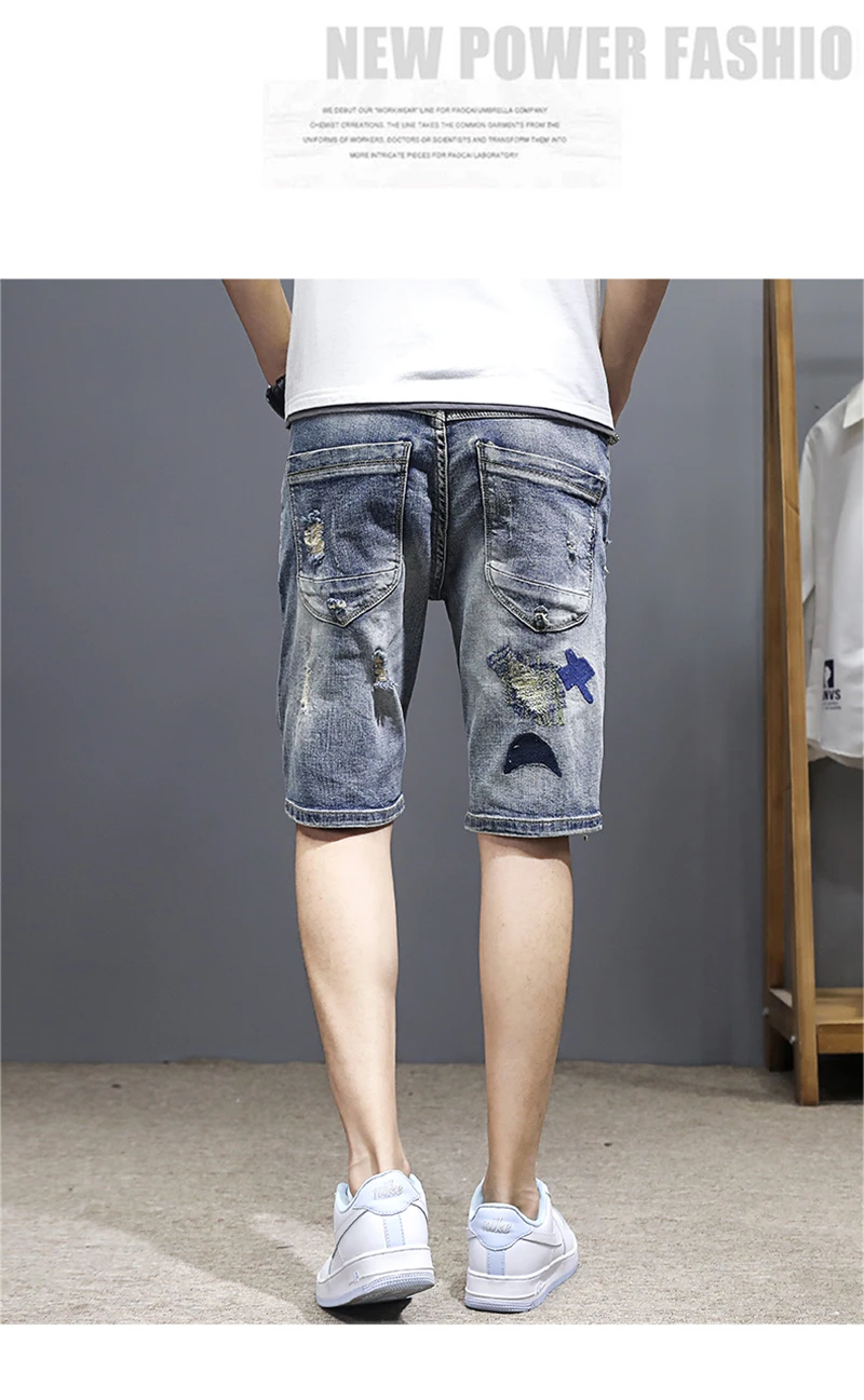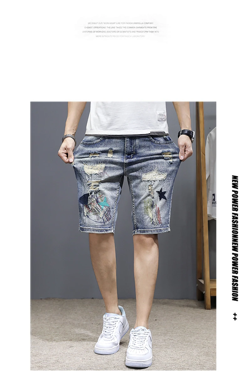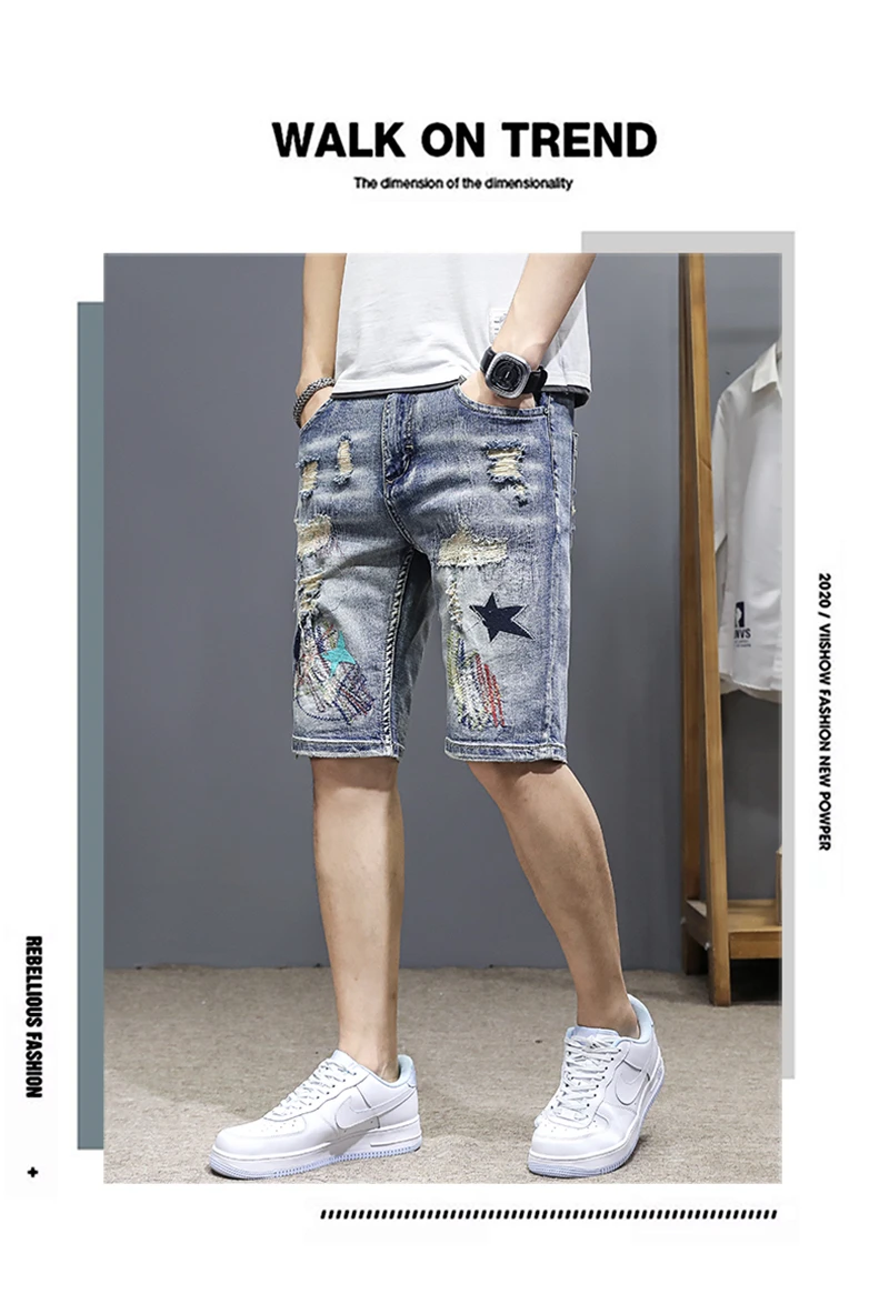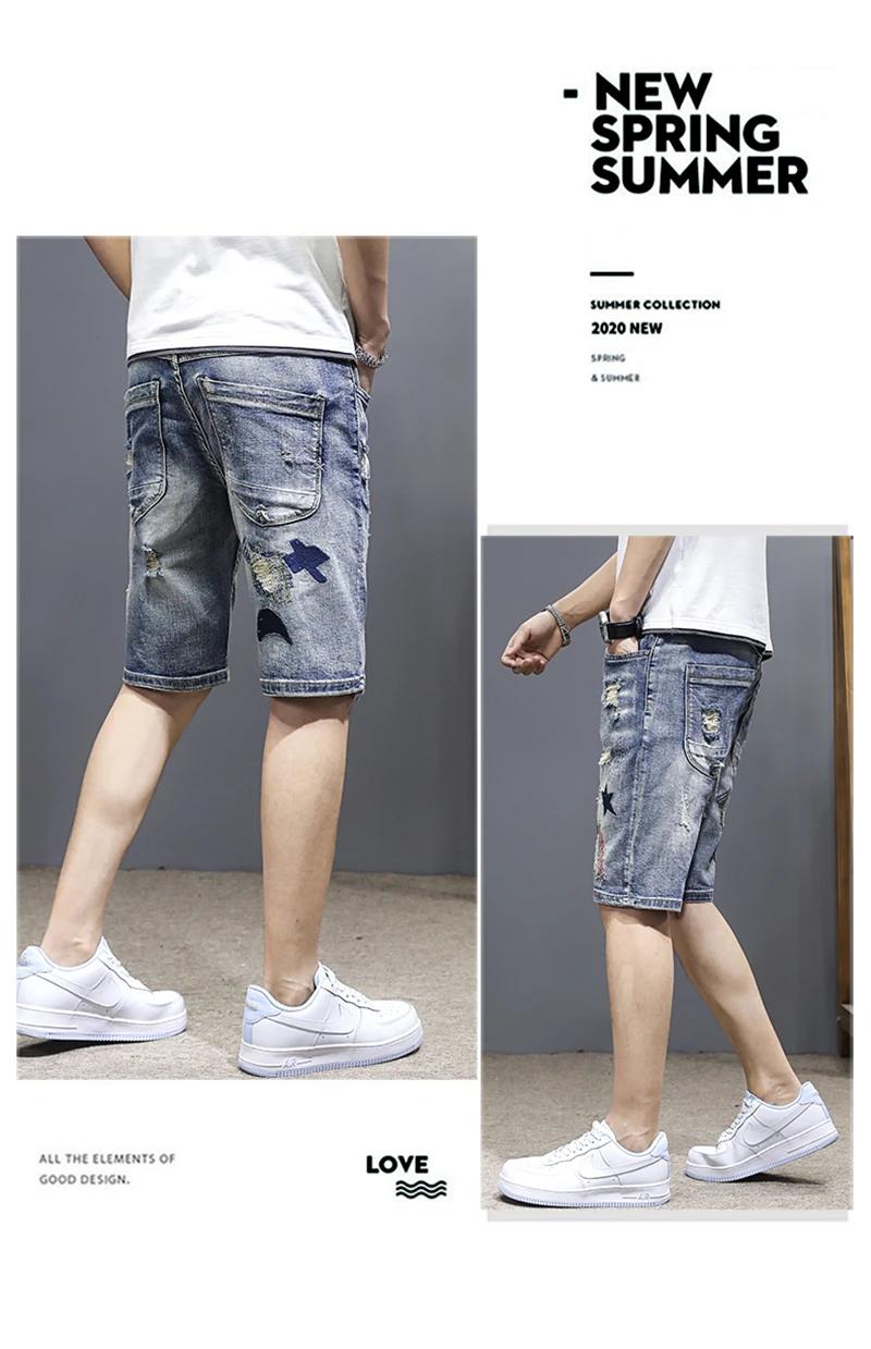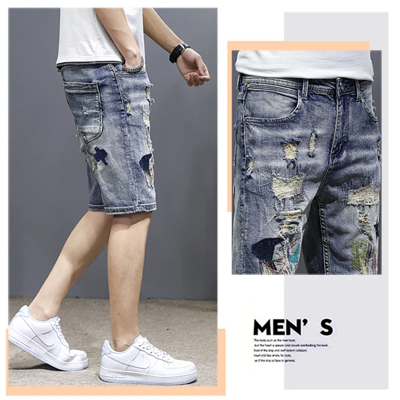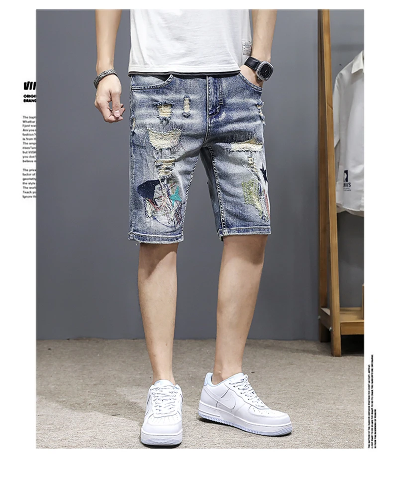 Retro Men’s Ripped Jeans Shorts Summer Thin Fashion Slim Embroidery Hole Beggar Pants High Street Knee Length Short Jeans Male