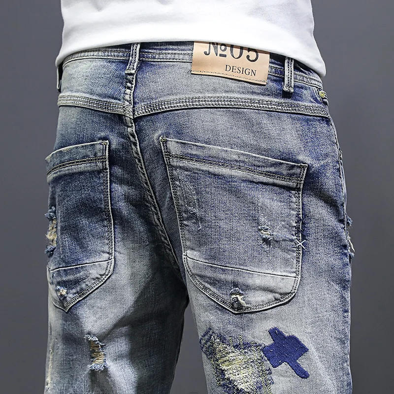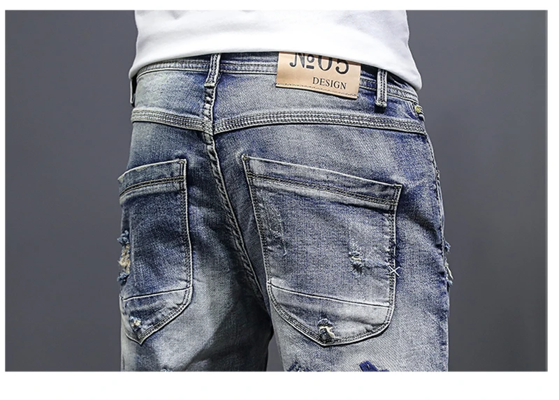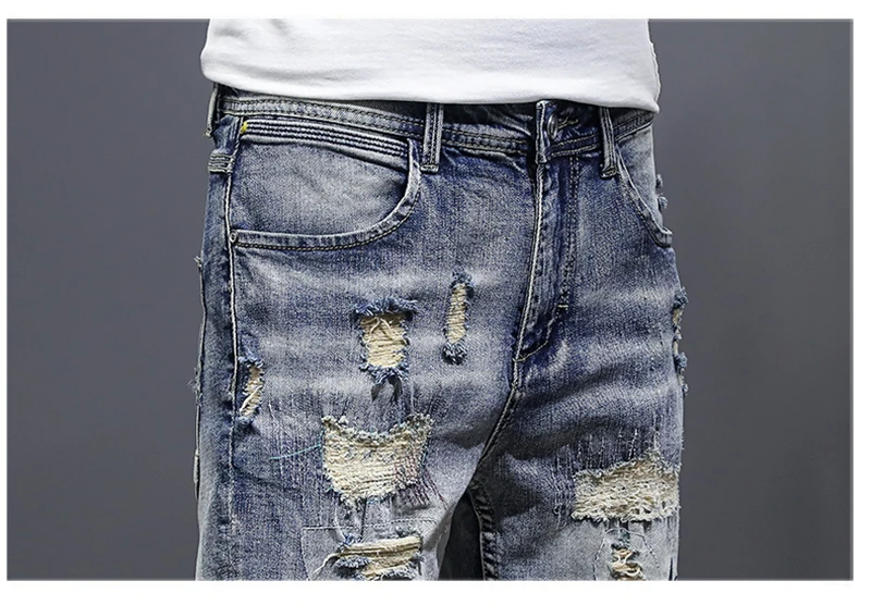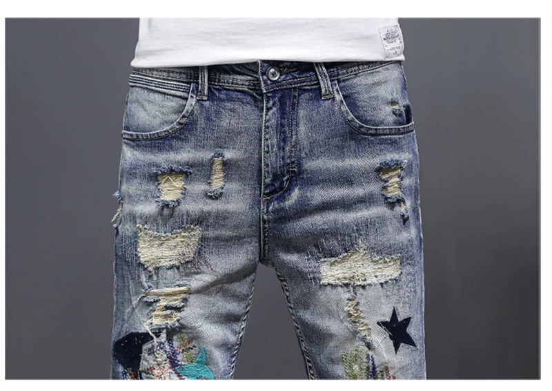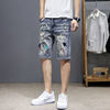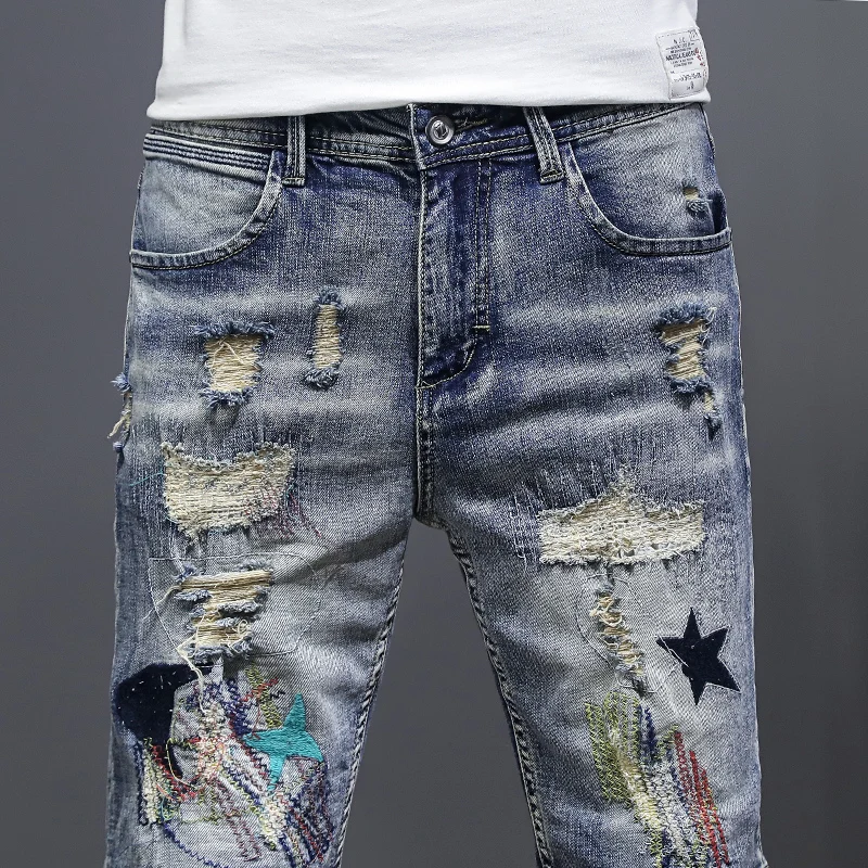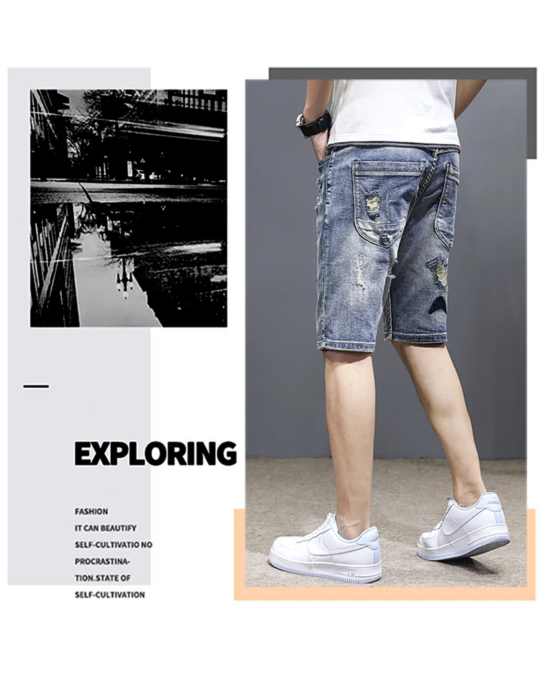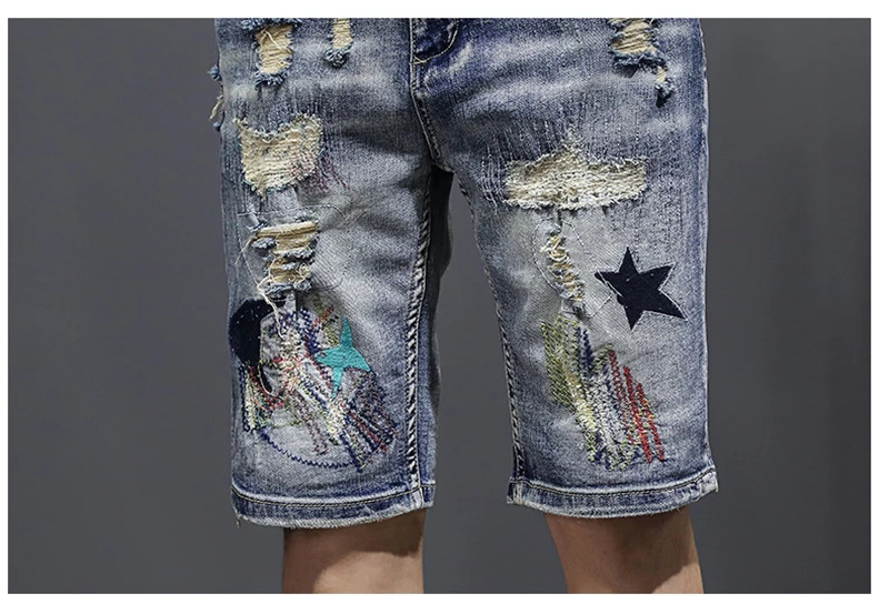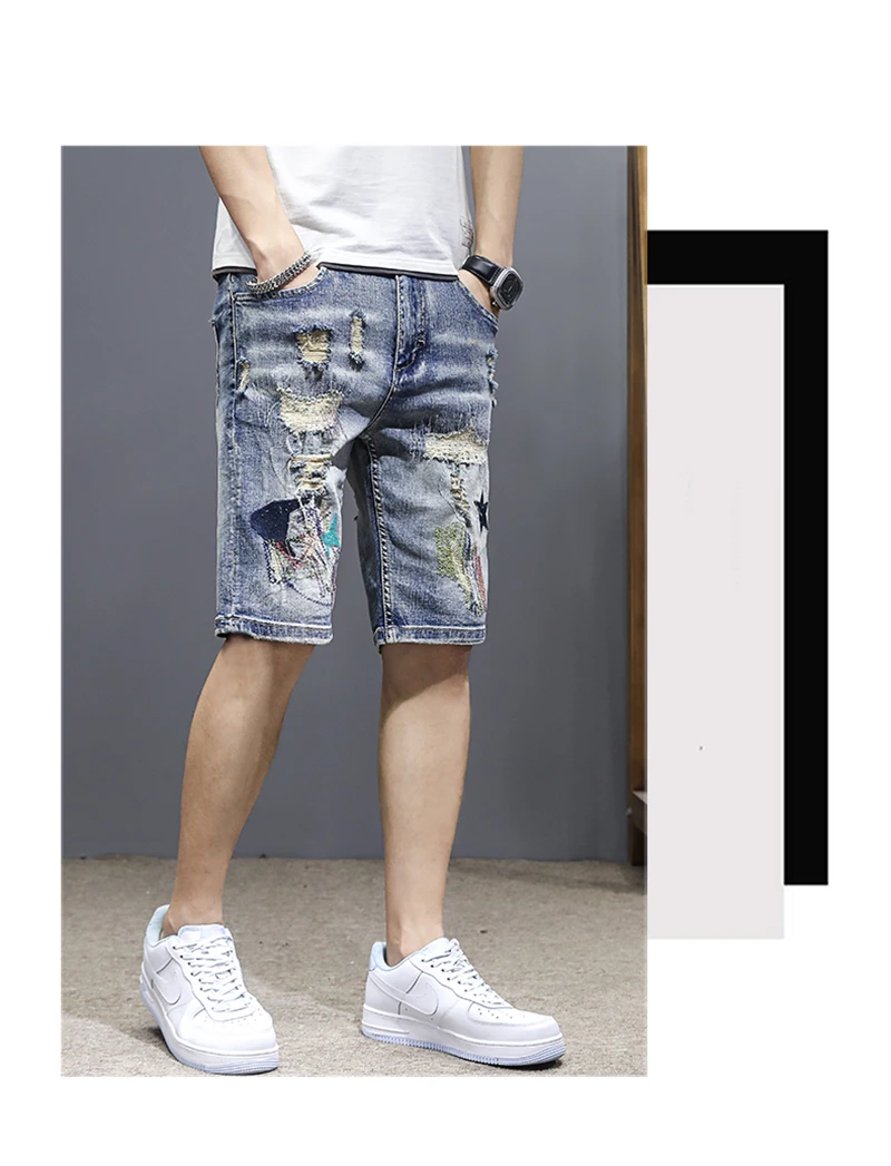 Retro Men’s Ripped Jeans Shorts Summer Thin Fashion Slim Embroidery Hole Beggar Pants High Street Knee Length Short Jeans Male