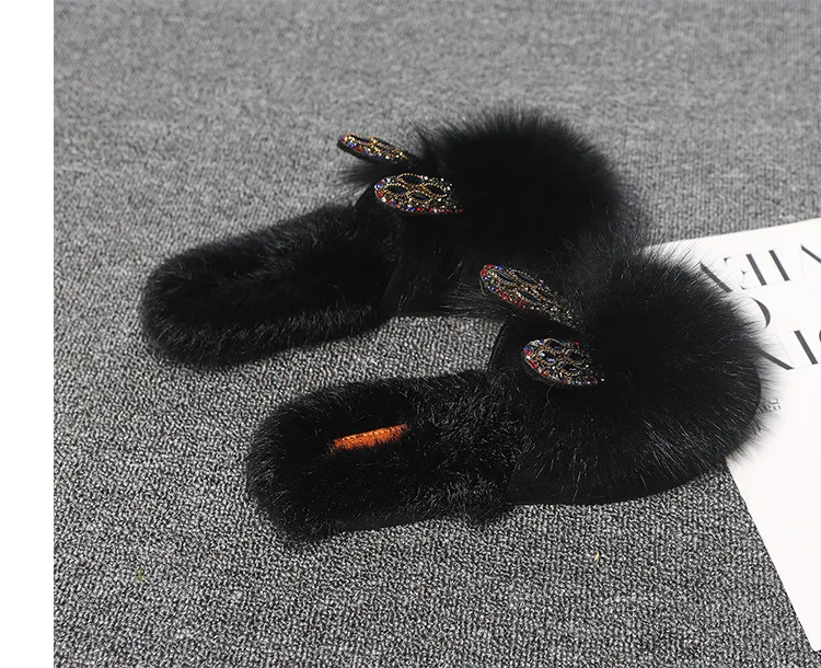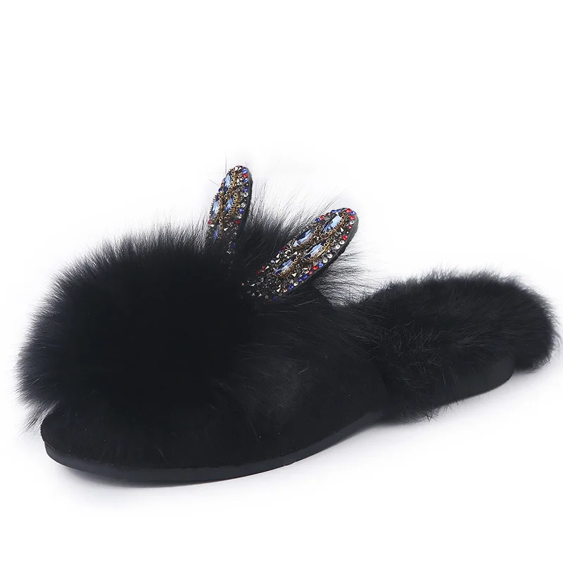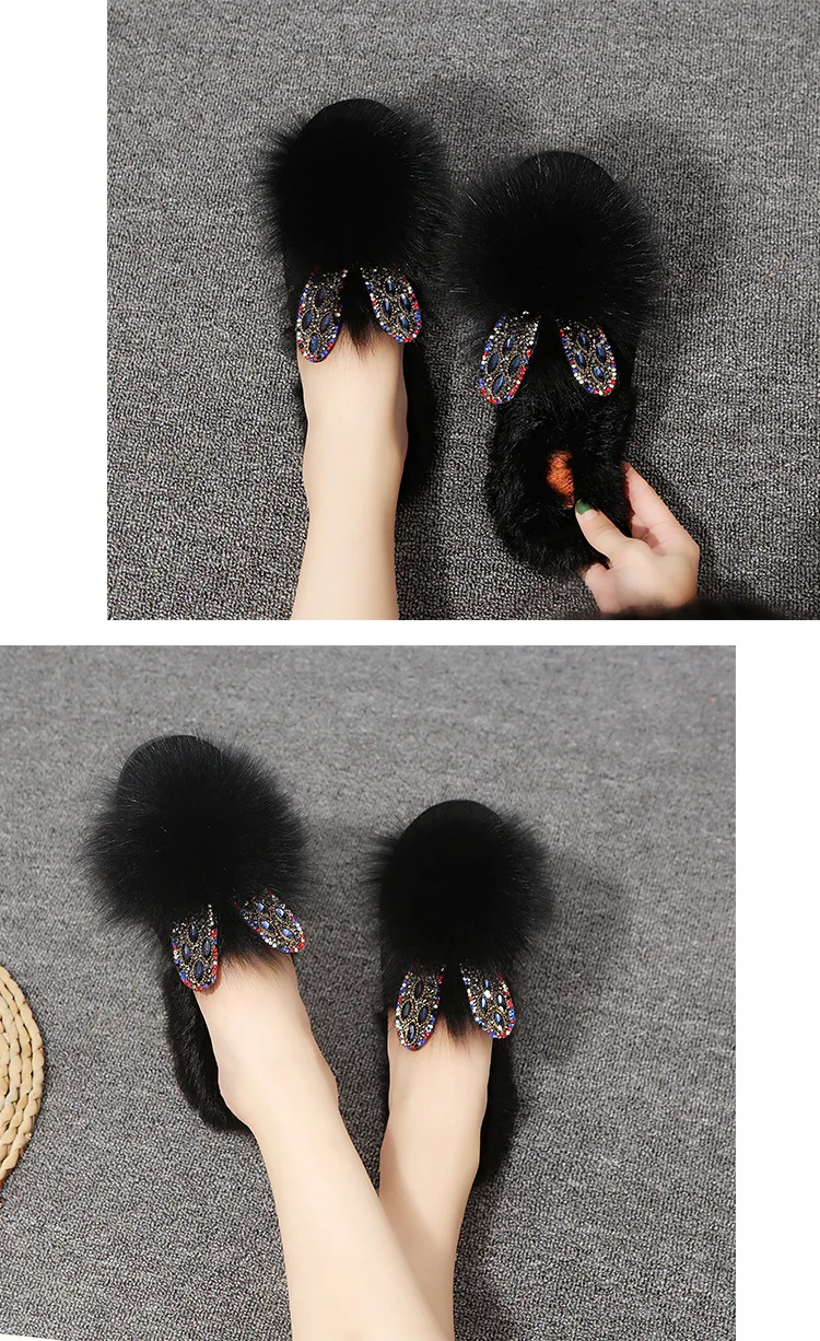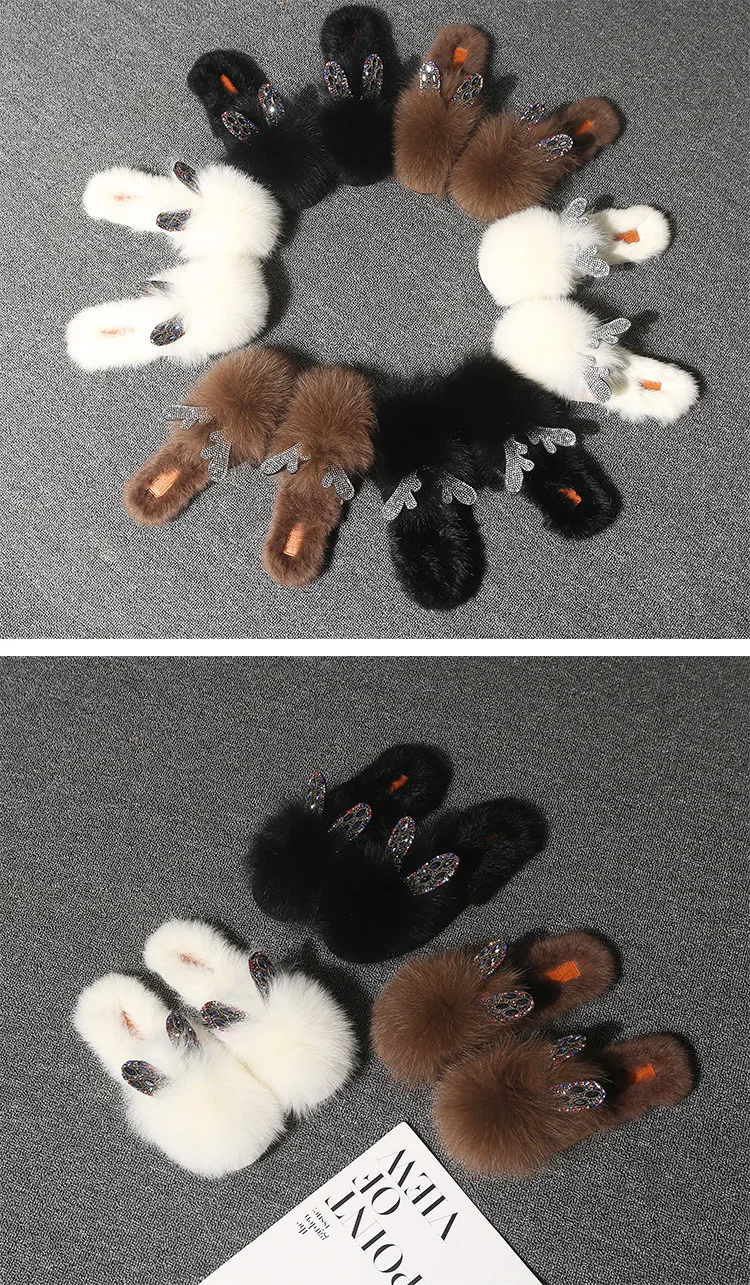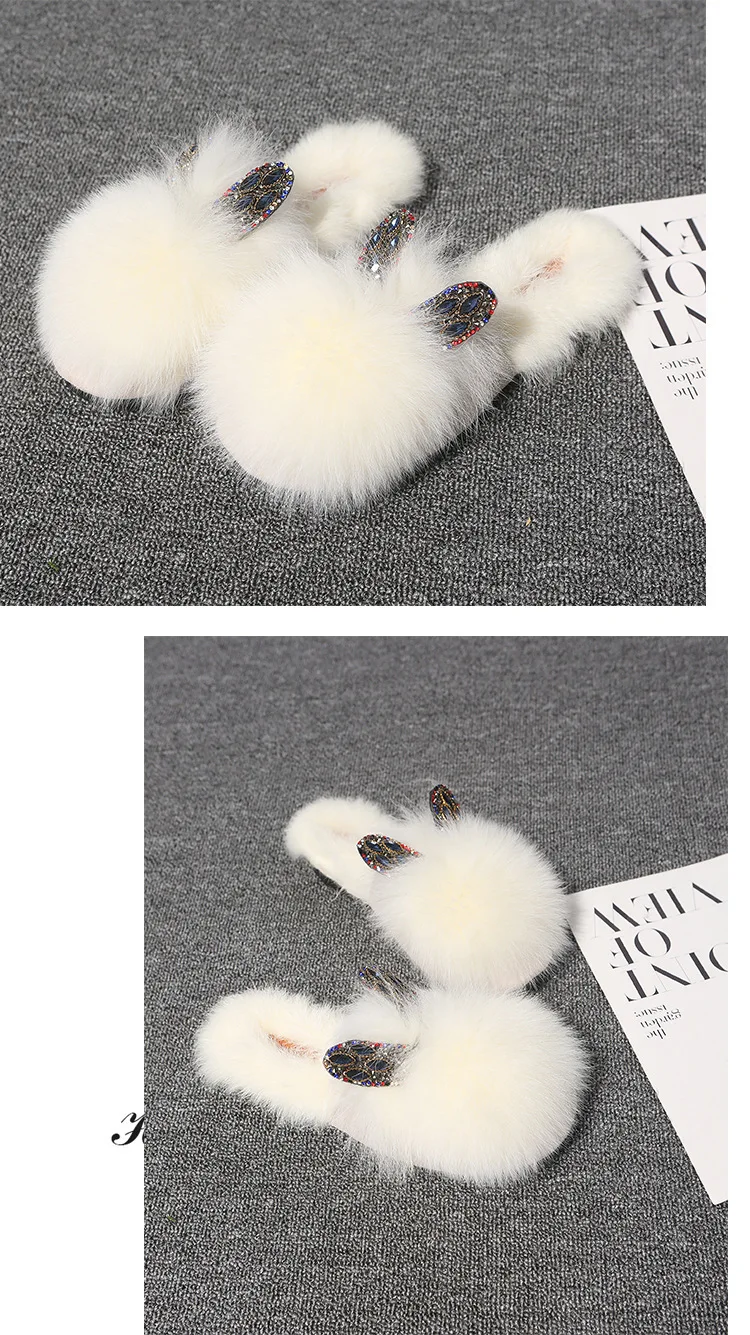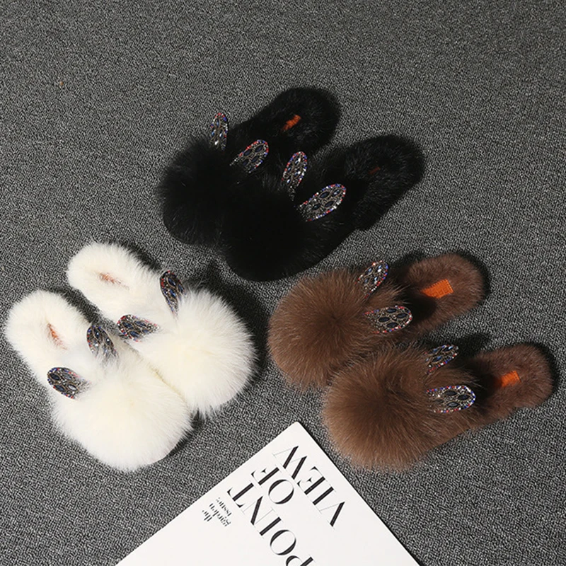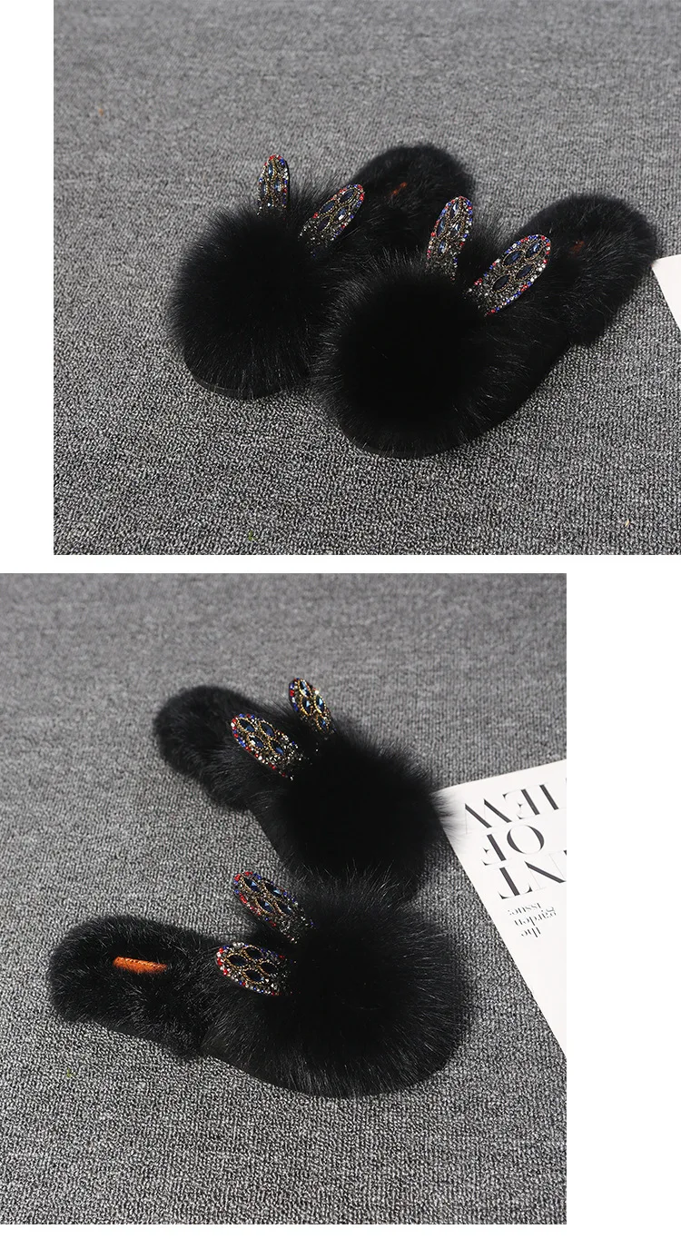 2020 New Arrived Rabbits Rhinestone Ears Fur Slippers Indoor Ladies Shoes