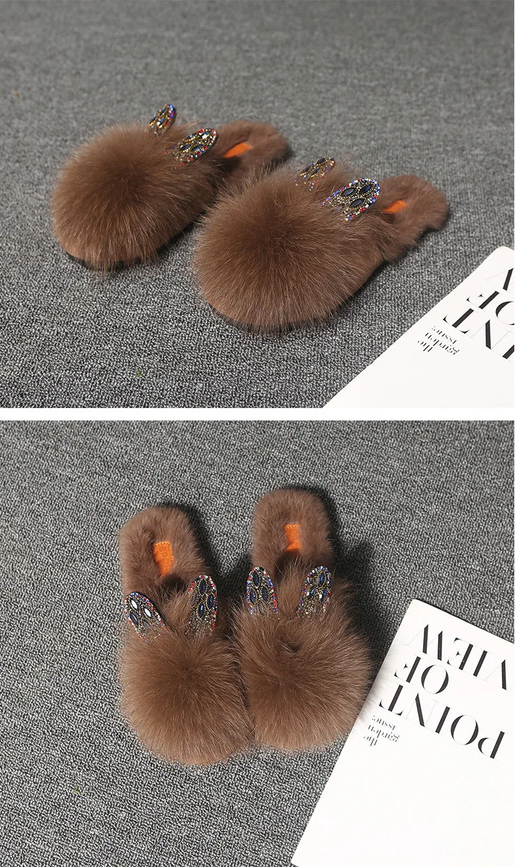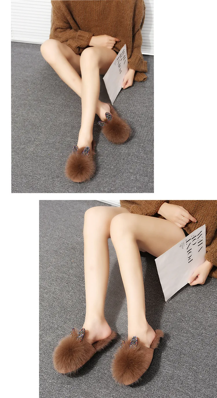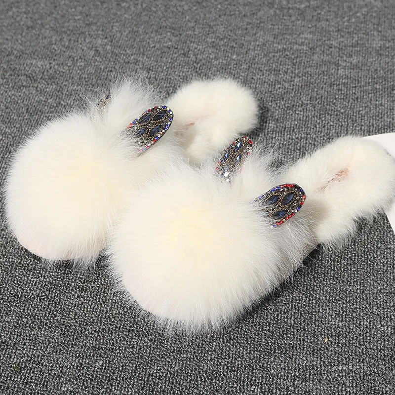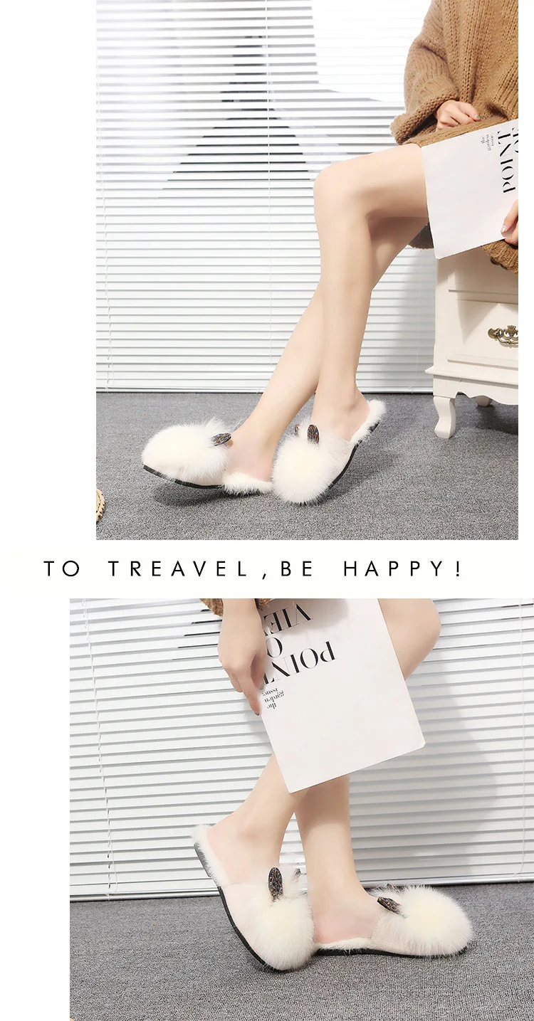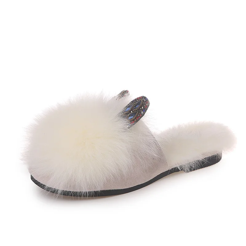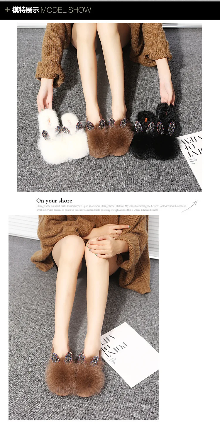 2020 New Arrived Rabbits Rhinestone Ears Fur Slippers Indoor Ladies Shoes
