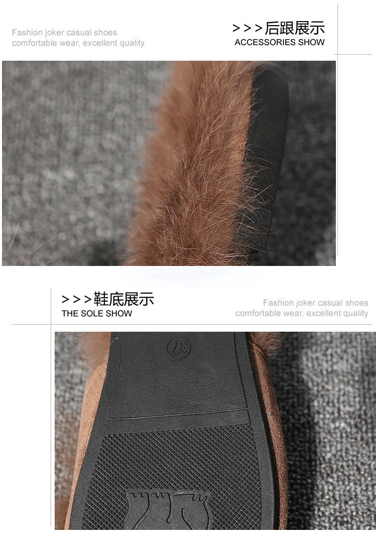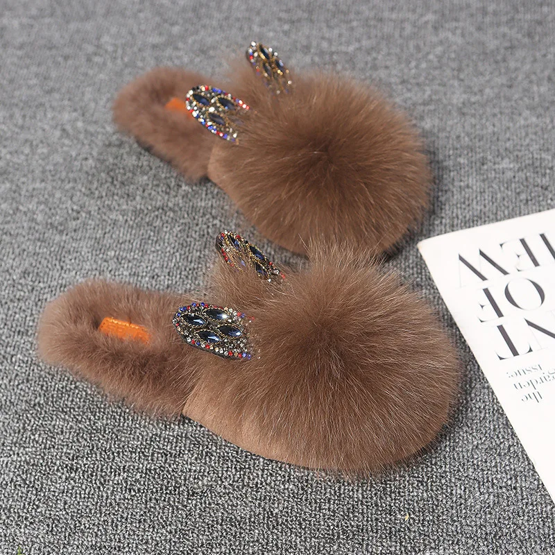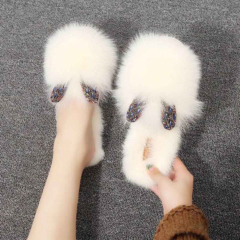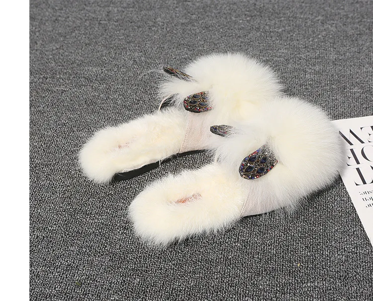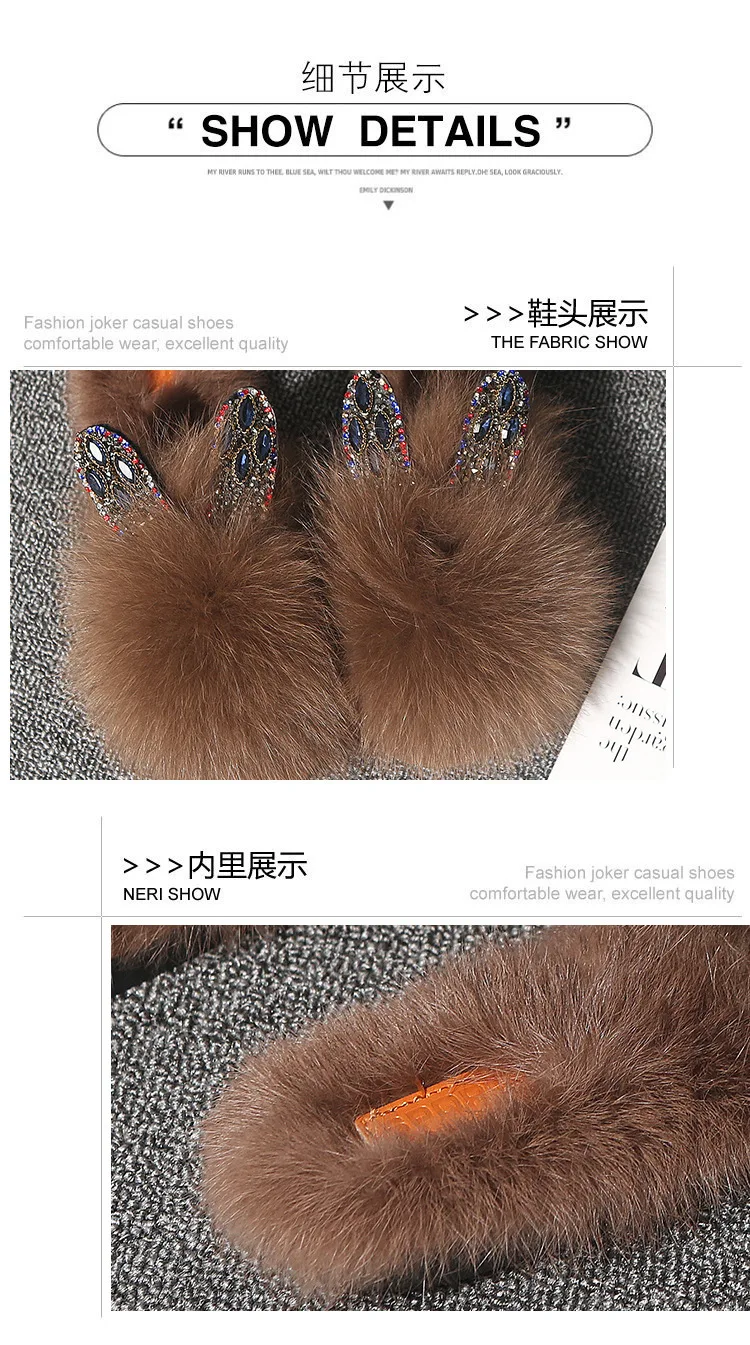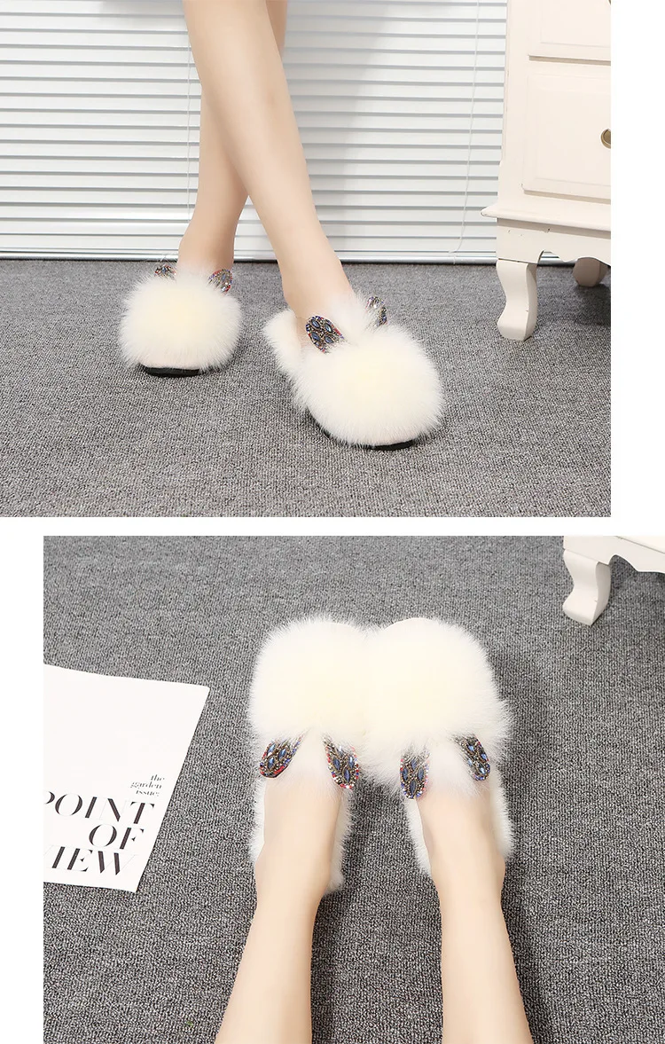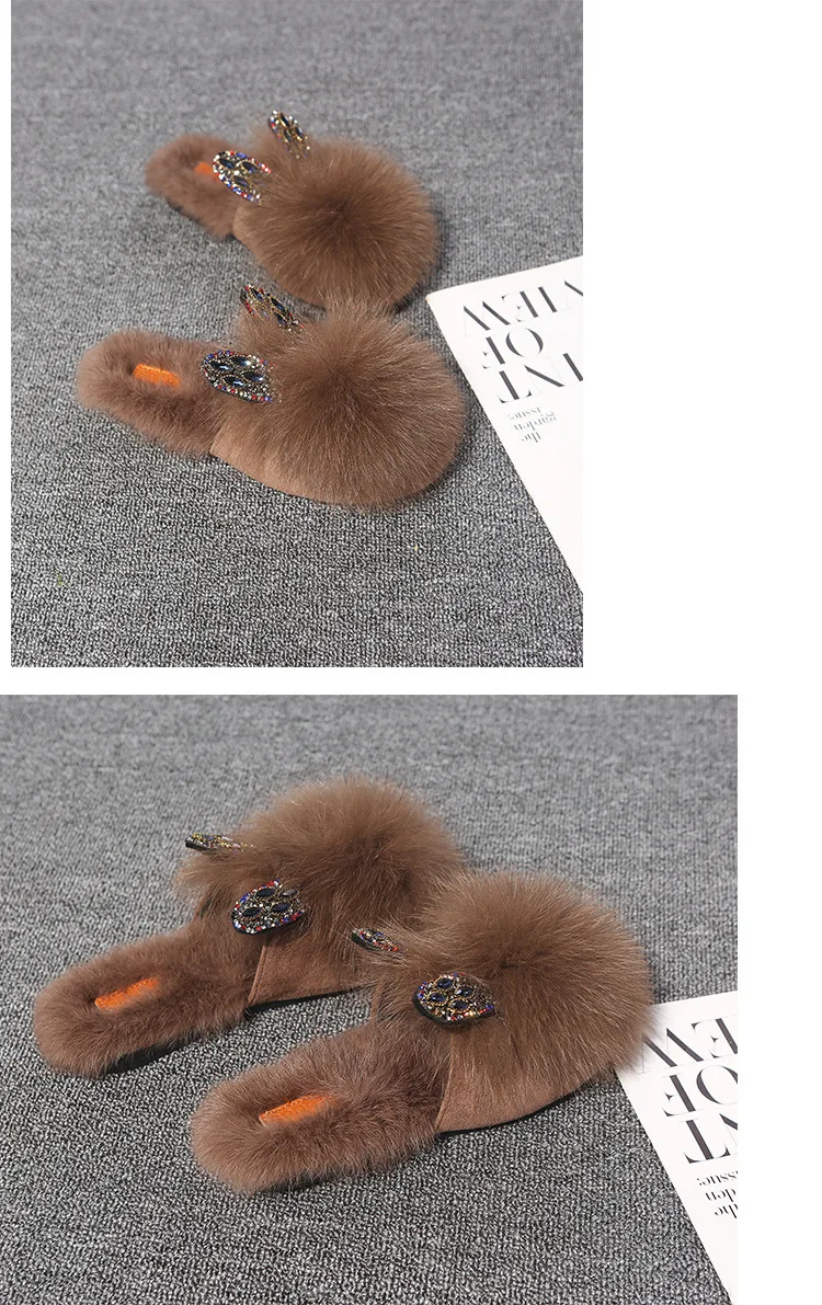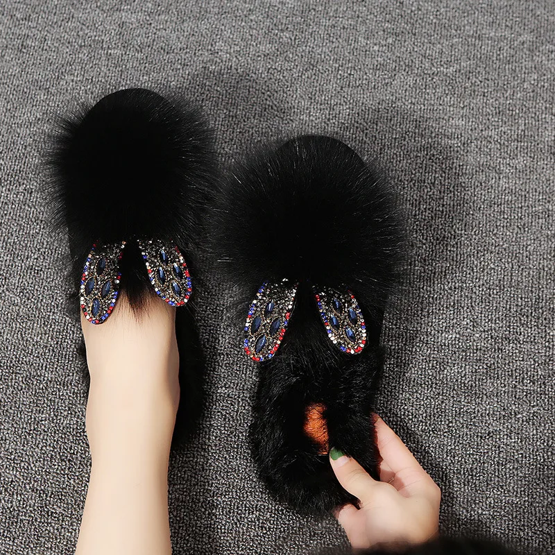 2020 New Arrived Rabbits Rhinestone Ears Fur Slippers Indoor Ladies Shoes