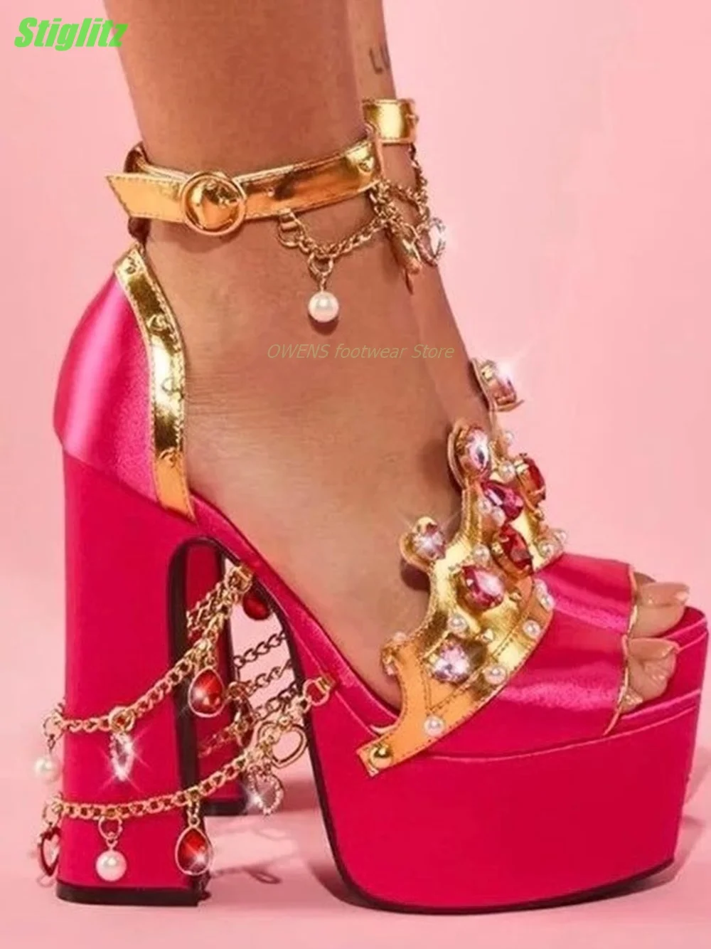 Product Name: Rhinestone Plantform Luxury Sandals Mixed Color Pink Shoes Party Satin Women Shoes Square Heel Round Toe Gorgeous 2023 Fashion