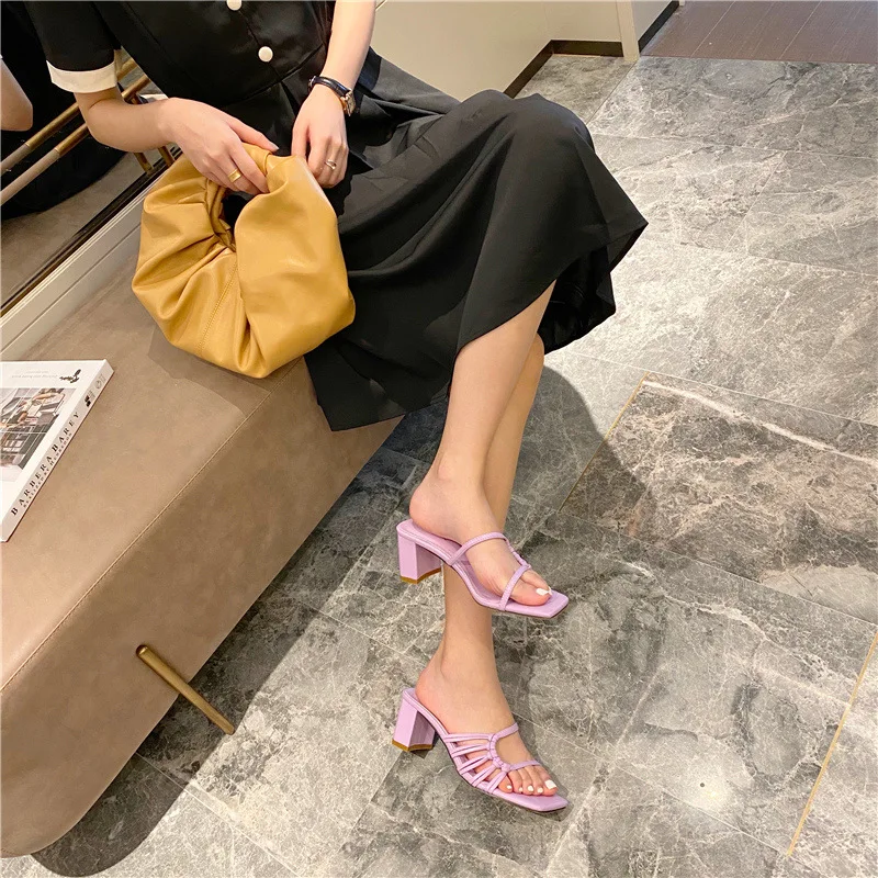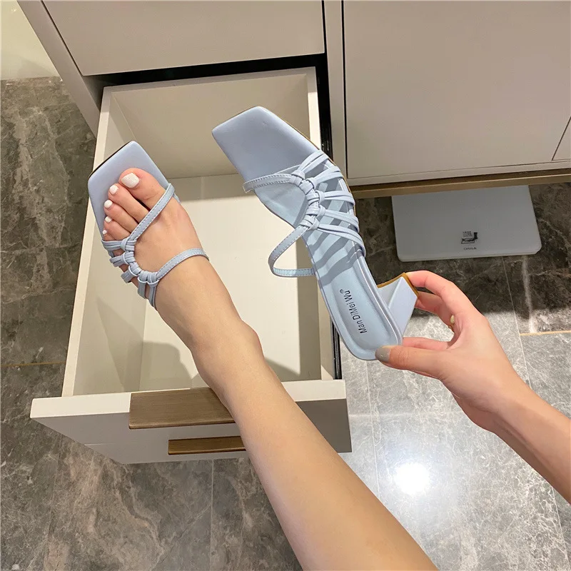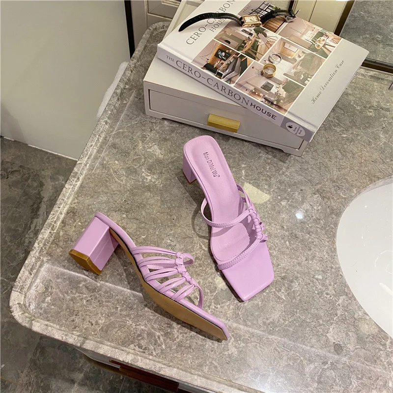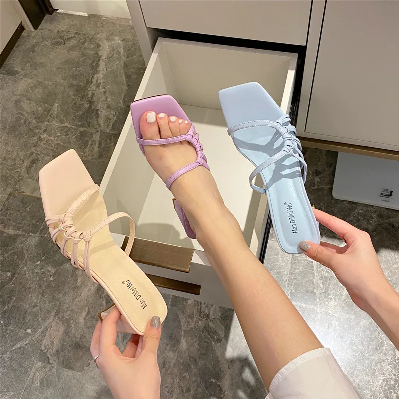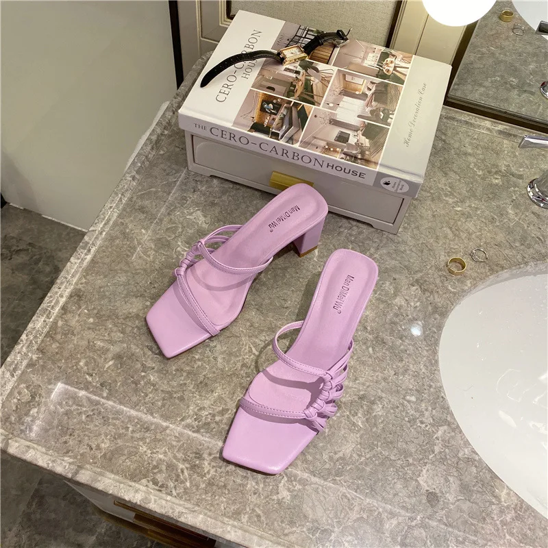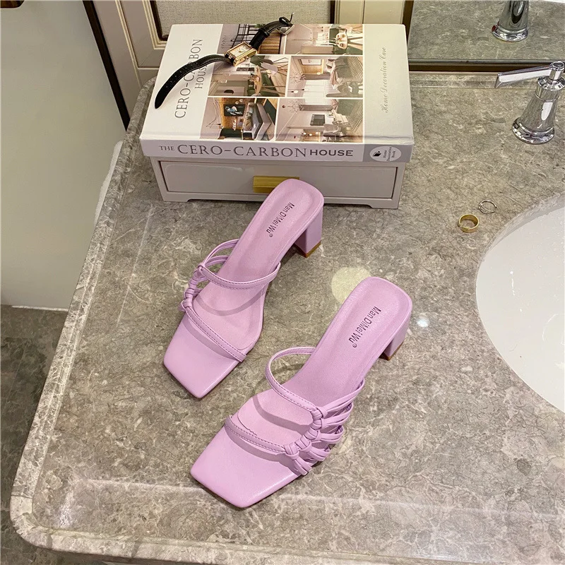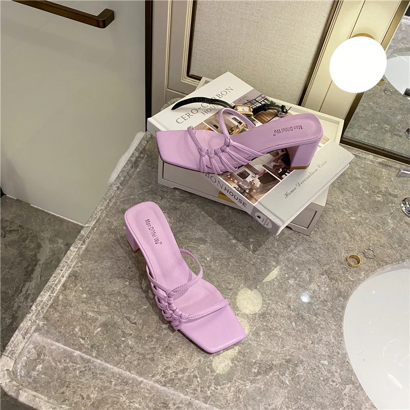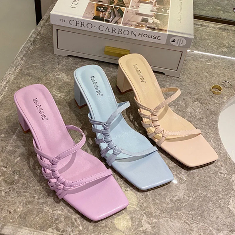 Rome Weave slippers women sandals fresh candy shoes woman flip flops open toe thick med heels pantuflas narrow band slides 2021