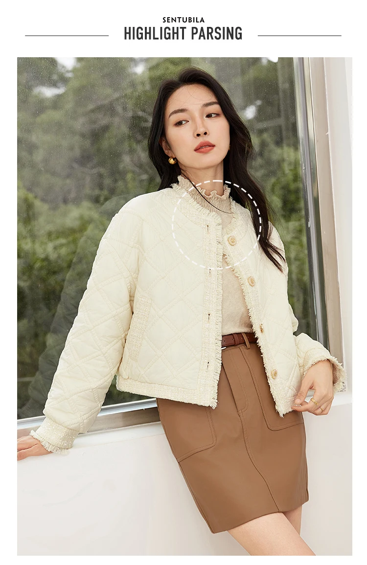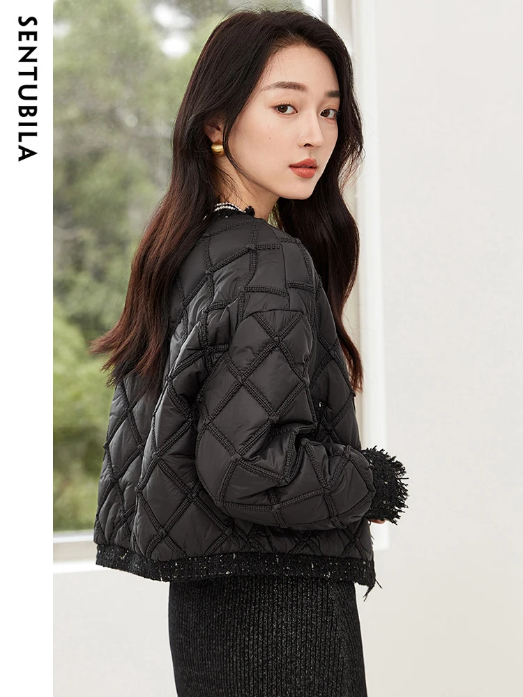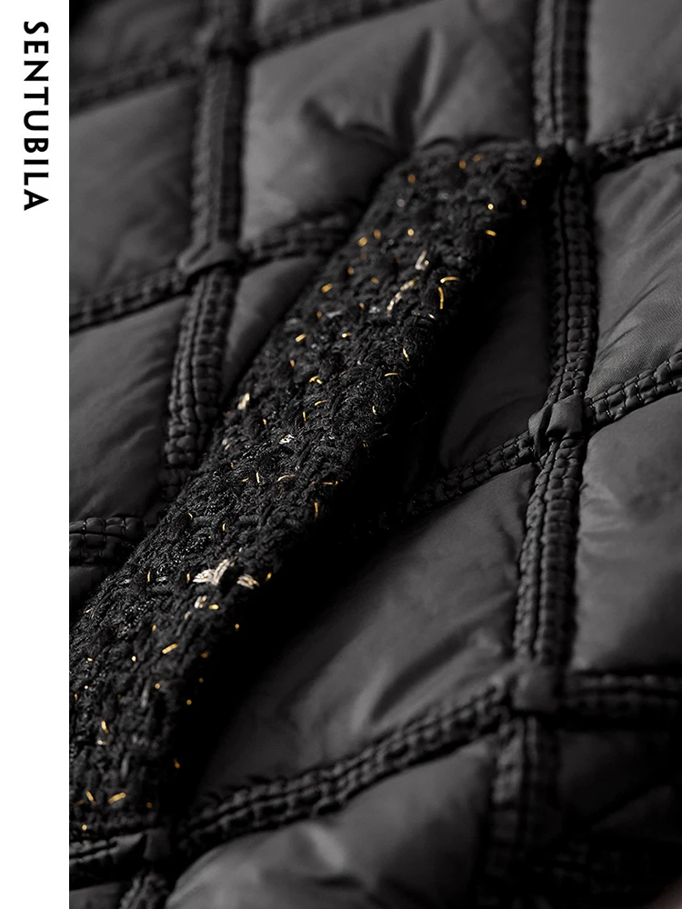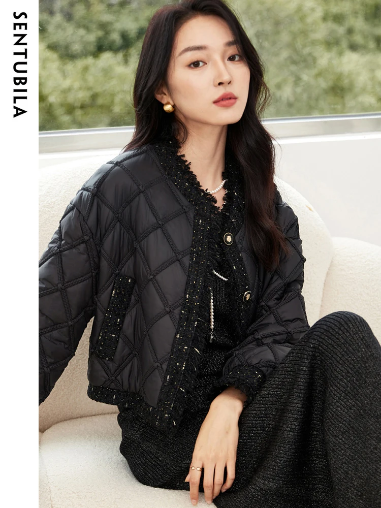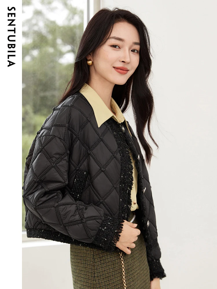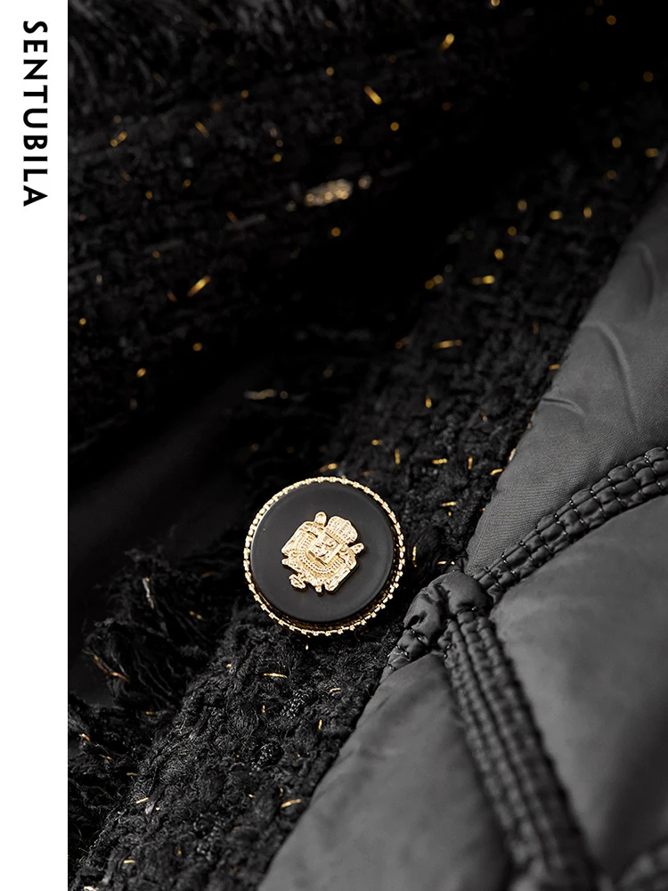 SENTUBILA Winter Tassel Black Parkas Jackets for Women 2024 Patchwork Crop Cotton Padded Jacket Button Warm Outwear W34M51352
