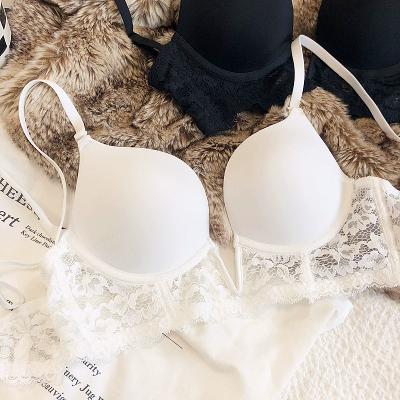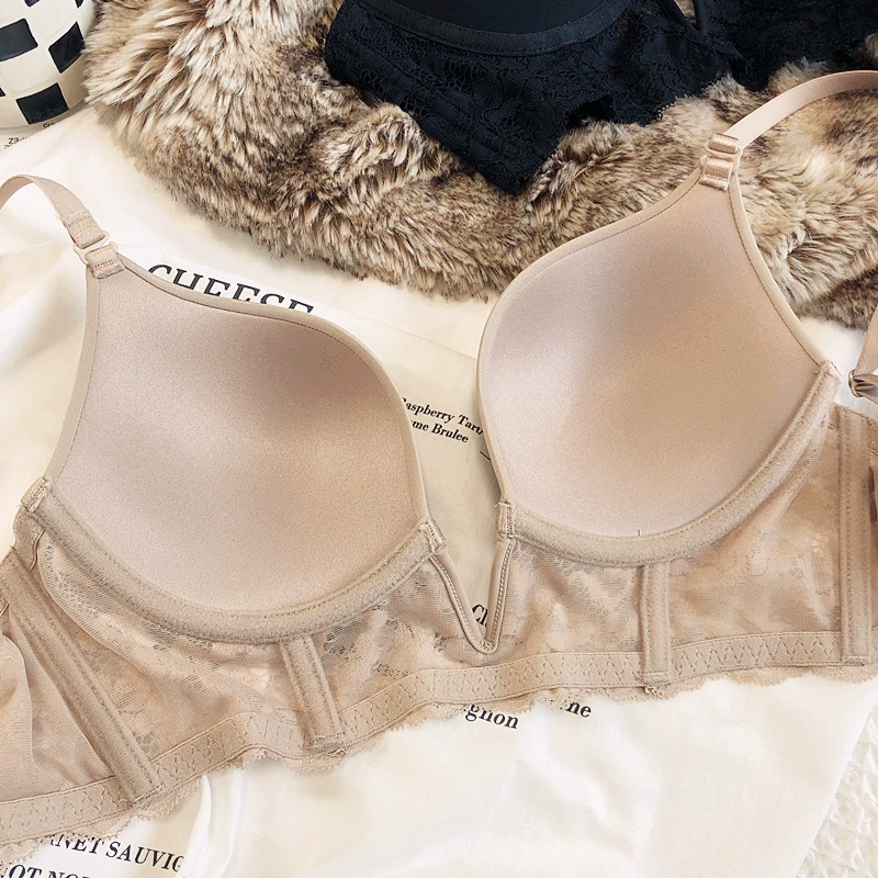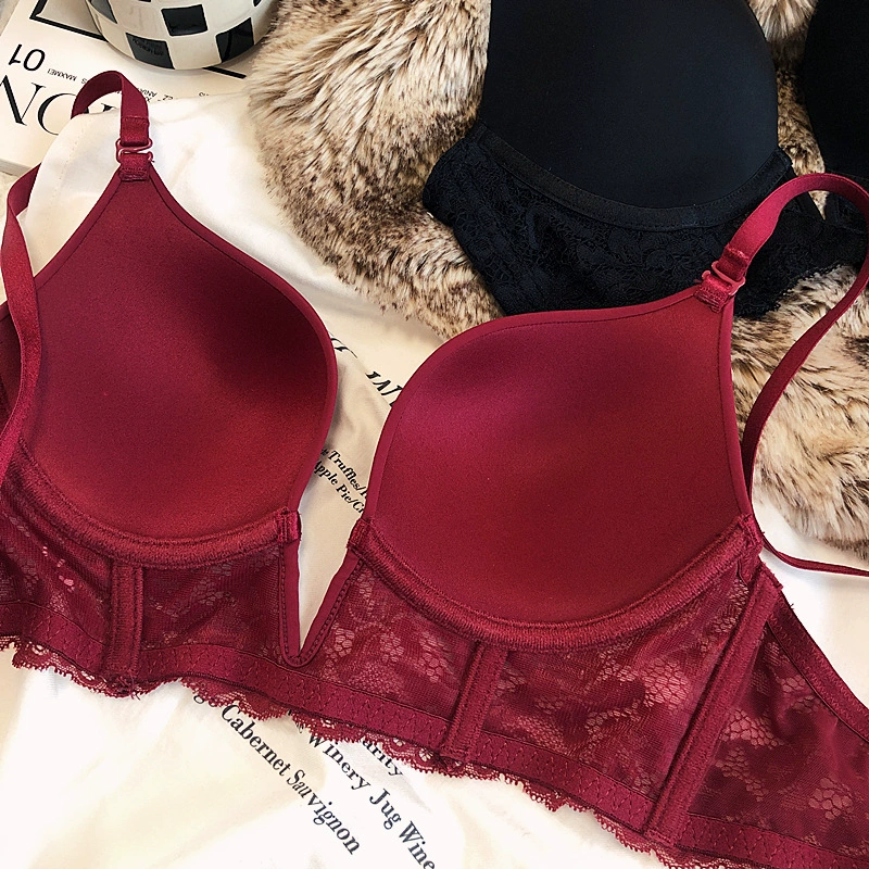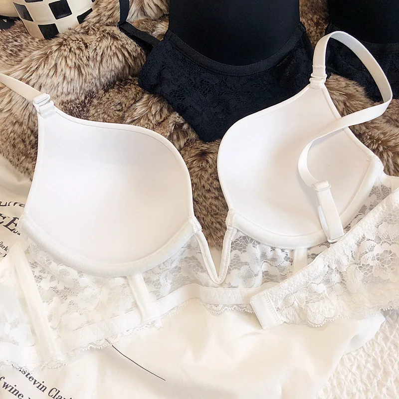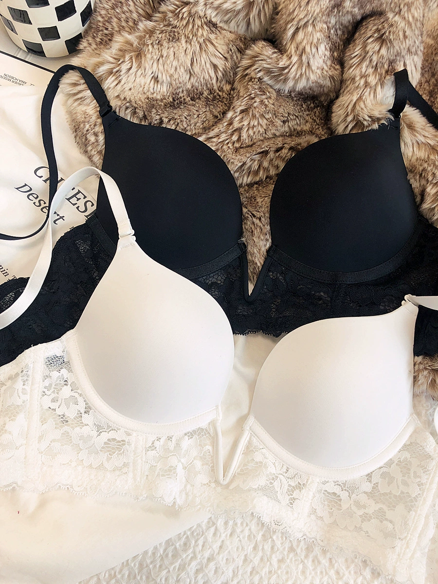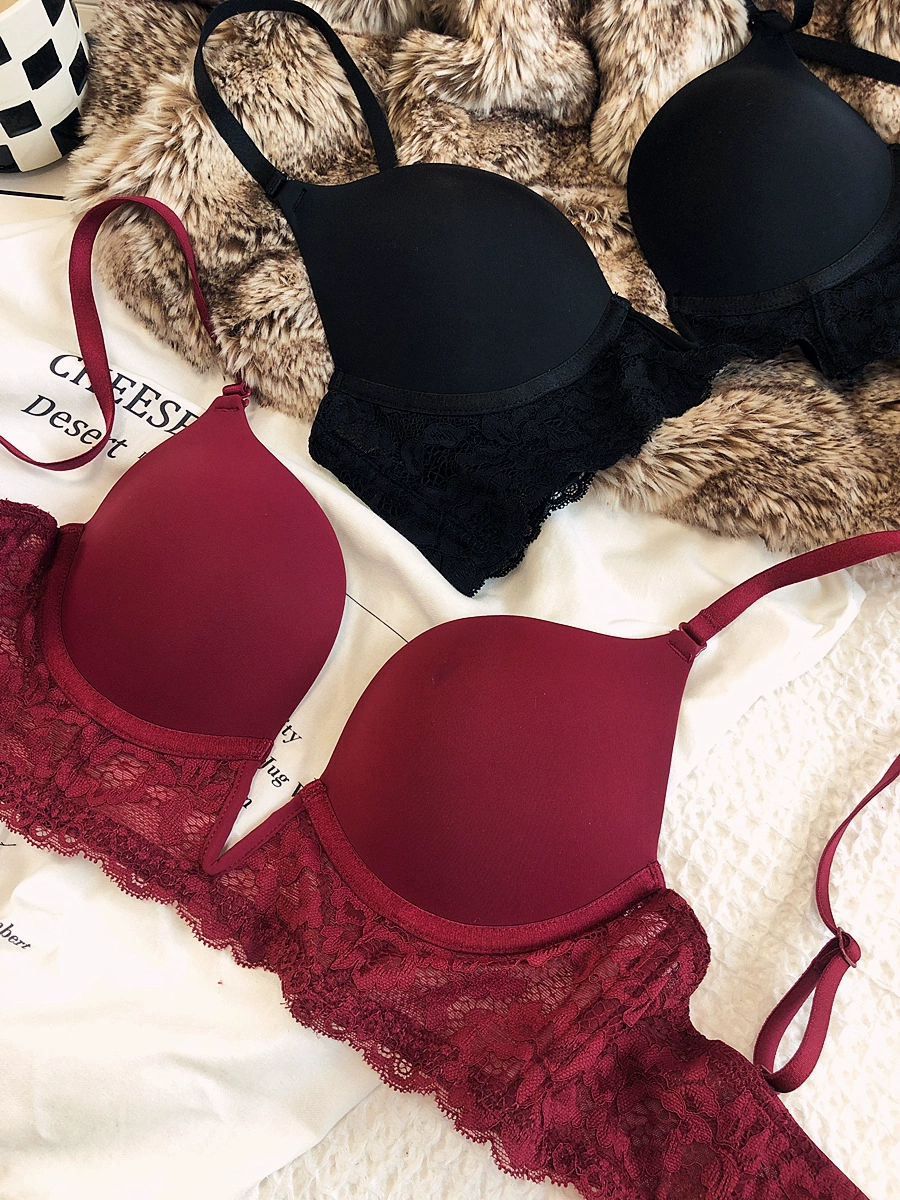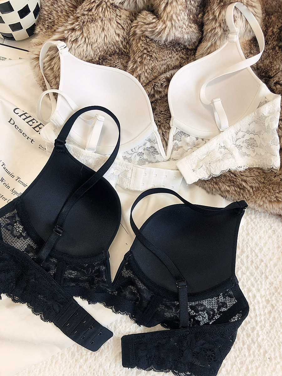 Sexy deep V seamless underwear sets thin gather soft steel ring lingerie panty suit anti-sagging lace bra glossy basic bralette