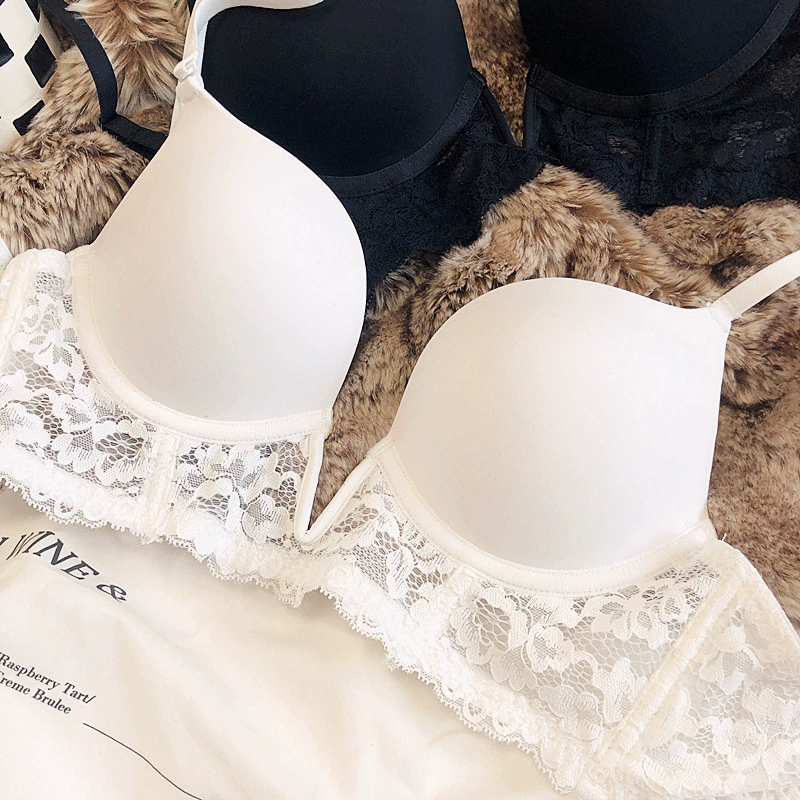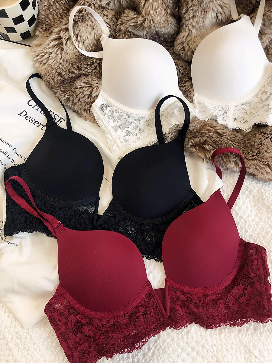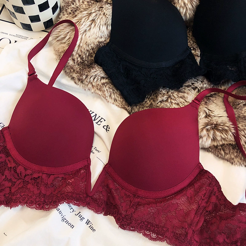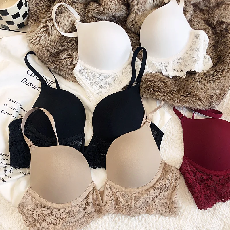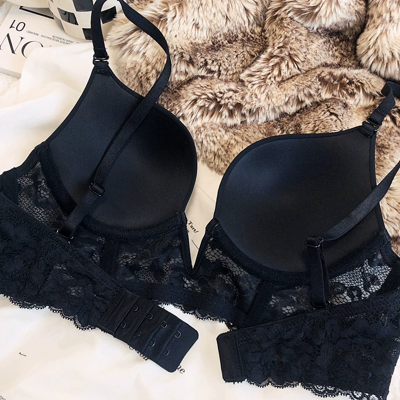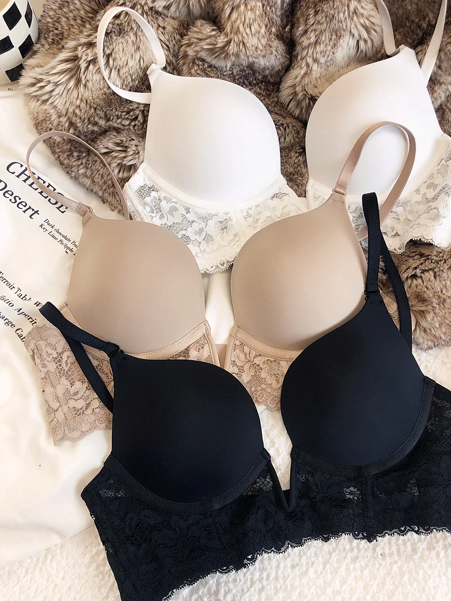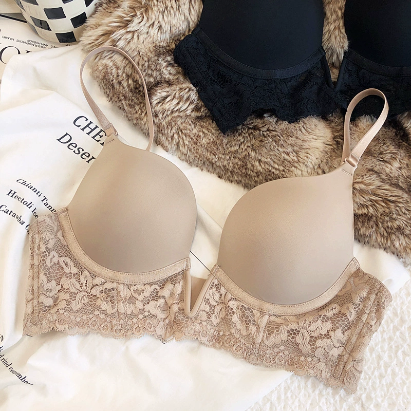 Sexy deep V seamless underwear sets thin gather soft steel ring lingerie panty suit anti-sagging lace bra glossy basic bralette