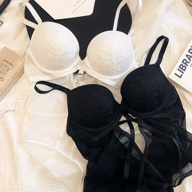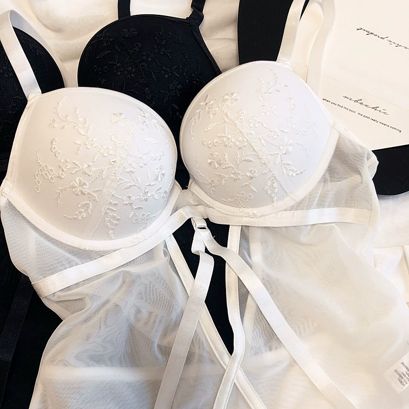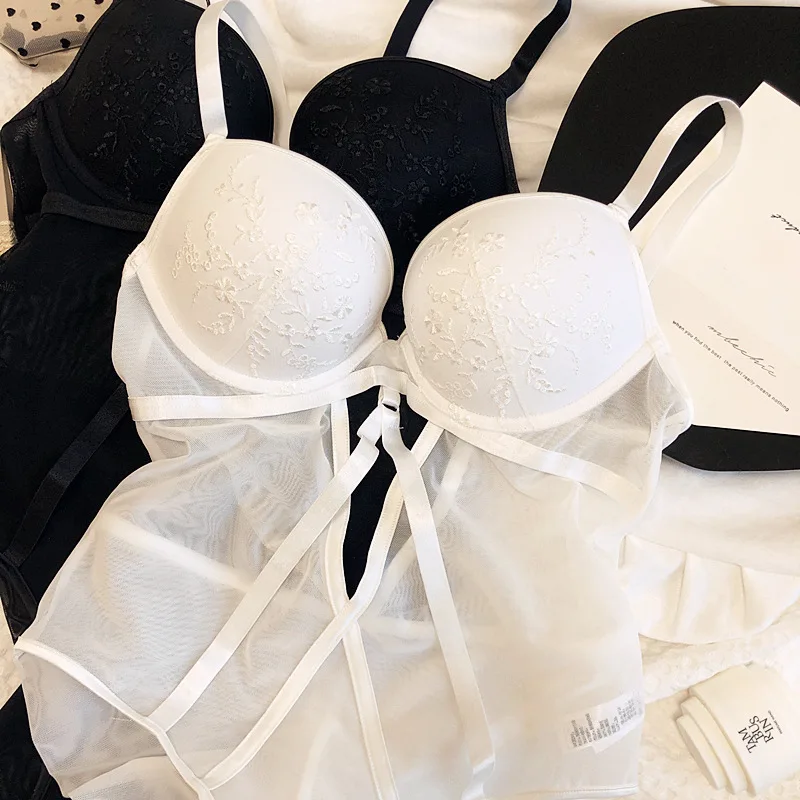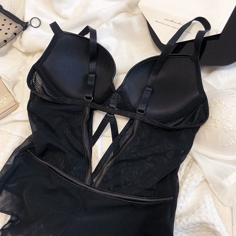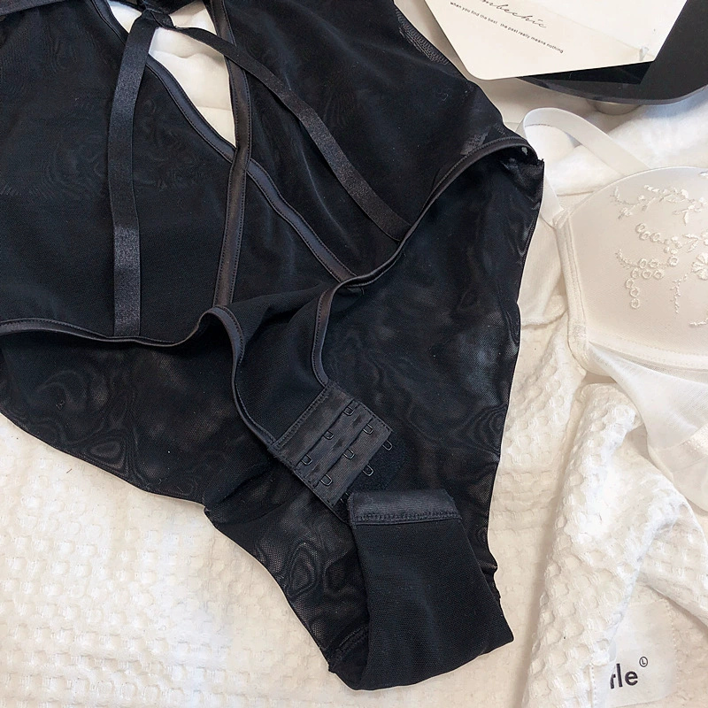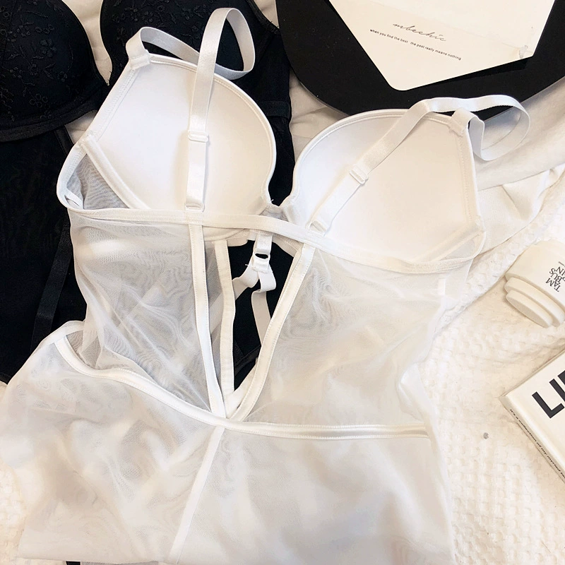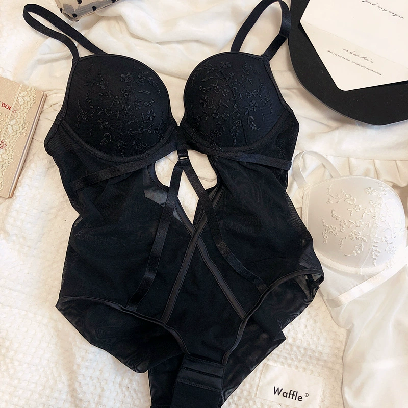 Sexy embroidered net yarn with steel ring lingerie gathers bodysuit one-piece underwear set hollow bandage bra opening file