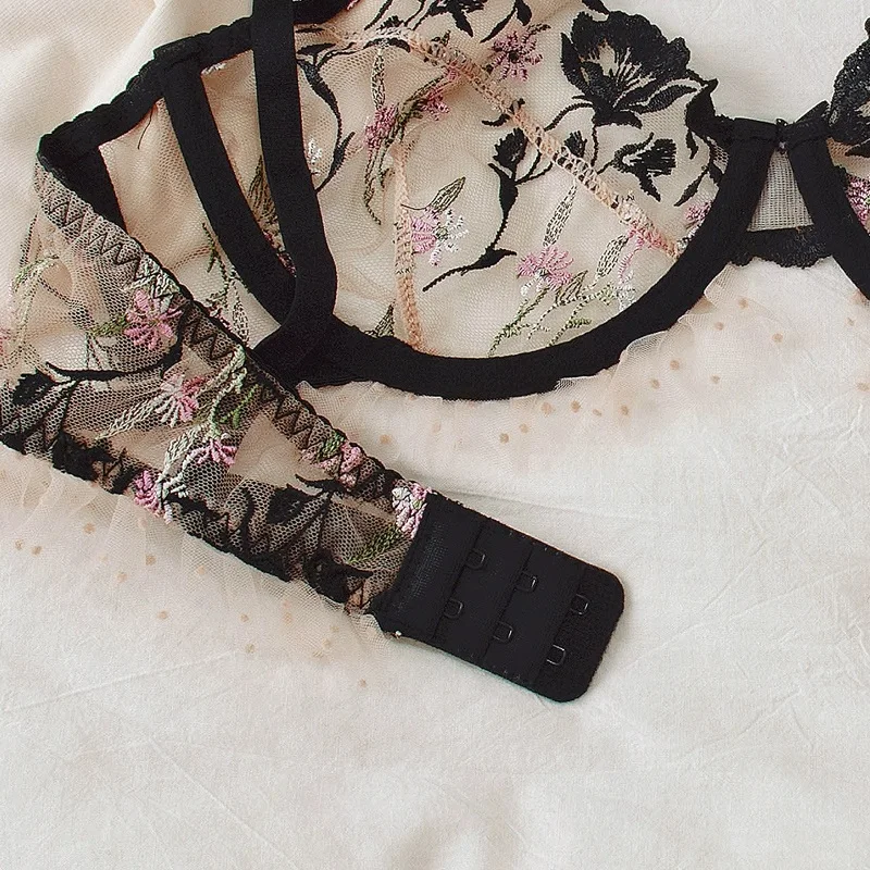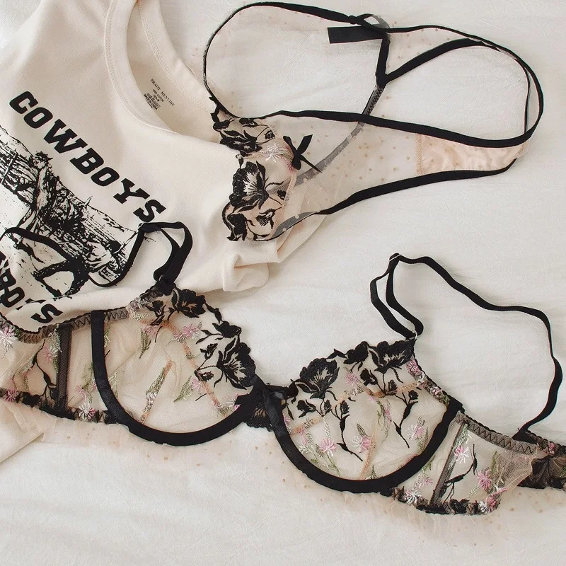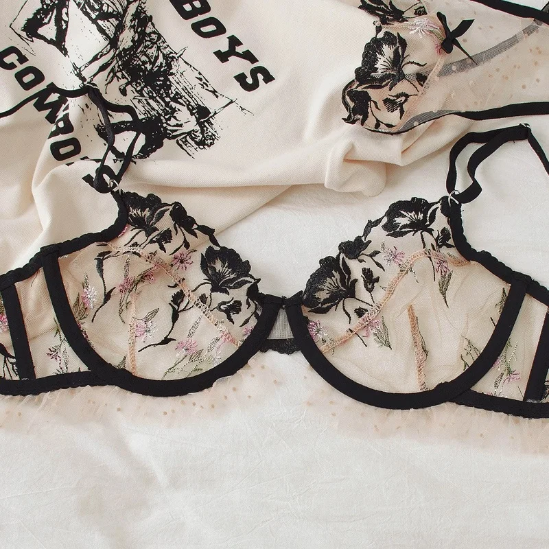 Sexy lace embroidered underwear ladies lingerie bra set thong bras gathered thin large size bratties
