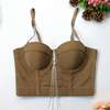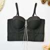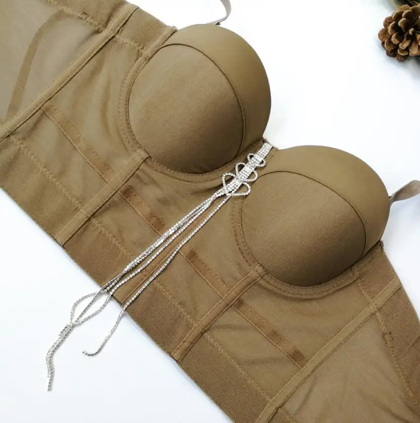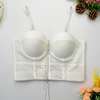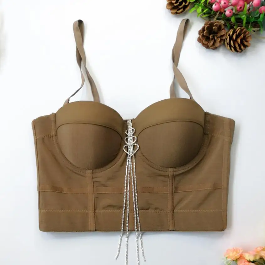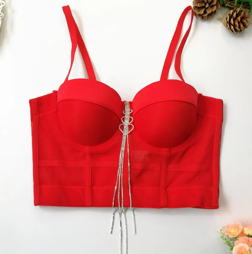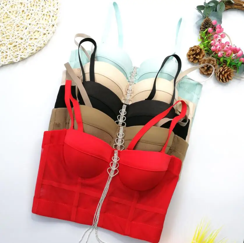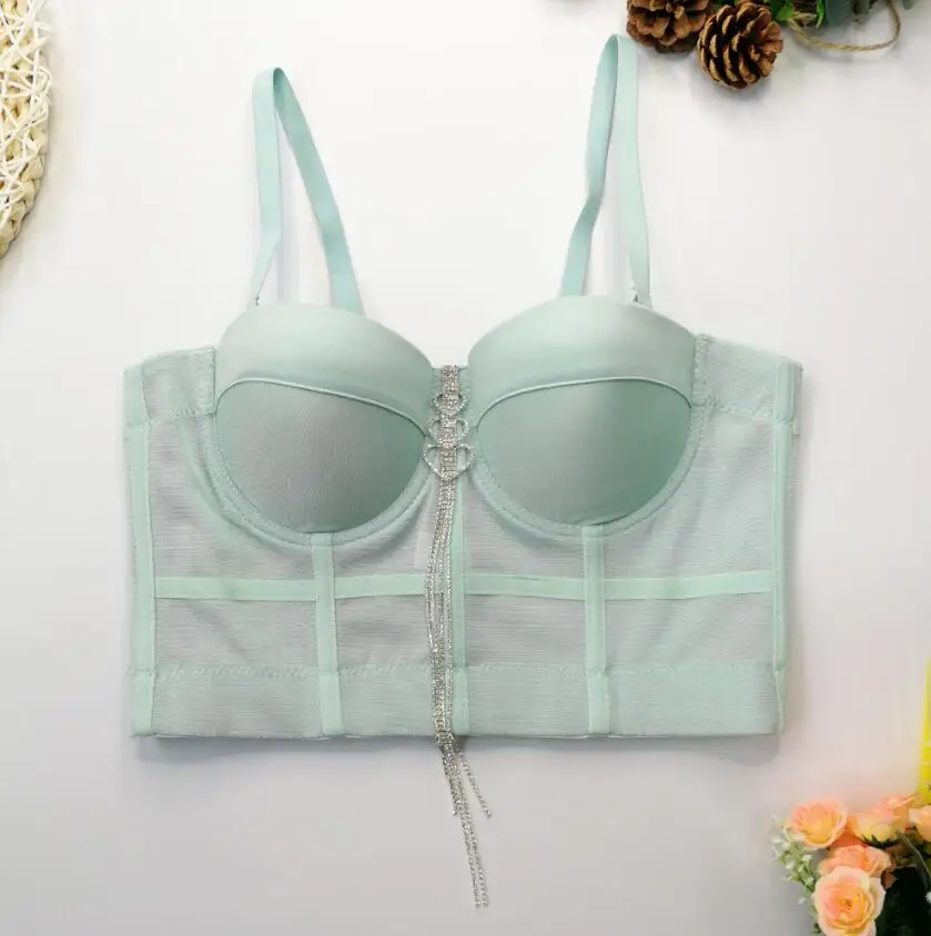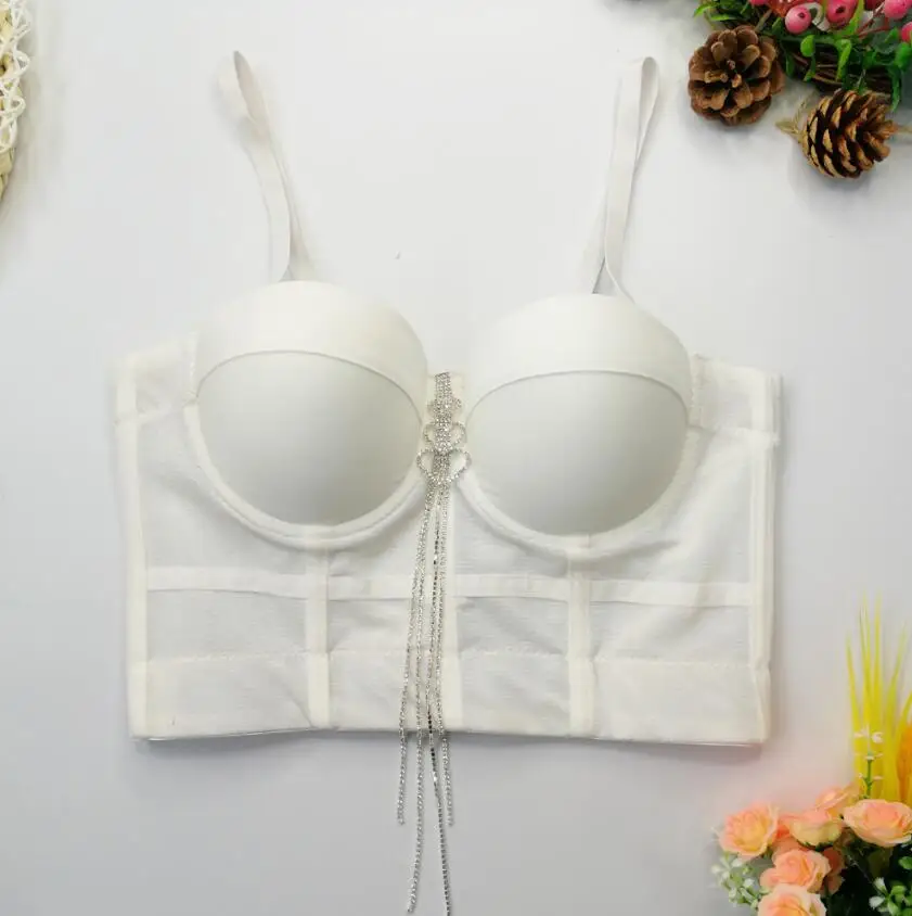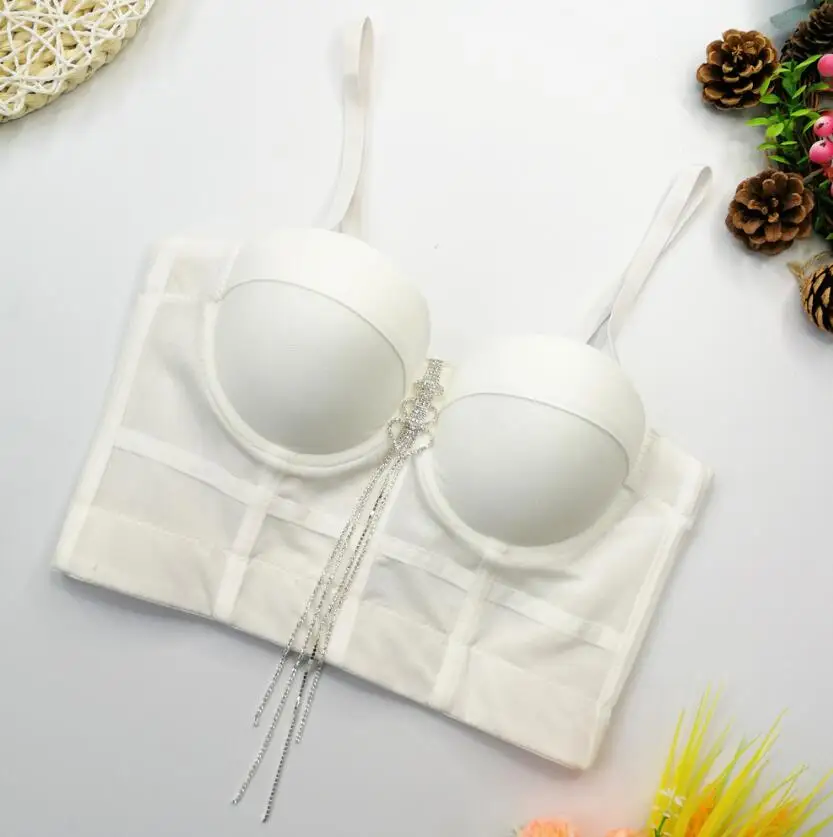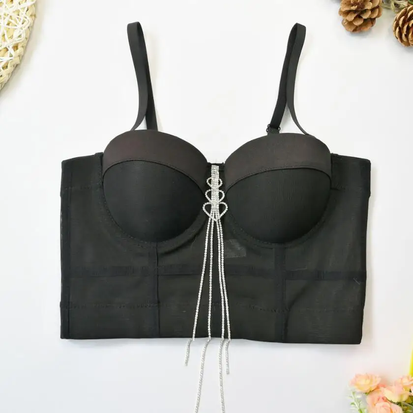 Sexy Mesh Rhinestone Tassel Spaghetti Strap Women Bustier Corset Night Club Party Crop Top Push Up Camis Built In Bra q445