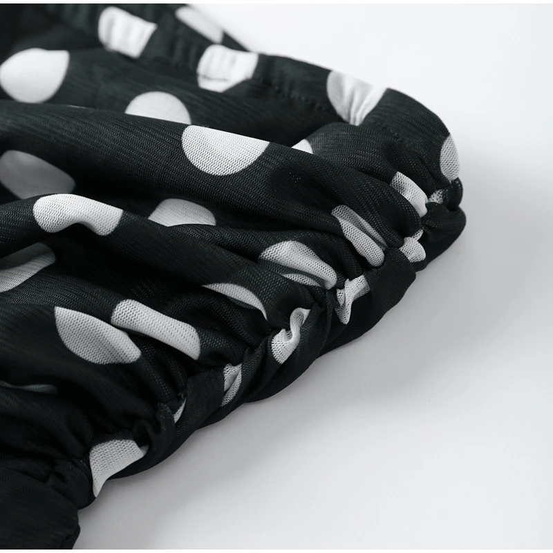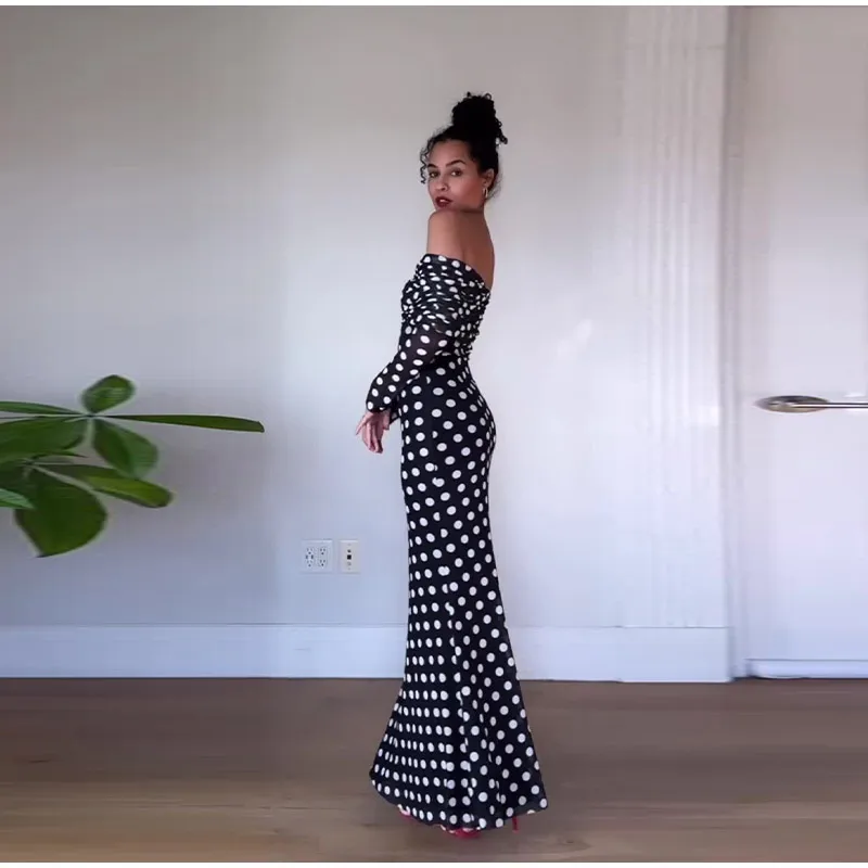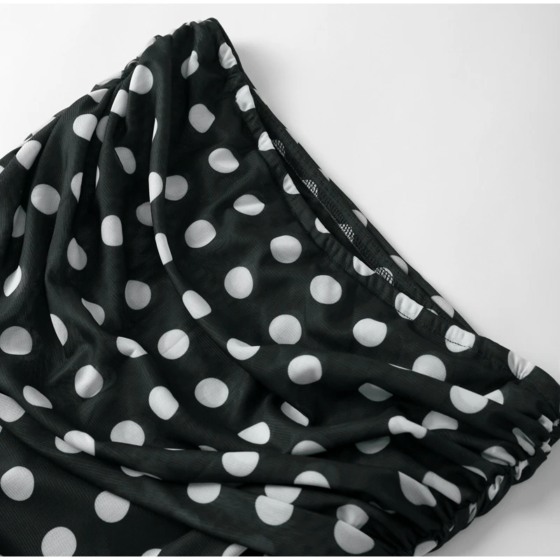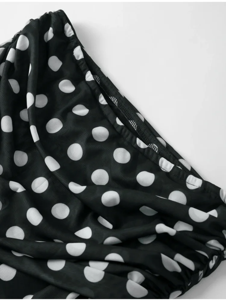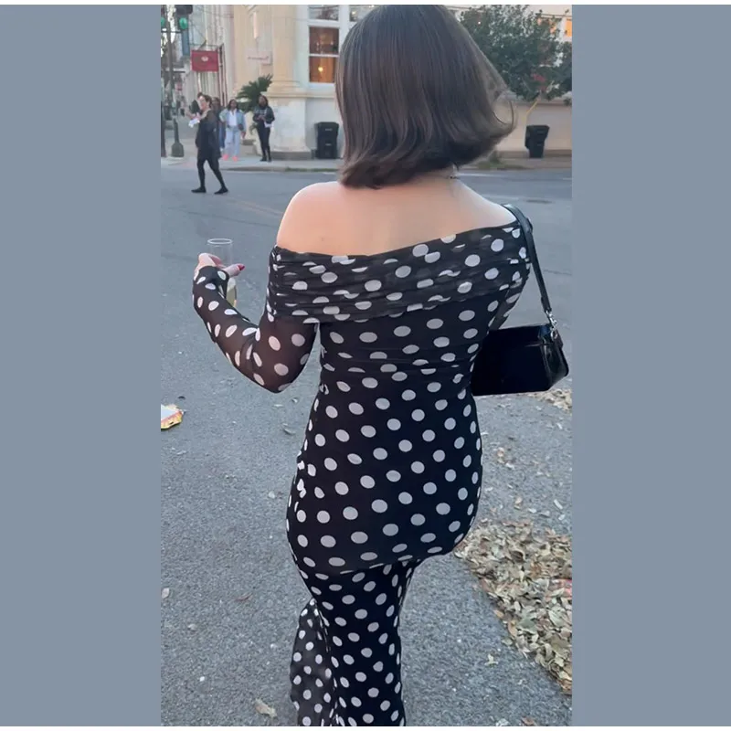Sexy Polka Dot Dresses For Women Off Shoulder Mesh Patchwork Party Dress Long Sleeves Ruched Vestidos Summer Lady Elegant Robes
