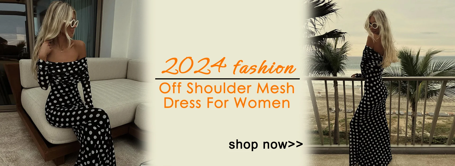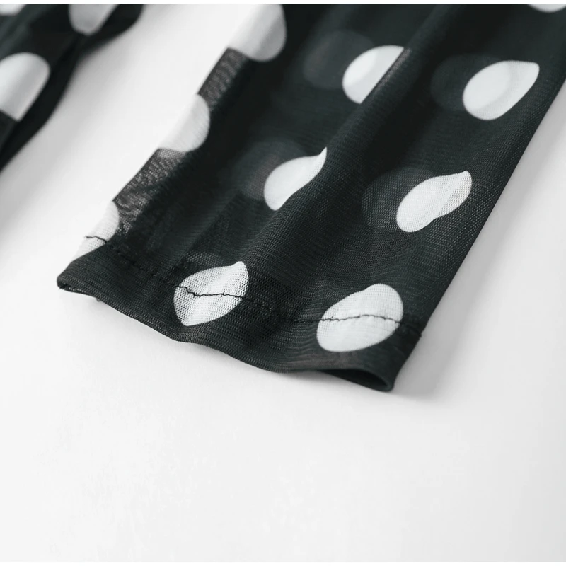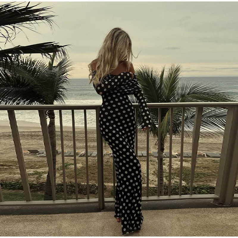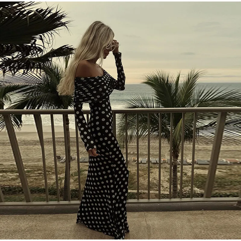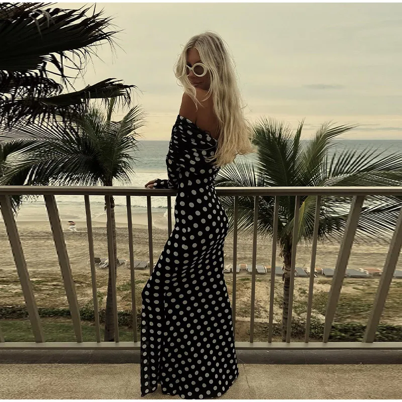 Sexy Polka Dot Dresses For Women Off Shoulder Mesh Patchwork Party Dress Long Sleeves Ruched Vestidos Summer Lady Elegant Robes