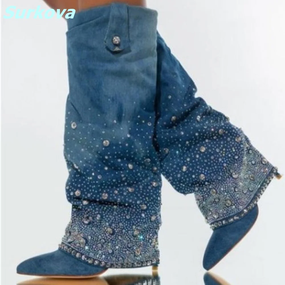 Shiny Diamond Jean Boots Knee-high Pointed Toe Slip On Thin High Heels Boots Hottest Sexy High Quality Women Shoes Dress Catwalk