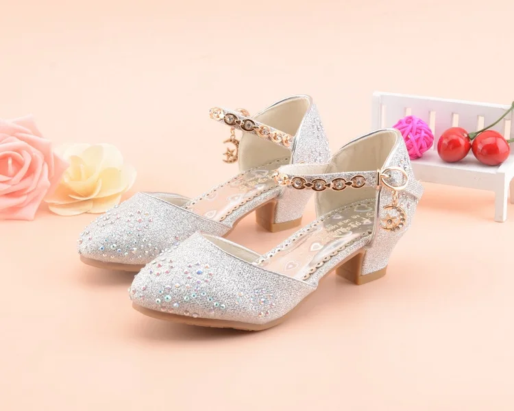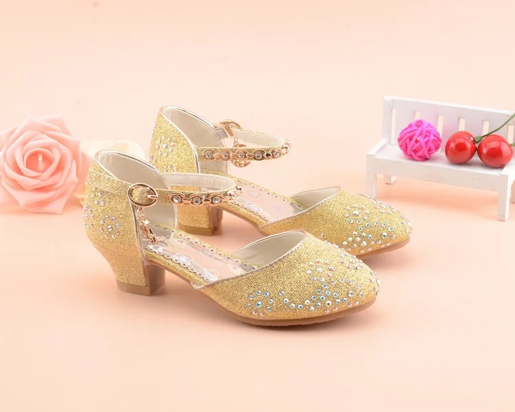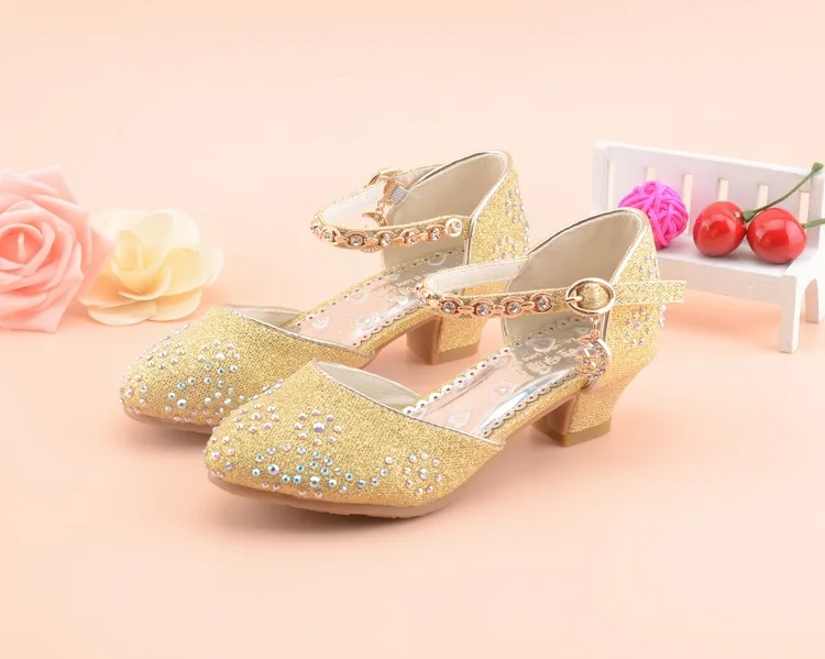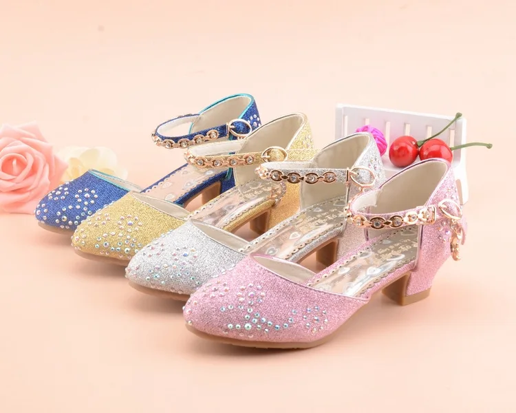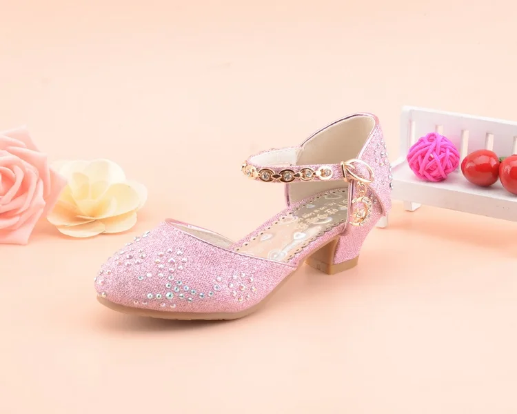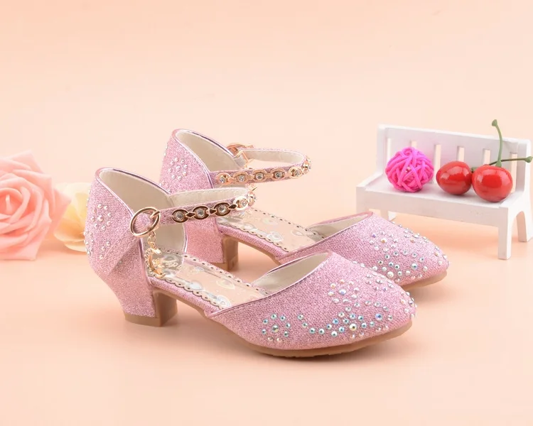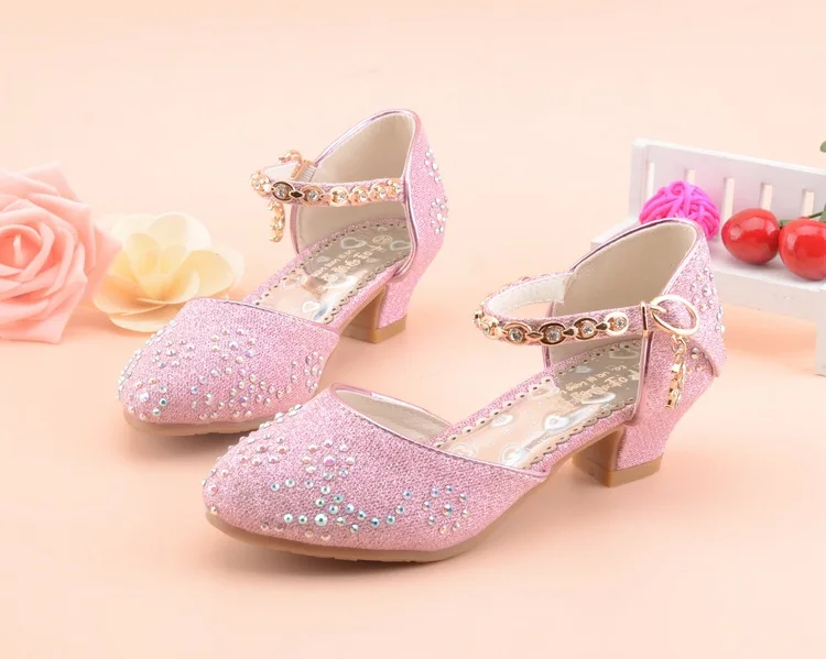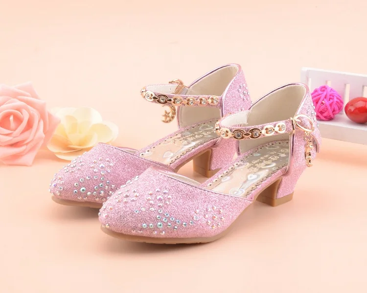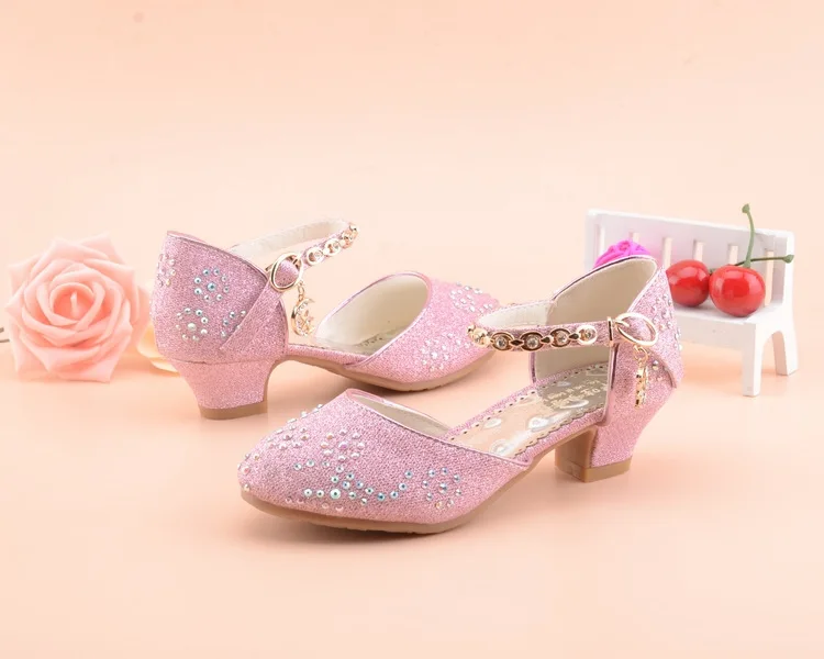 shorha Summer Children Girls Shoes Glitter Princess High Heels Sandals Pink Dance Weddings Kids Fashion Crystal Leather Party