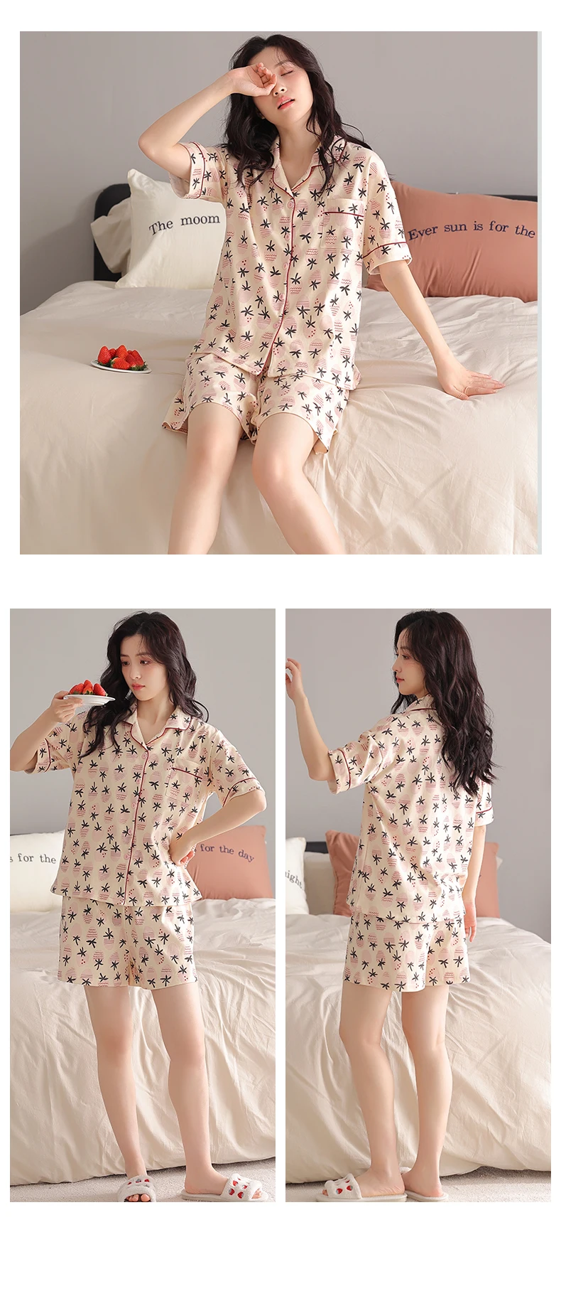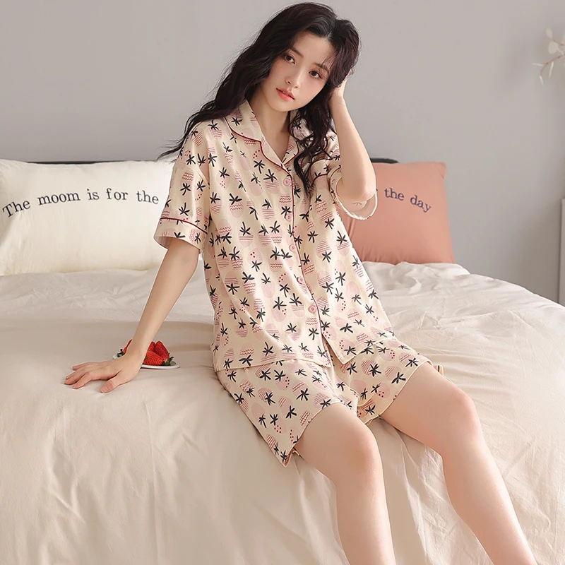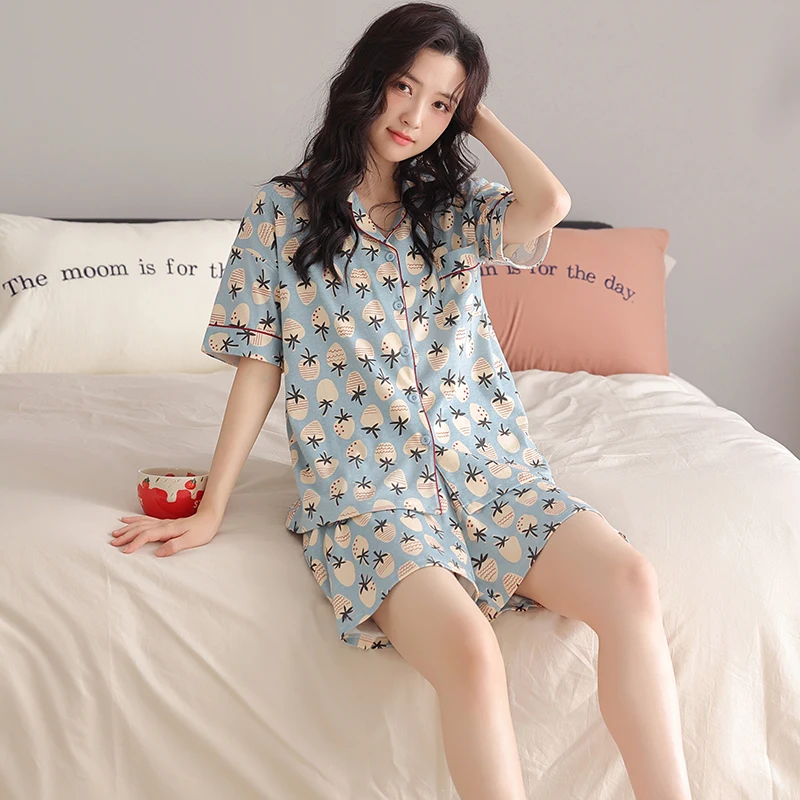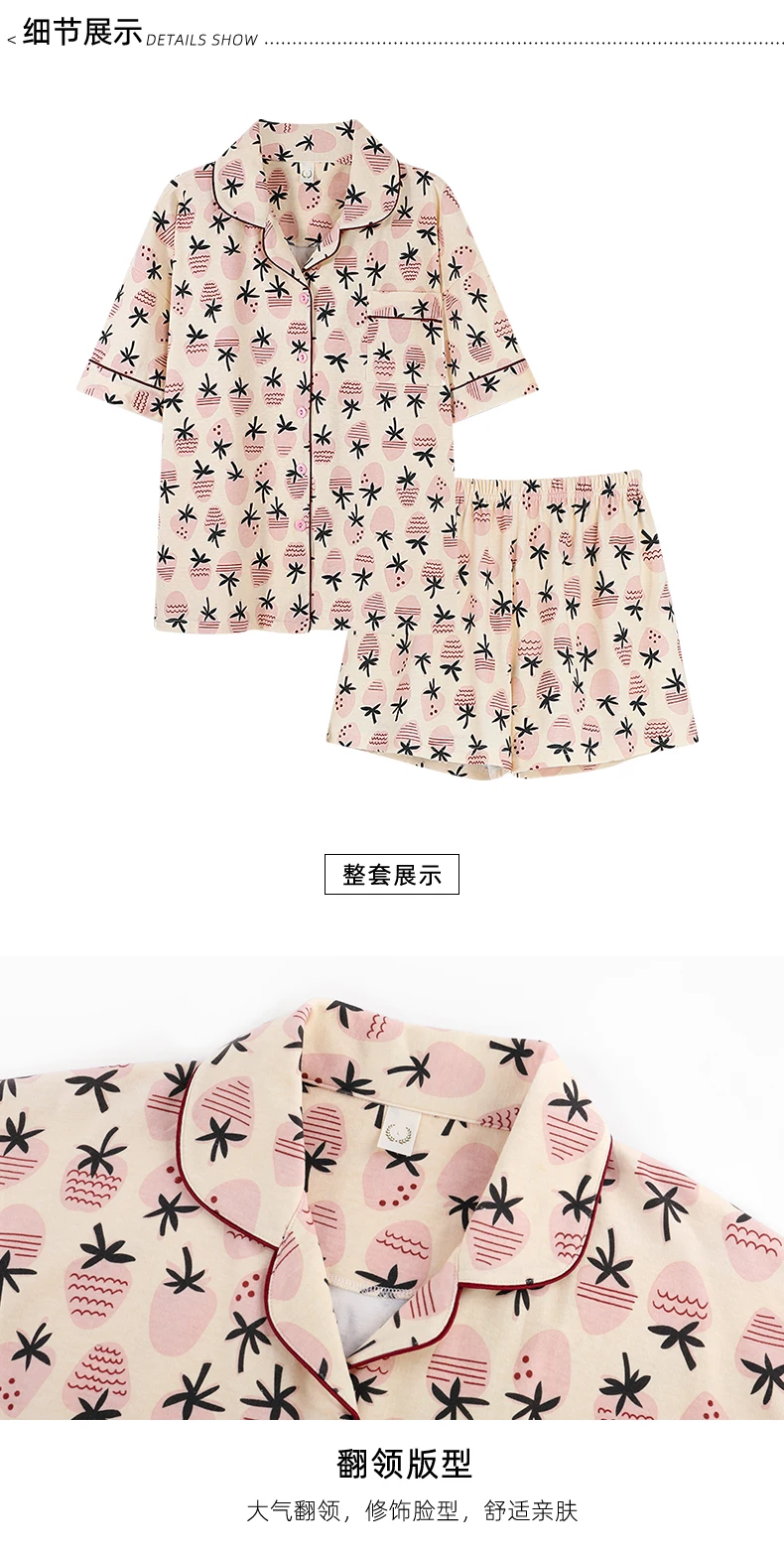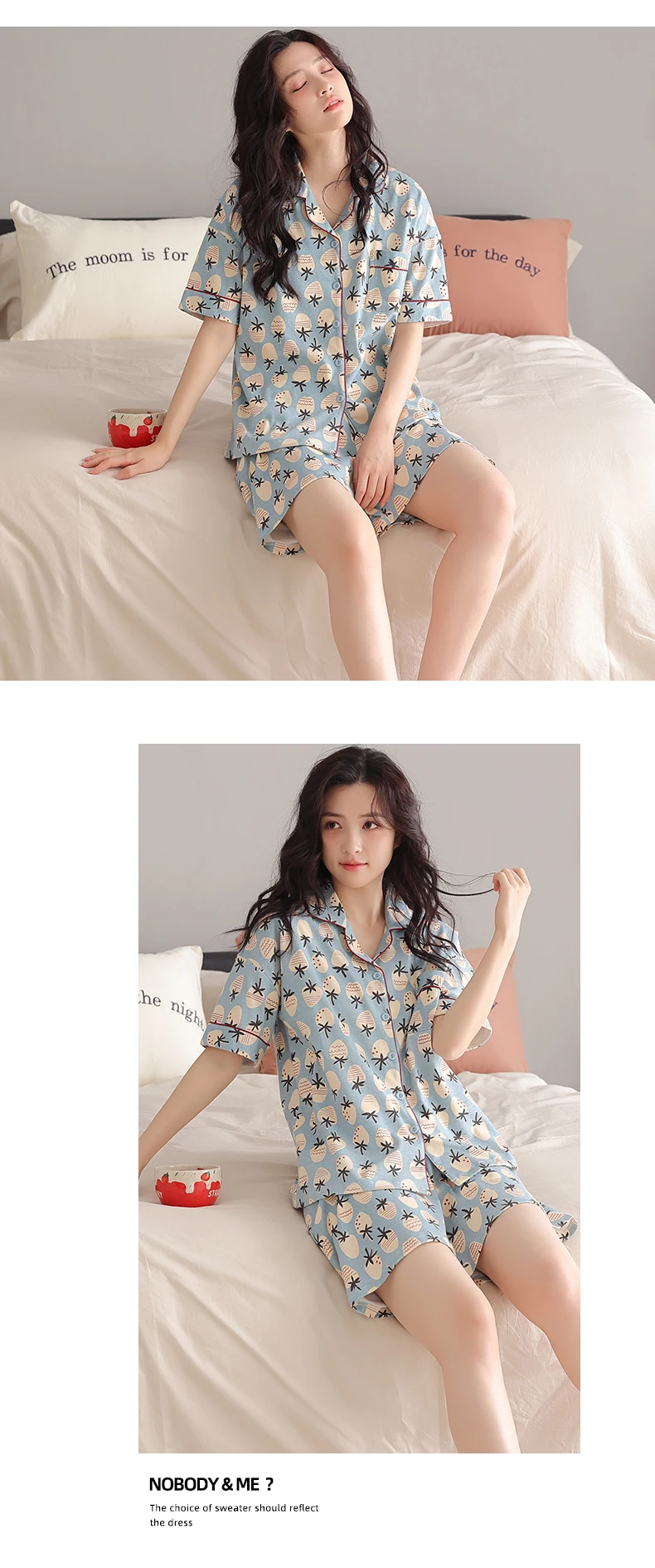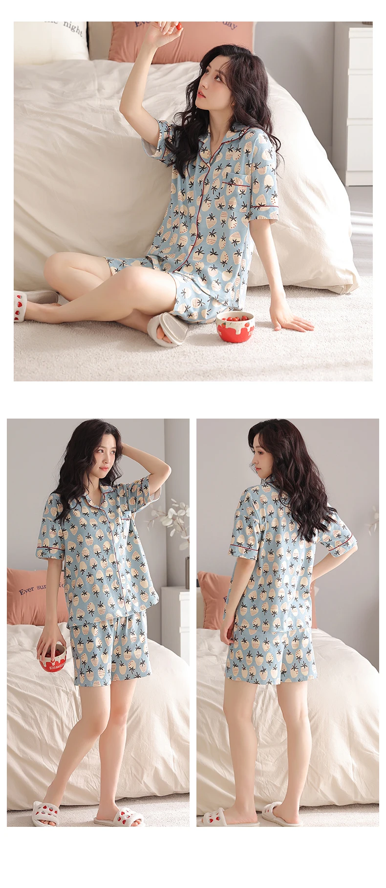 short pants + short sleeve cardigan tops pajamas sets cotton nightwear big yards M-4XL strawberry pyjamas women summer sleepwear
