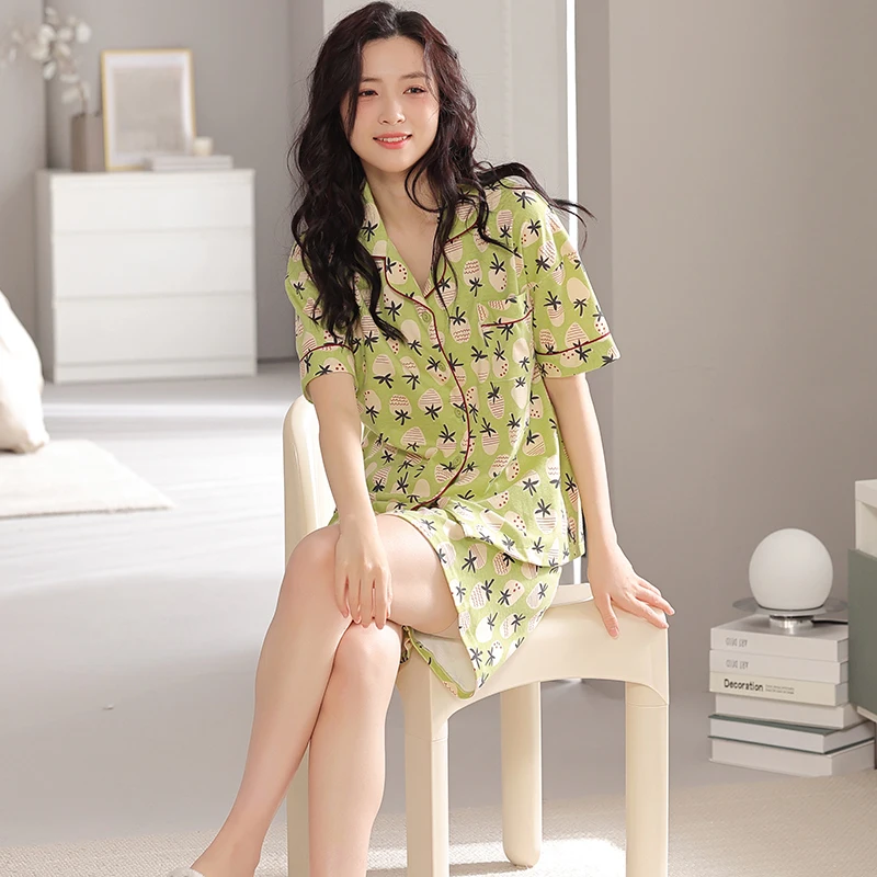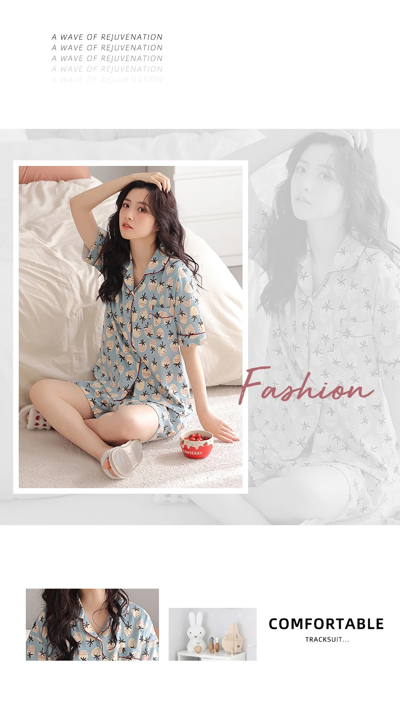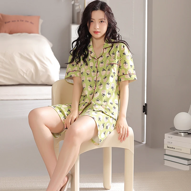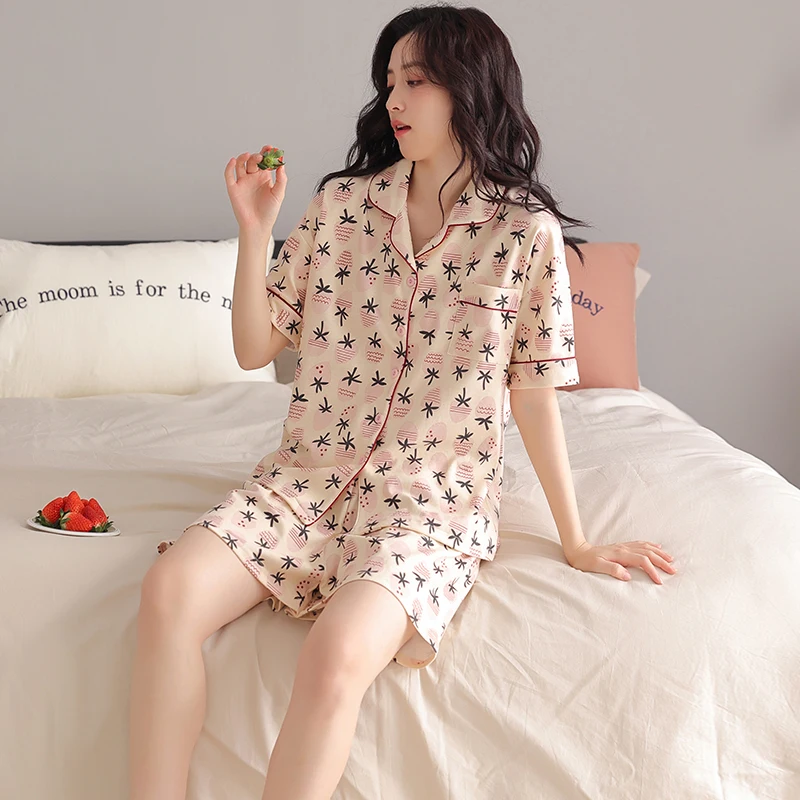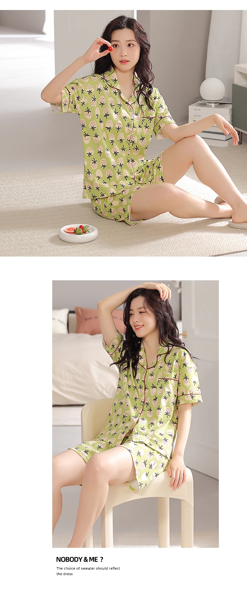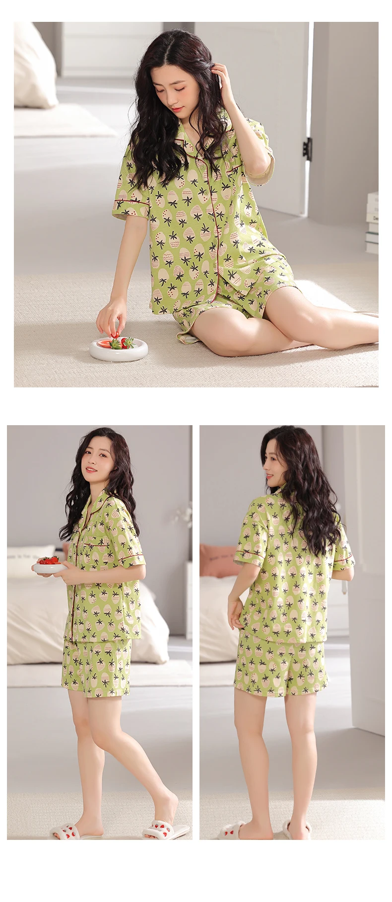 short pants + short sleeve cardigan tops pajamas sets cotton nightwear big yards M-4XL strawberry pyjamas women summer sleepwear