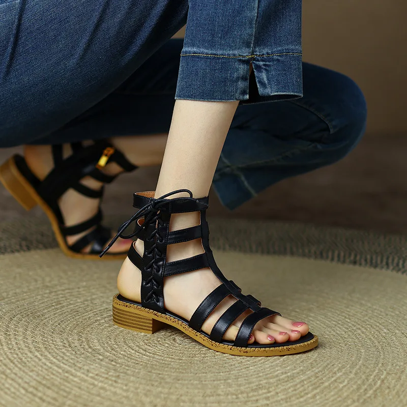 Basic Information About The Shoes:Side Zipper Gladiator Sandals New Soft Leather Flats Round Toe Women Shoes Casual Hollow Lace-up Sandales Concise Cozy Low Heels