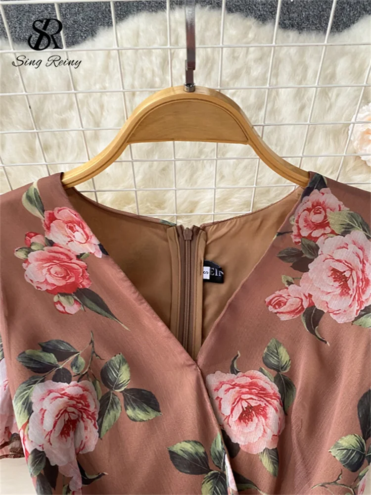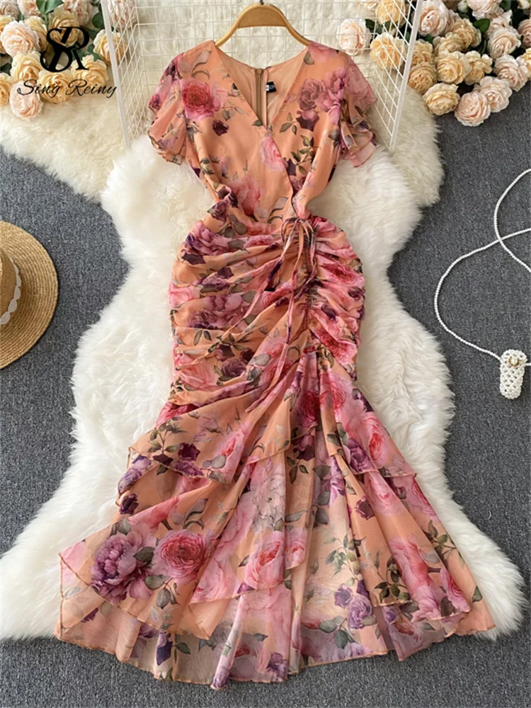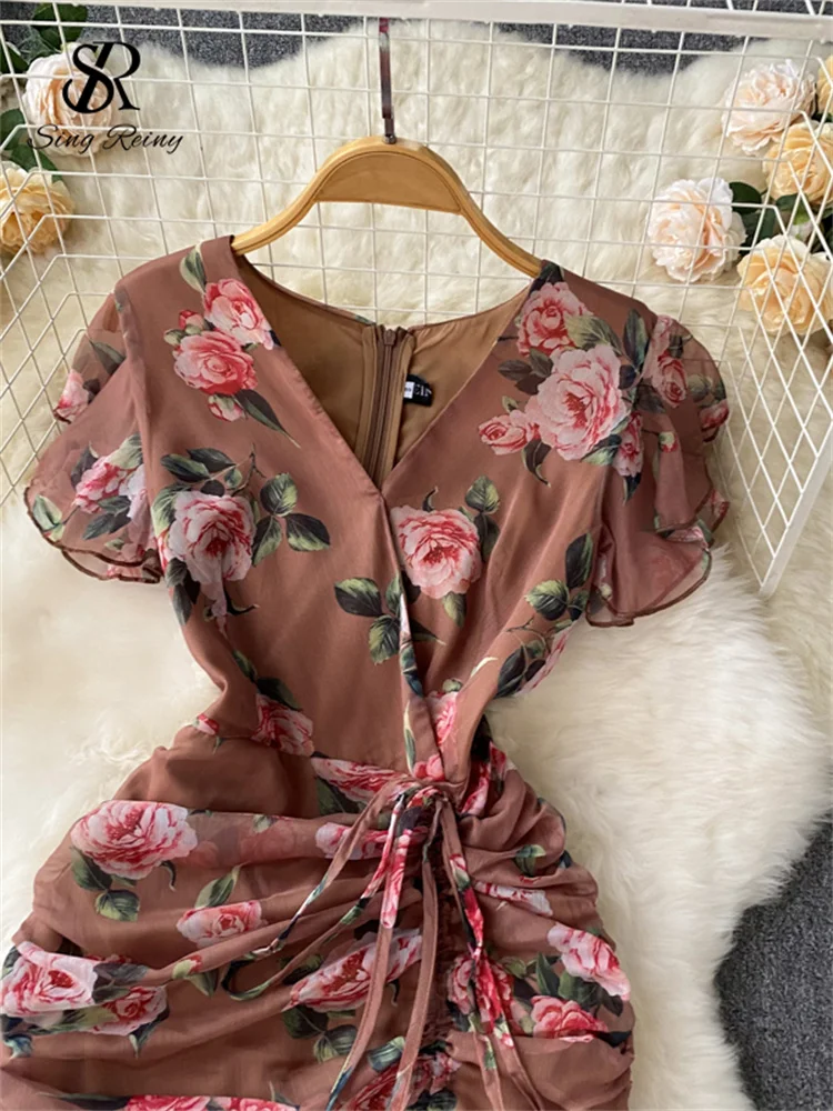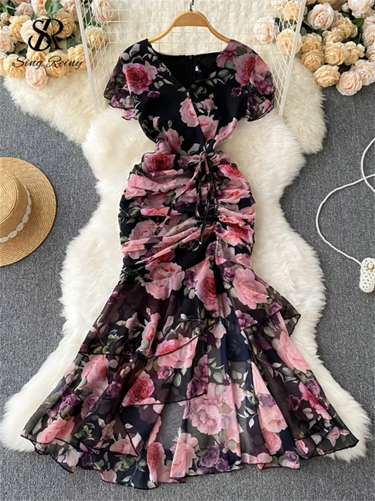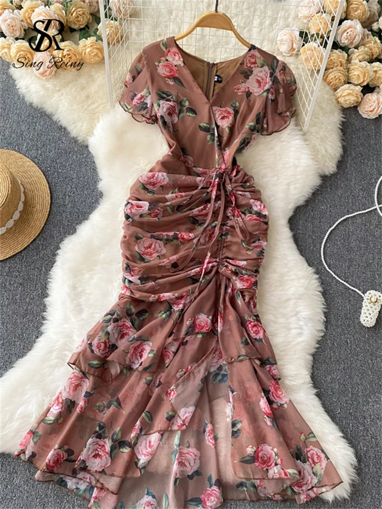 SINGREINY French Retro Long Dress Short Ruffles Sleeves V Neck Floral Print Drawstring Split Zipper Women Slim Bodycon Dress
