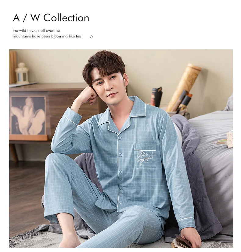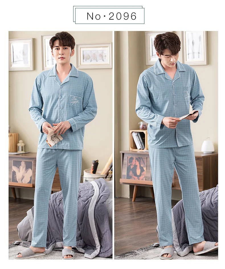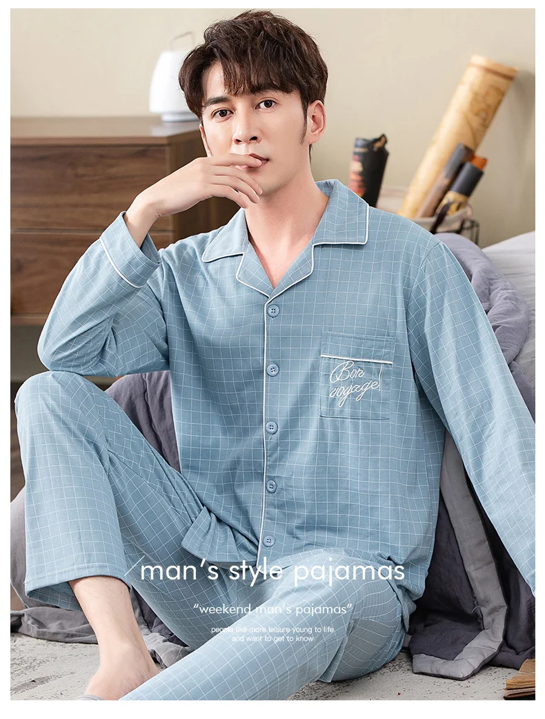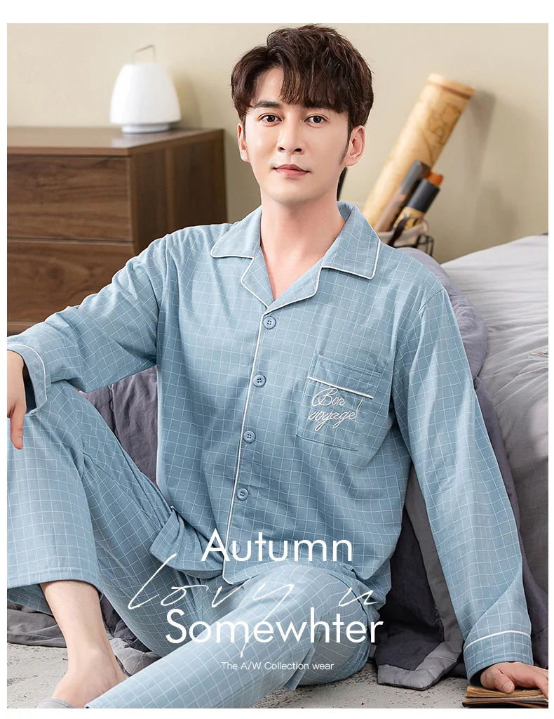 sky blue plaid print pyjamas male full cotton men pajama sets autumn casual fashion sleepwear men homewear sexy pijamas hombre