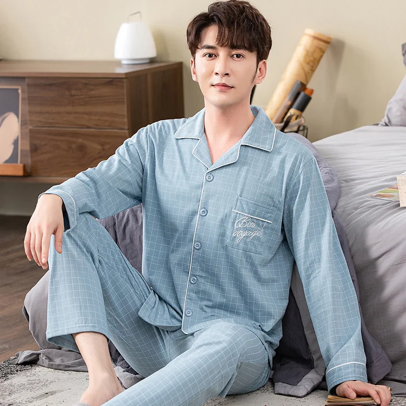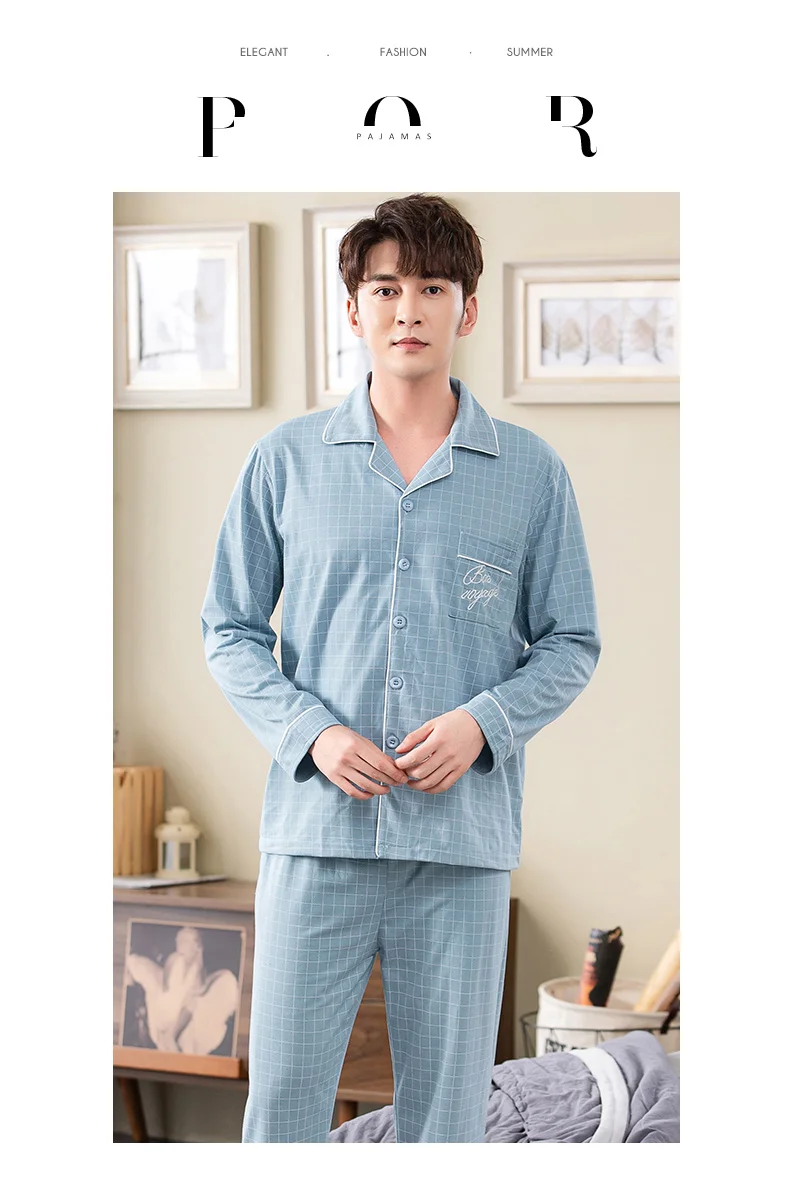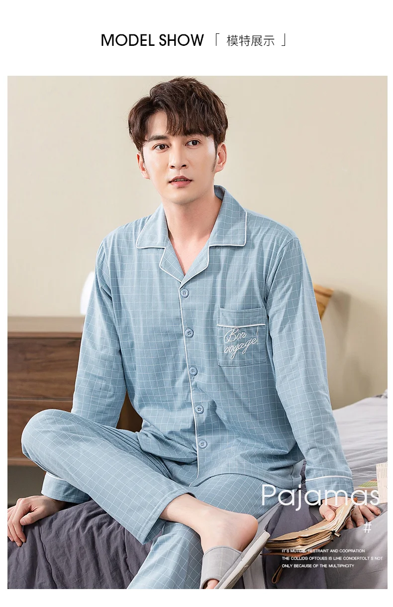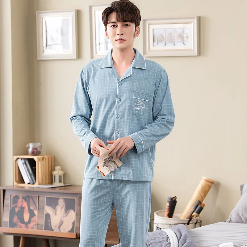 sky blue plaid print pyjamas male full cotton men pajama sets autumn casual fashion sleepwear men homewear sexy pijamas hombre