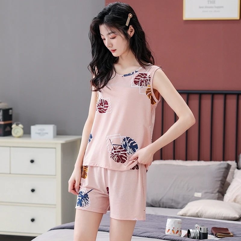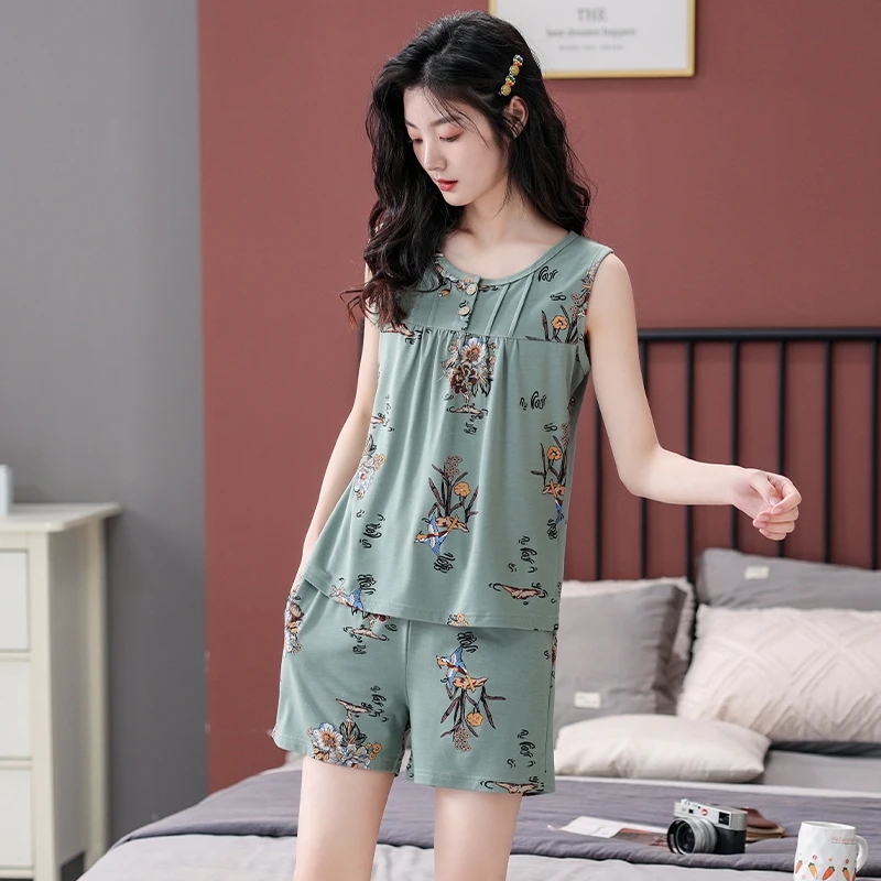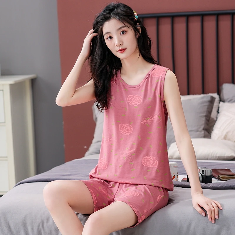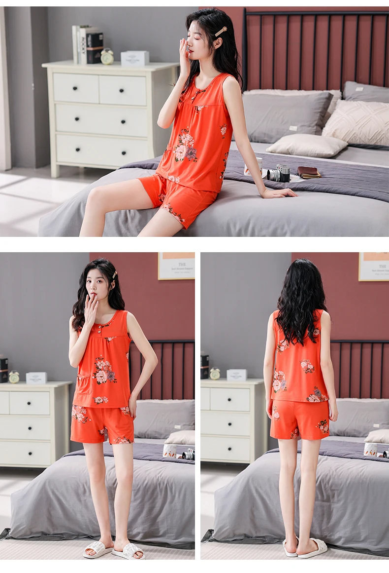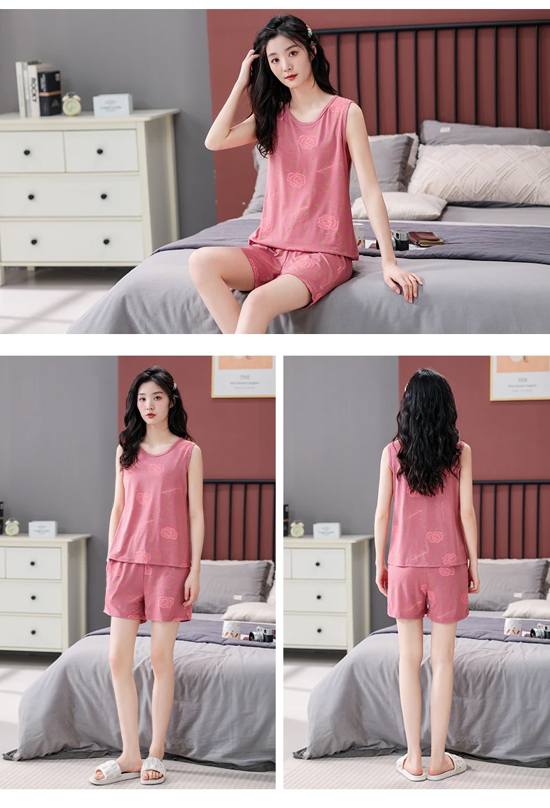 Small Flower Print Women Vest Pajama Sets Stretch Modal Sleepwear Casual Tracksuit 2 Pcs/set Sleeveless Summer Home Lounge Gift