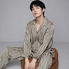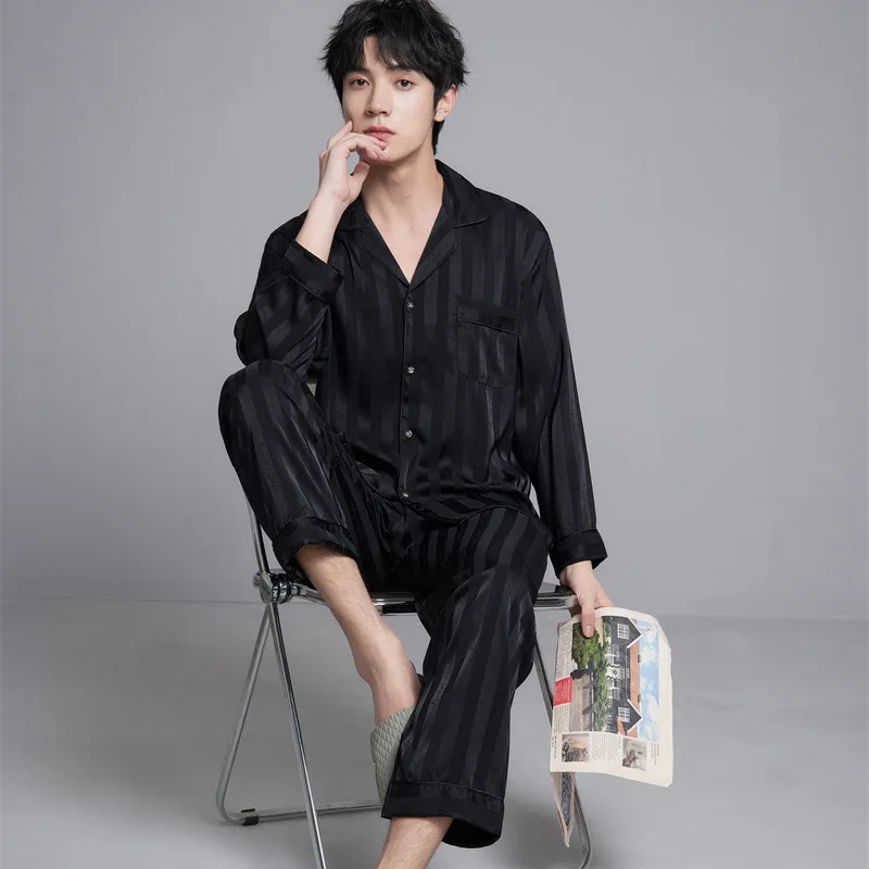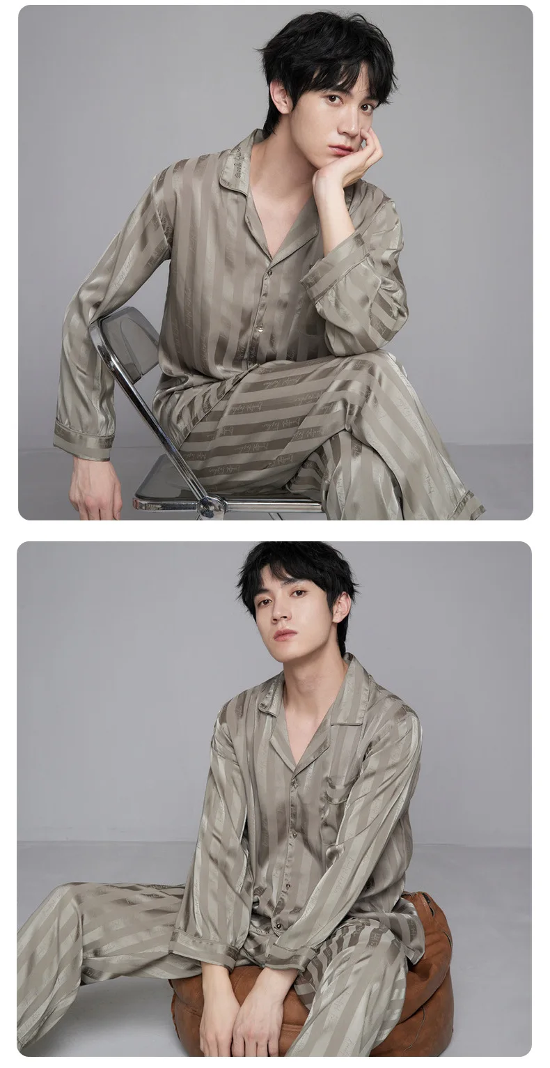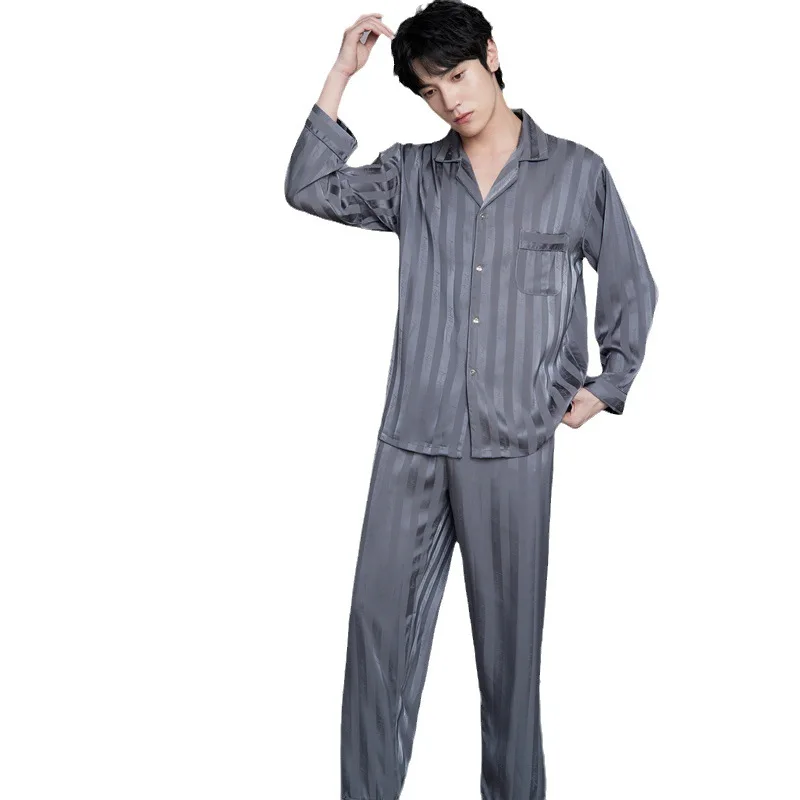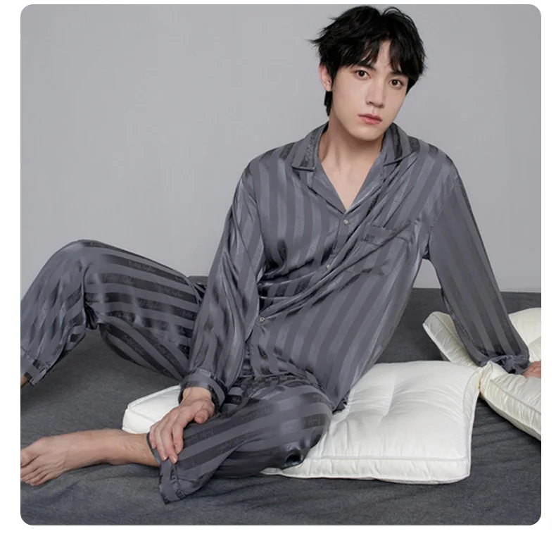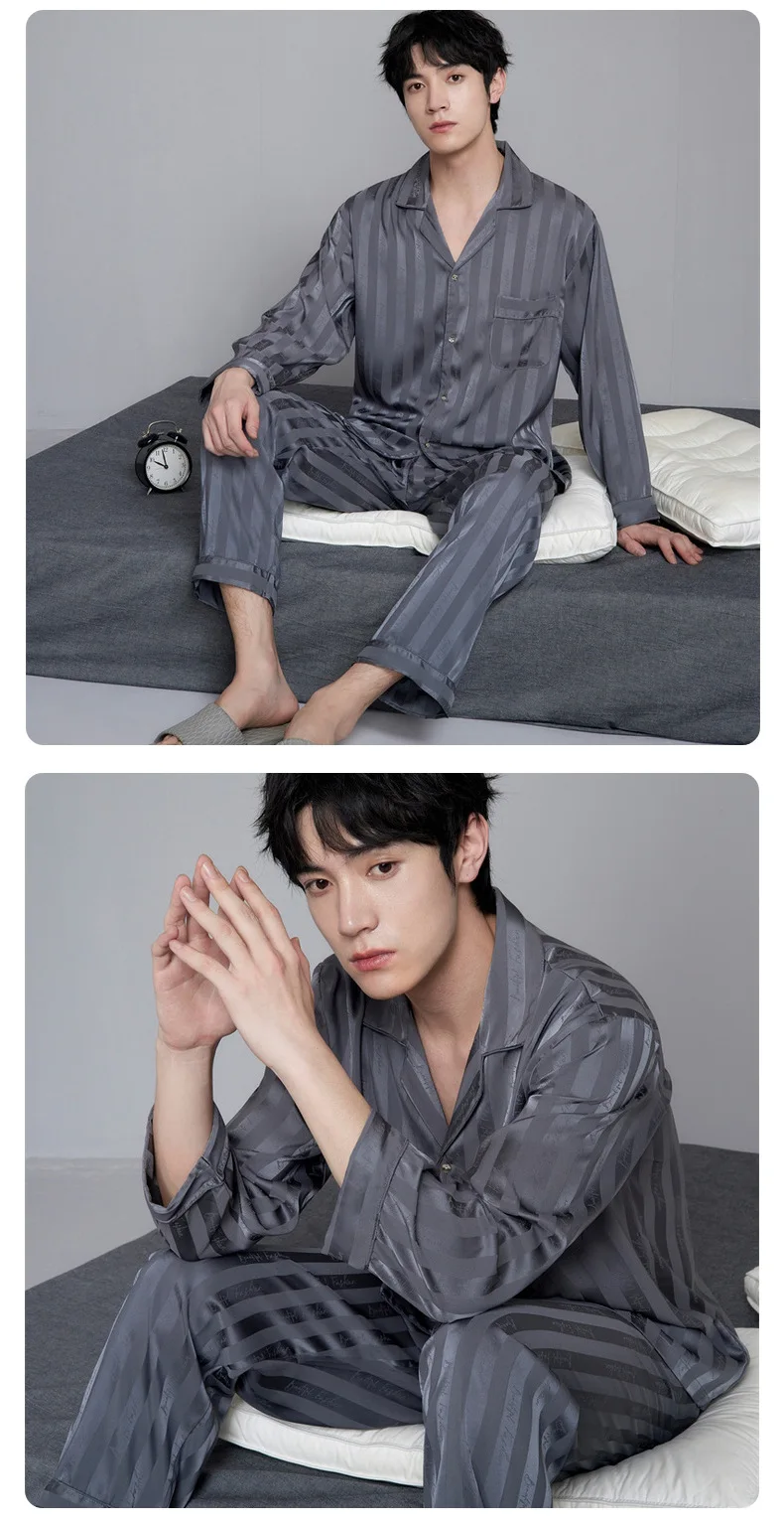 Sprig Autumn Silk Satin Sleepwear Pijamas Suit Plus Size Men Pajamas Set Gray Stripe Long Sleeve Nightwear Loose Asual Home Wear