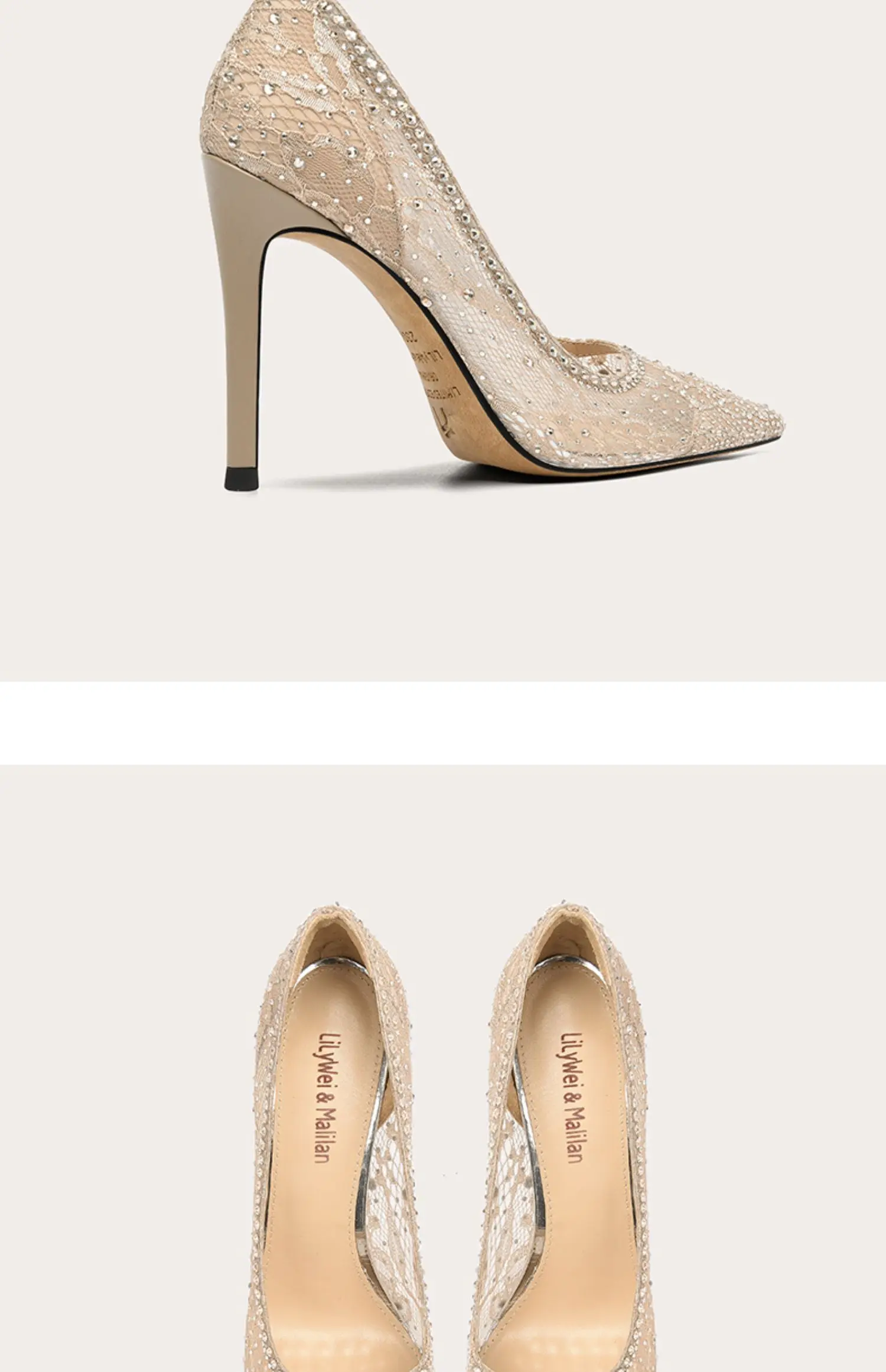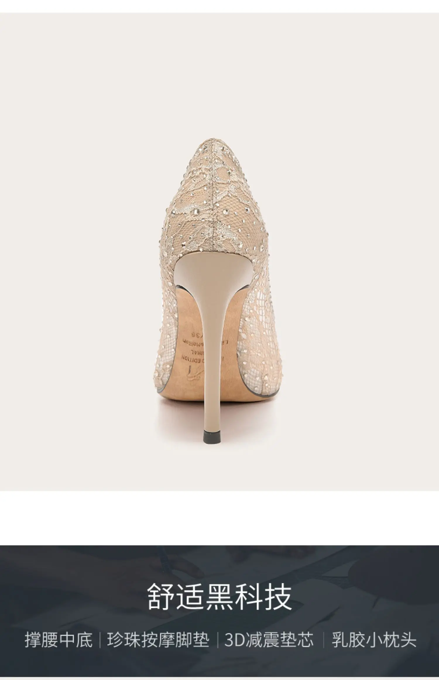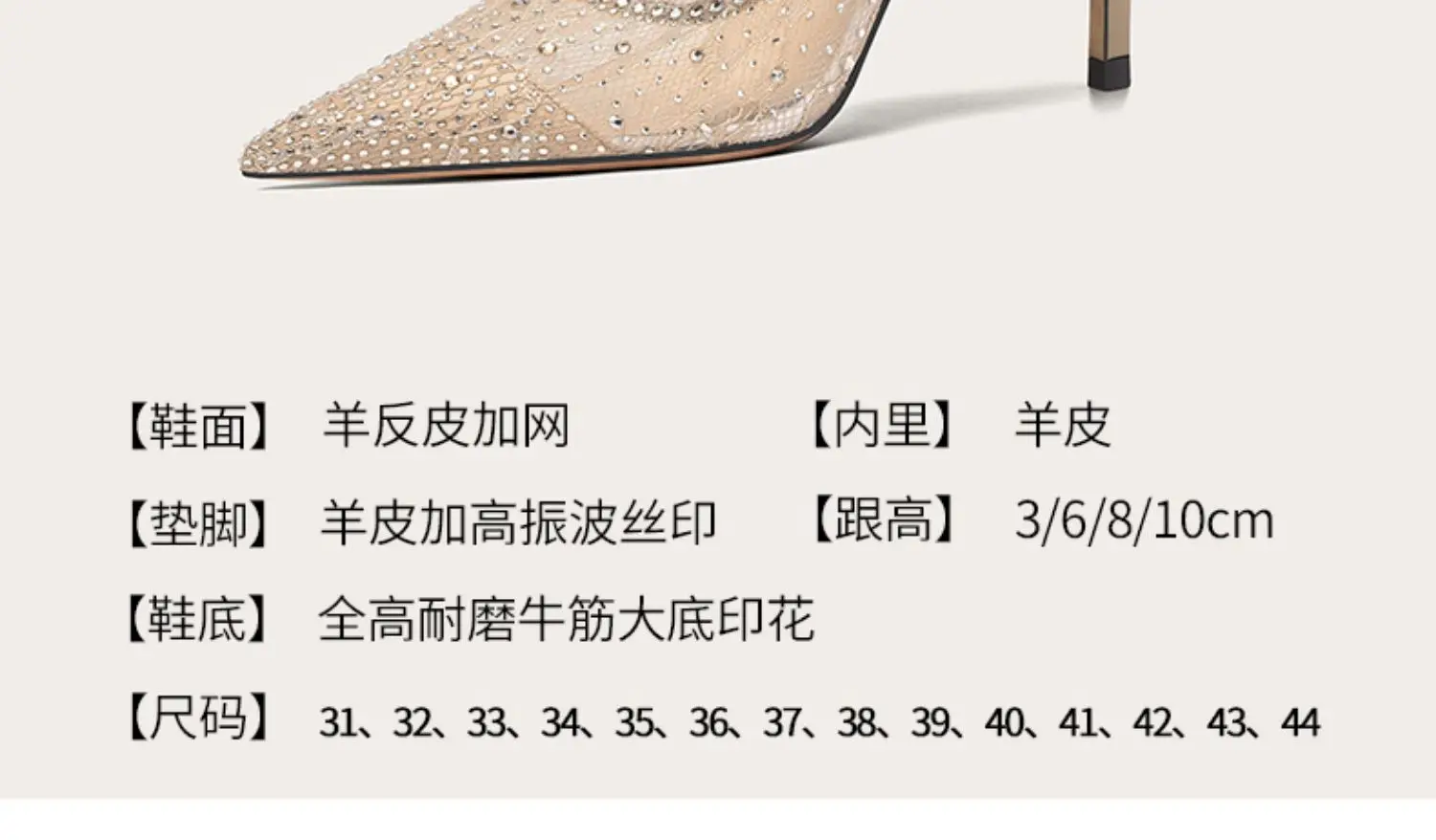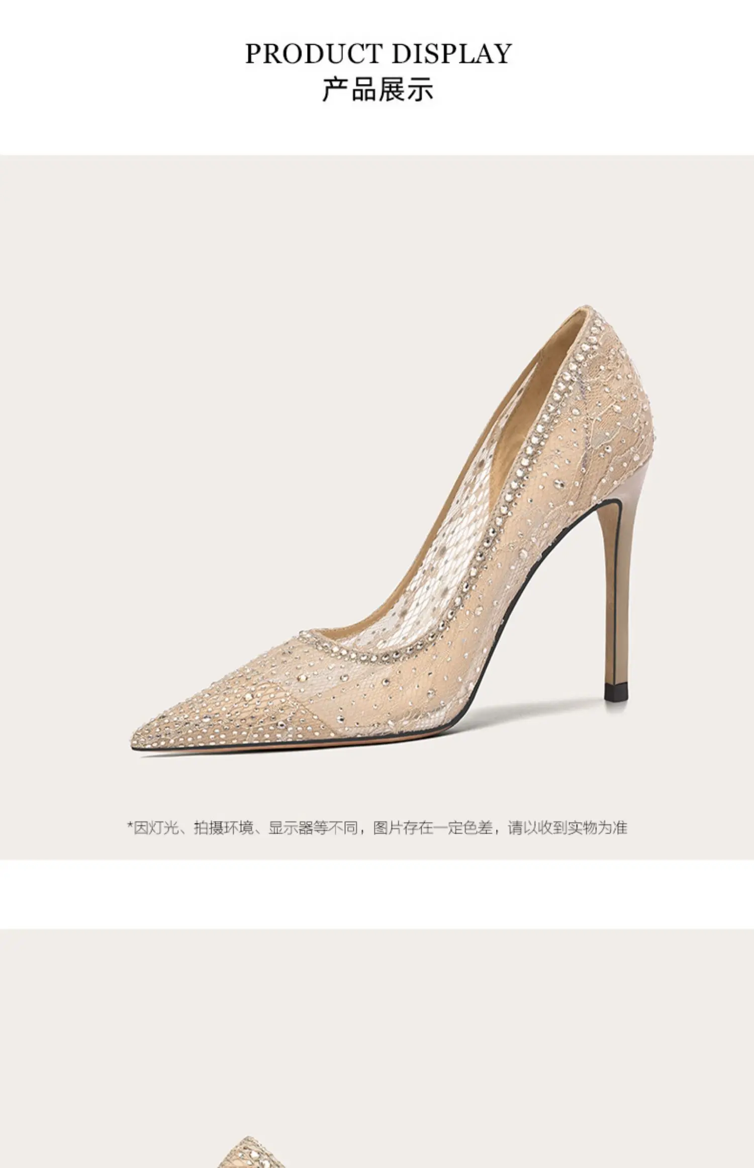 Spring and Summer New Pointed Rhinestone Lace Mesh Sandals Slim High Heel Party Dress Large and Small Women’s Single Shoes