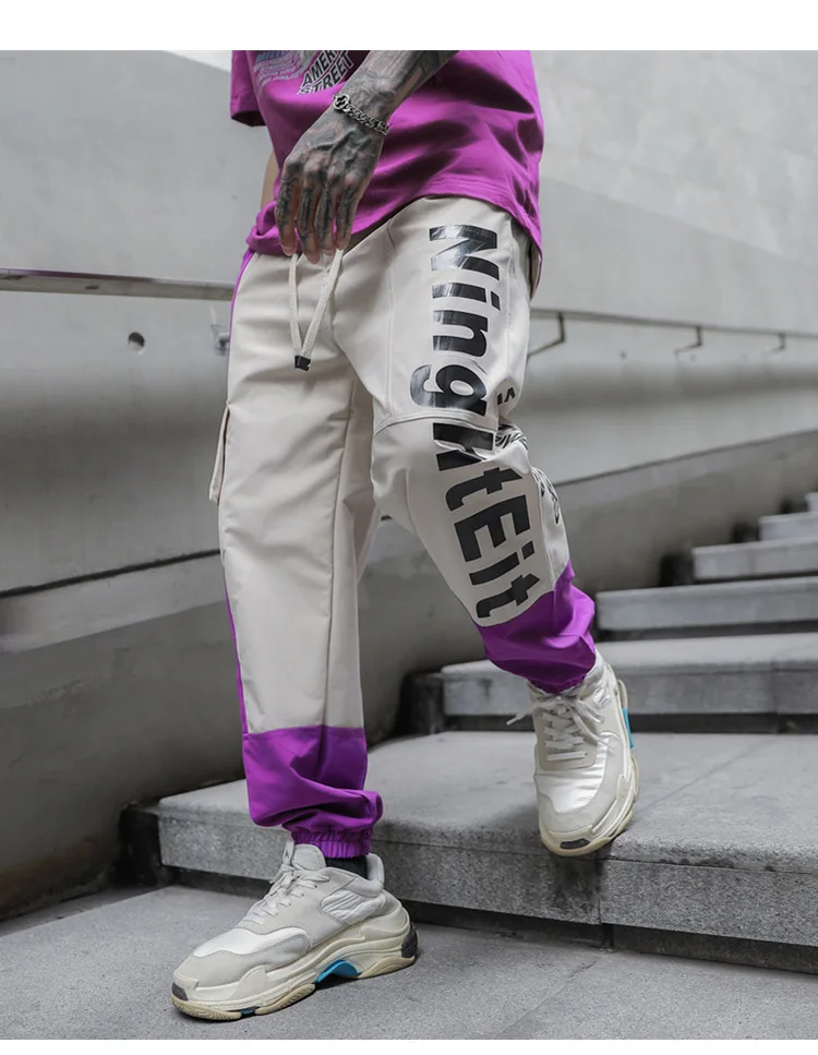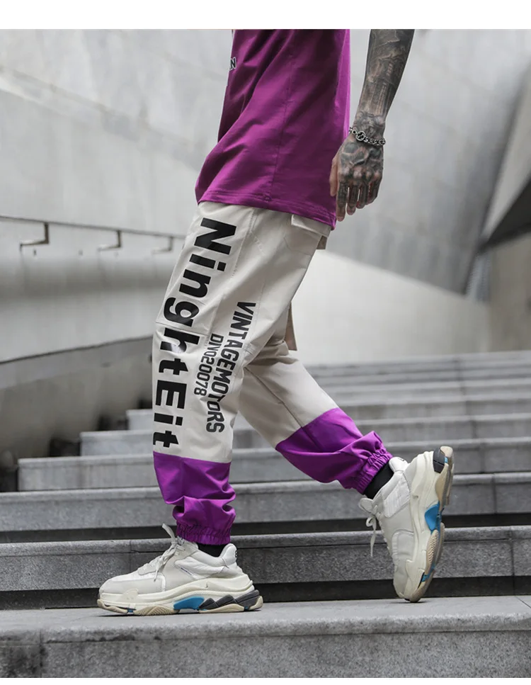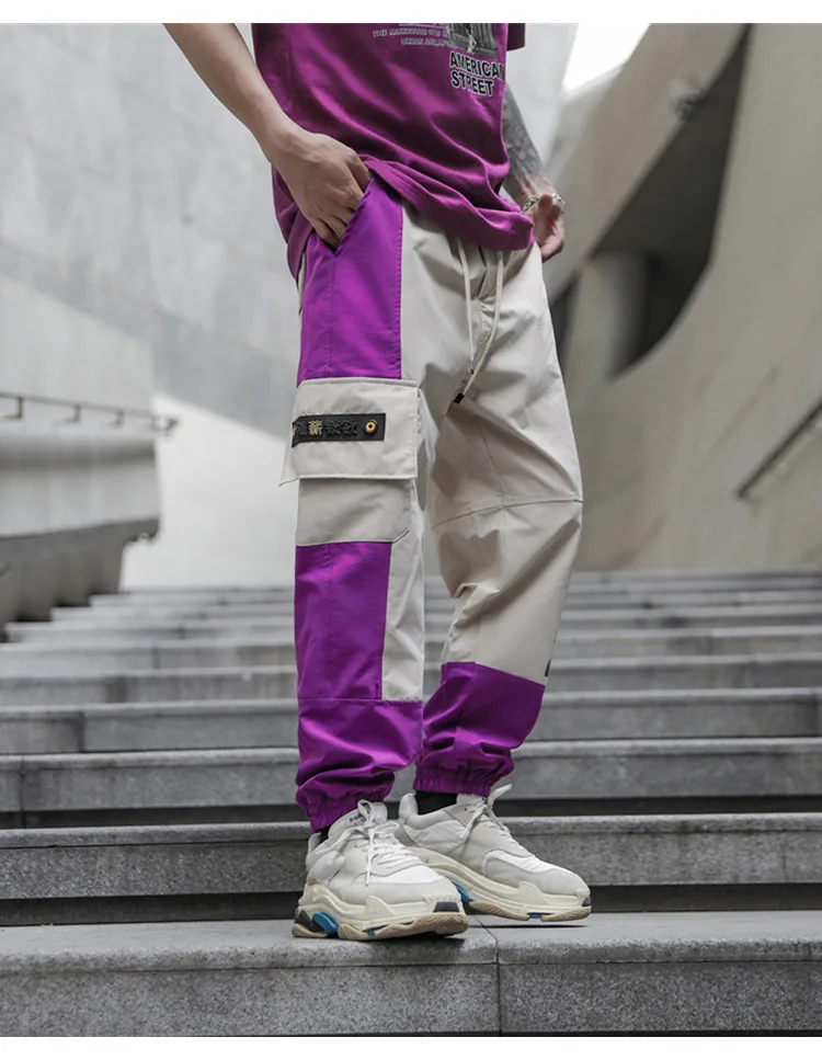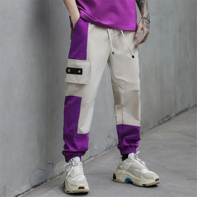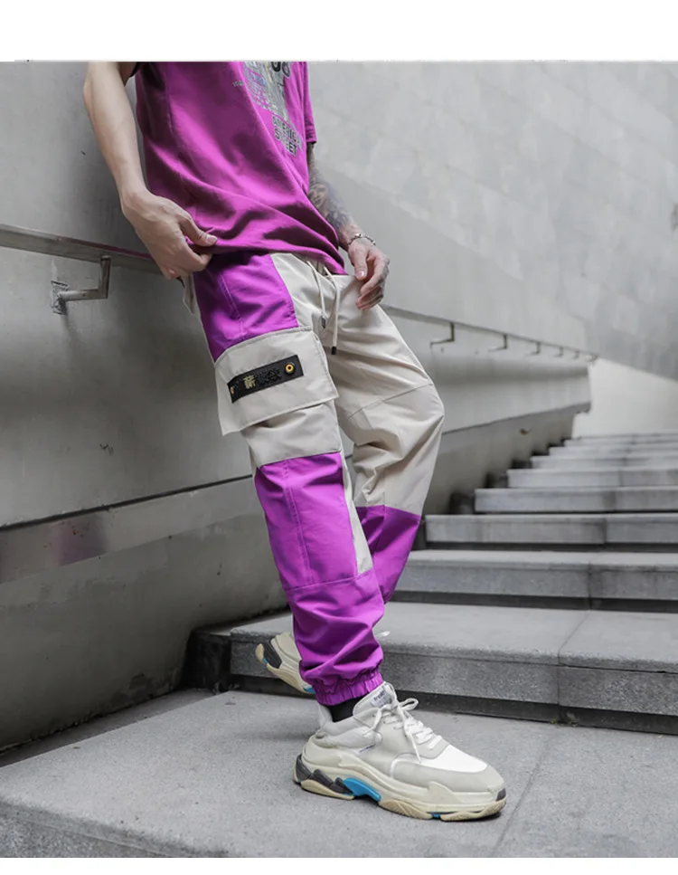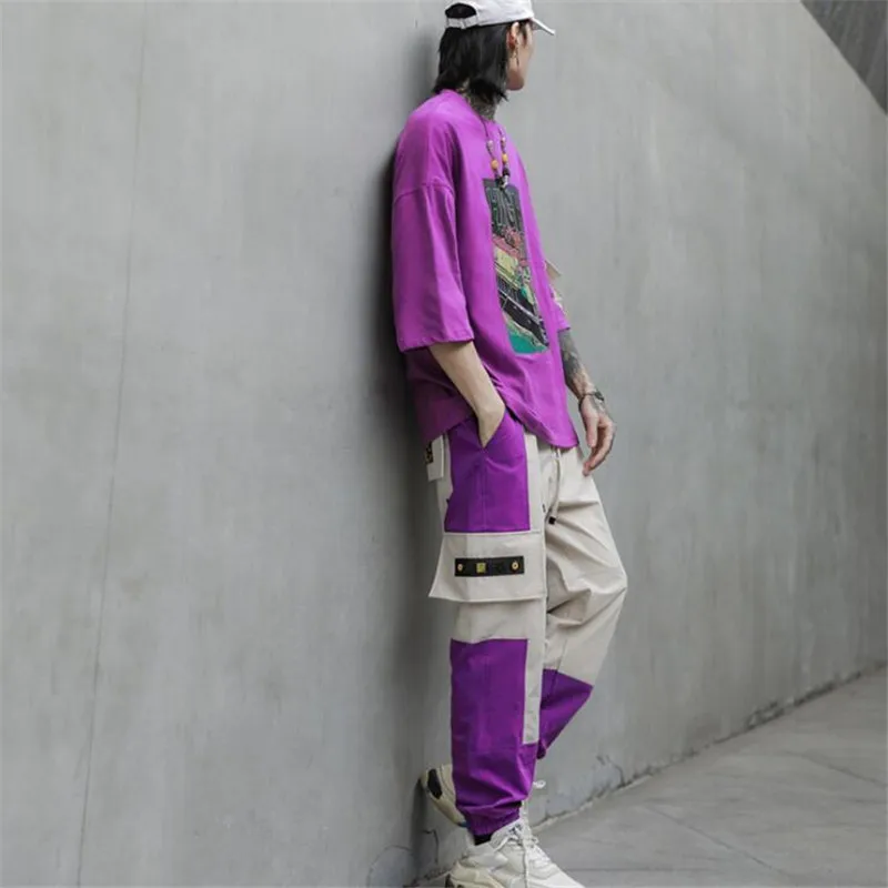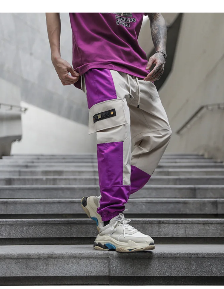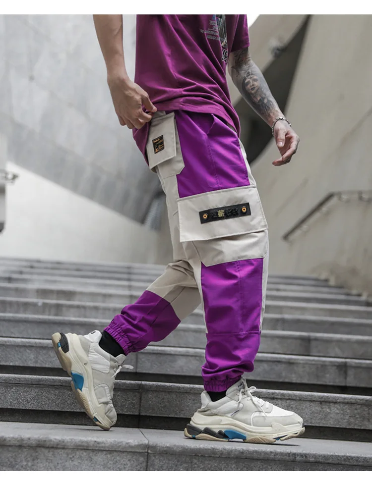 Spring autumn man vintage hip hop cargo pants purple patchwork joggers mens sport sweatpants korean streetwear