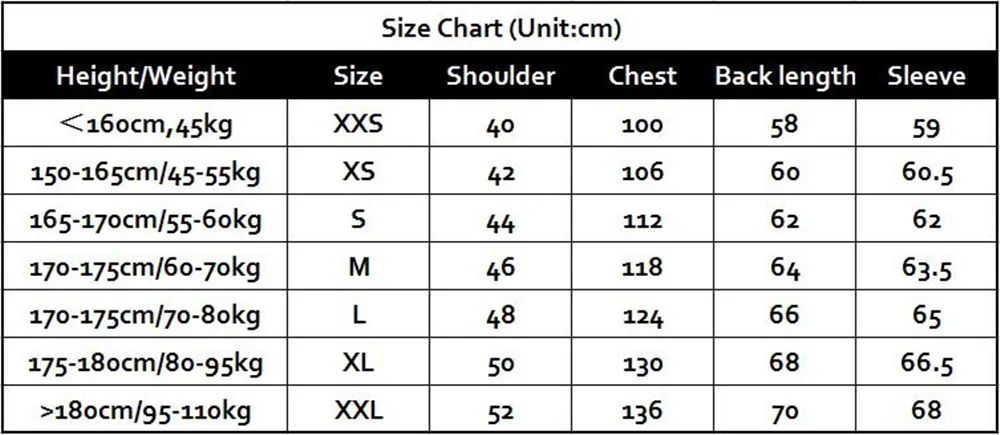 (There are 1-3cm margin of error, If you are not sure the size, Please send the information of your Height, Weight and Chest to me, I will help you choose the correct size. )