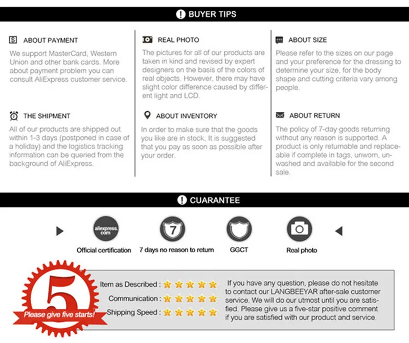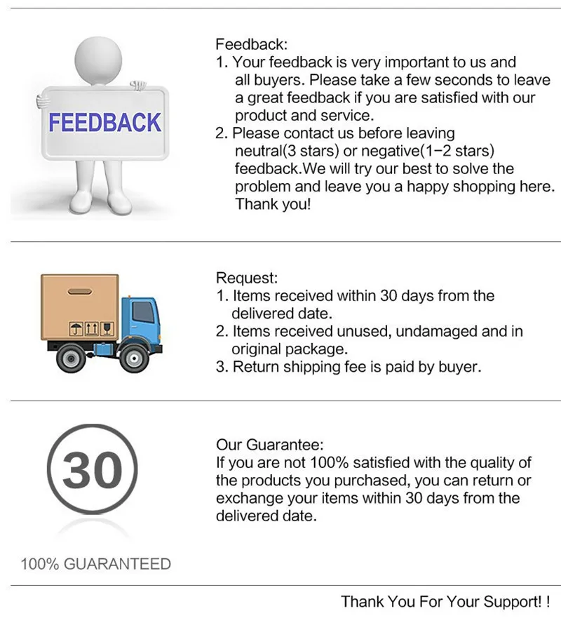 2. If you  are not satisfied our porducts, pls contact us before you leave negative feedback. We guarantee we will make every attempt to resolve the issue. Thank you.