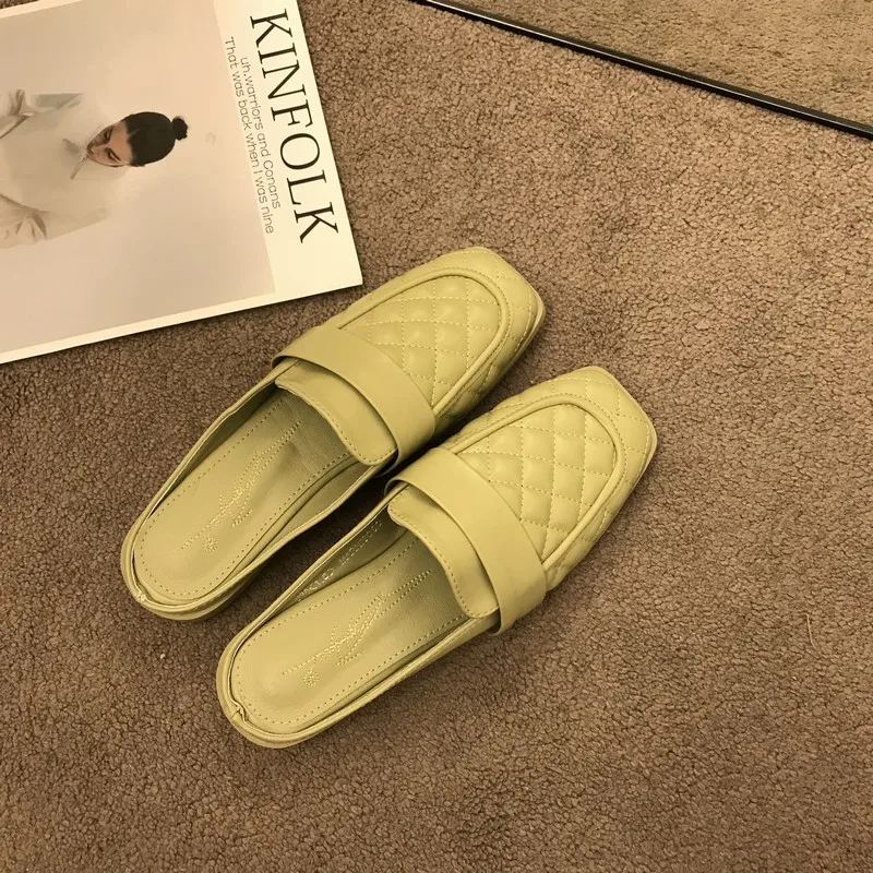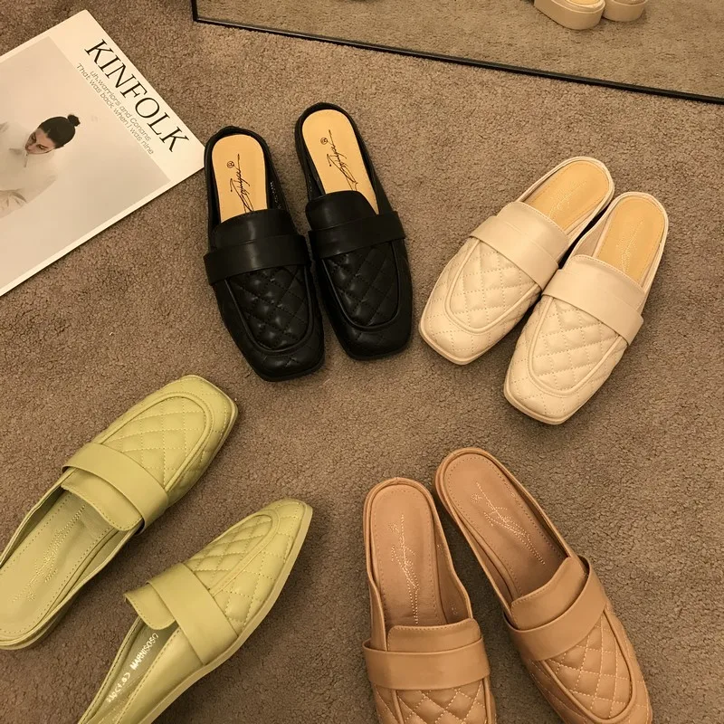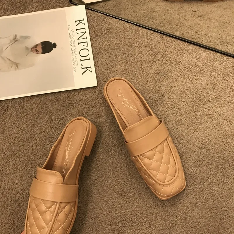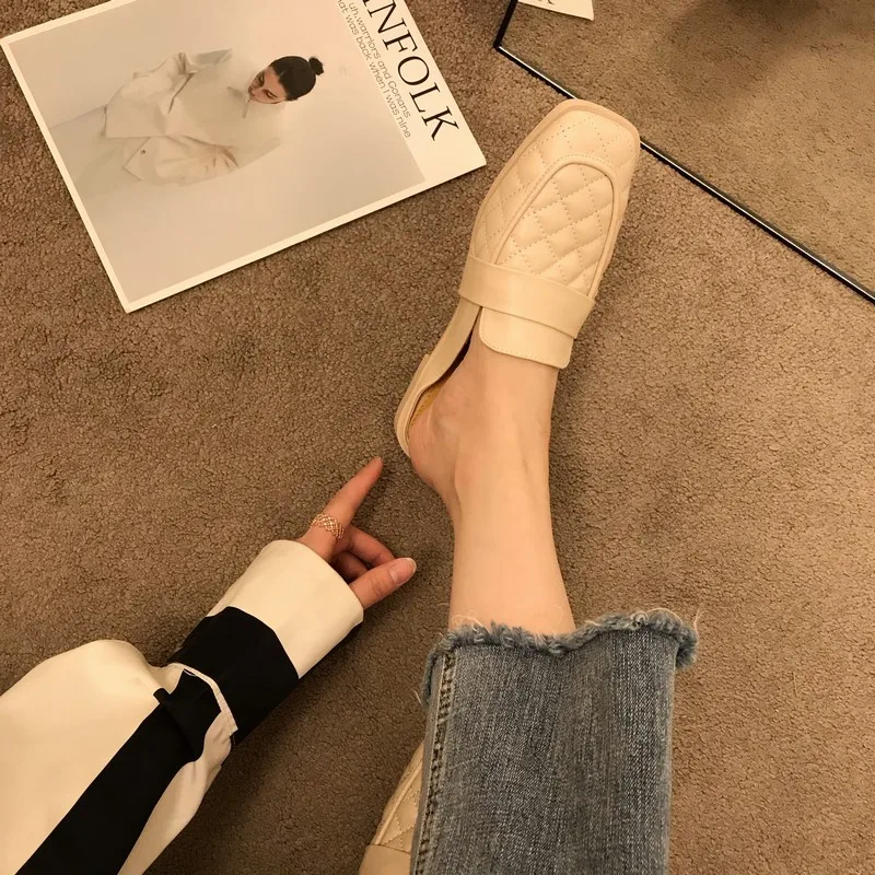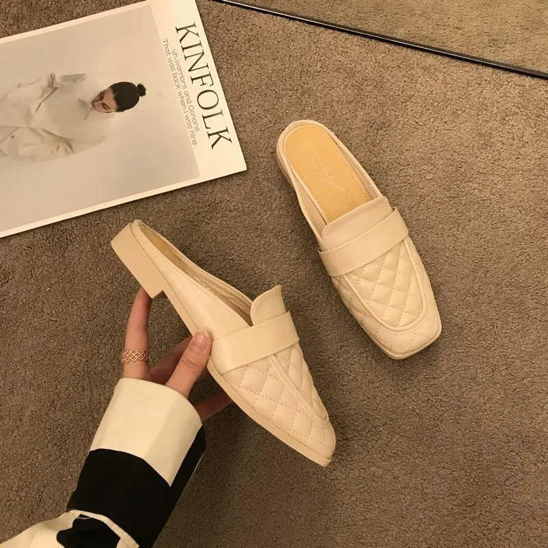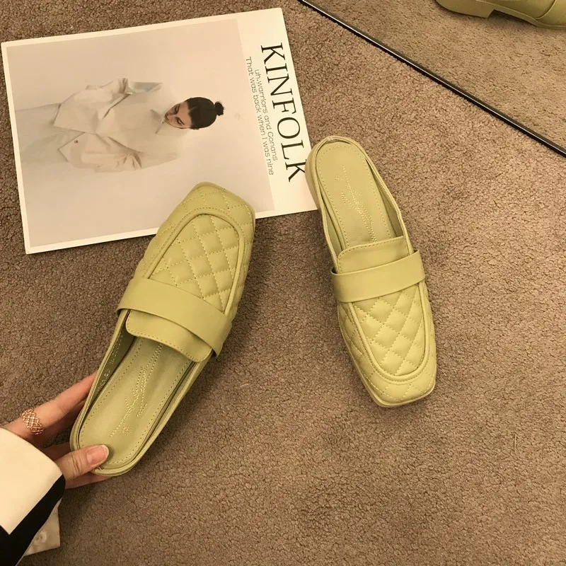 Square Toe weave mules beach flat slides women shoes microfiber leather flip flops solid knitted cover toe slippers women 2020