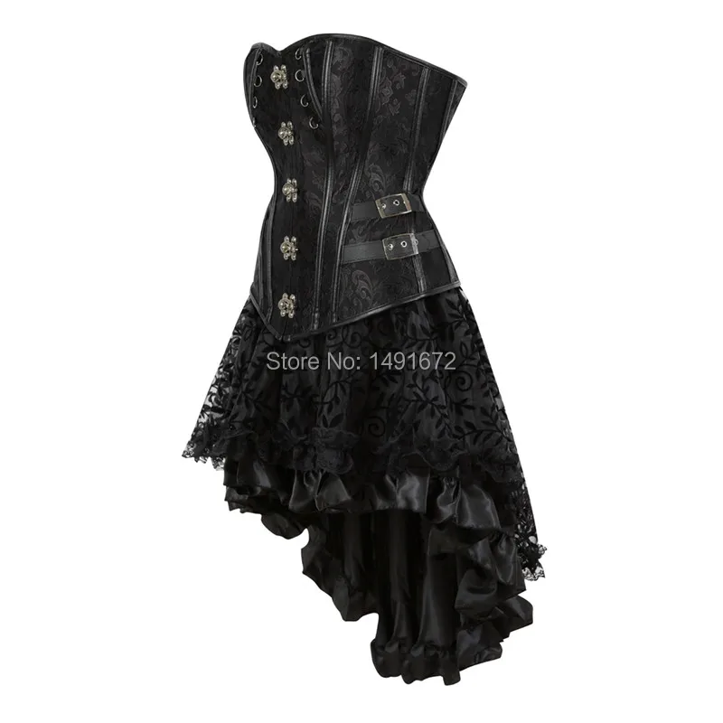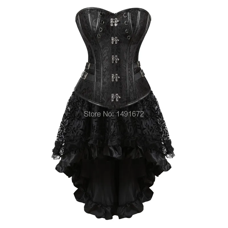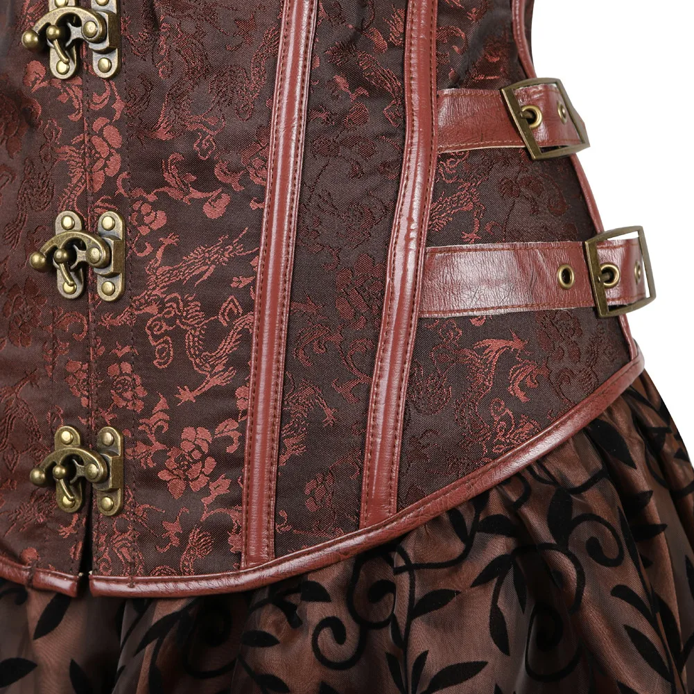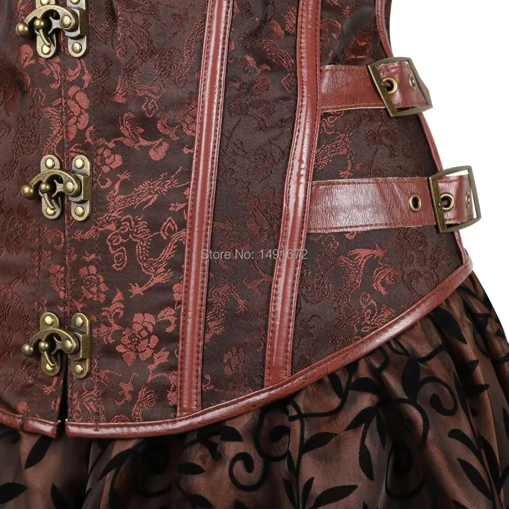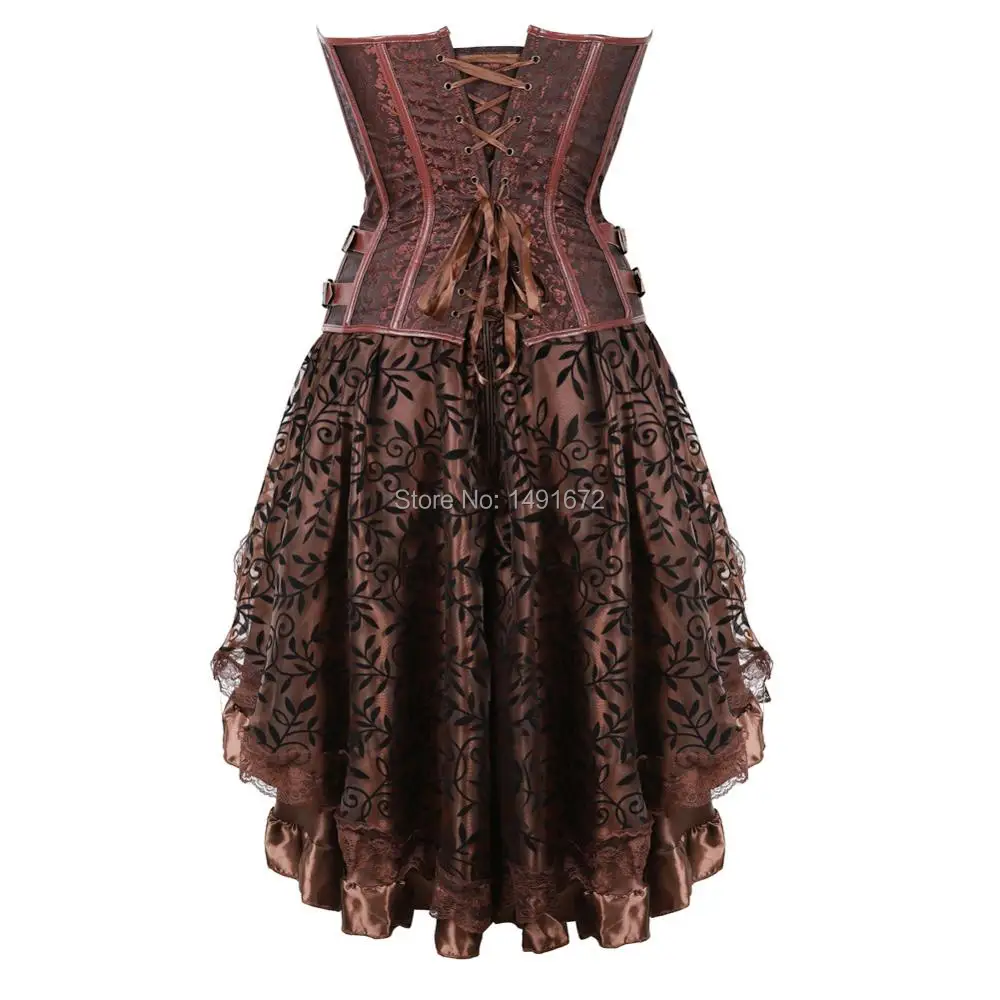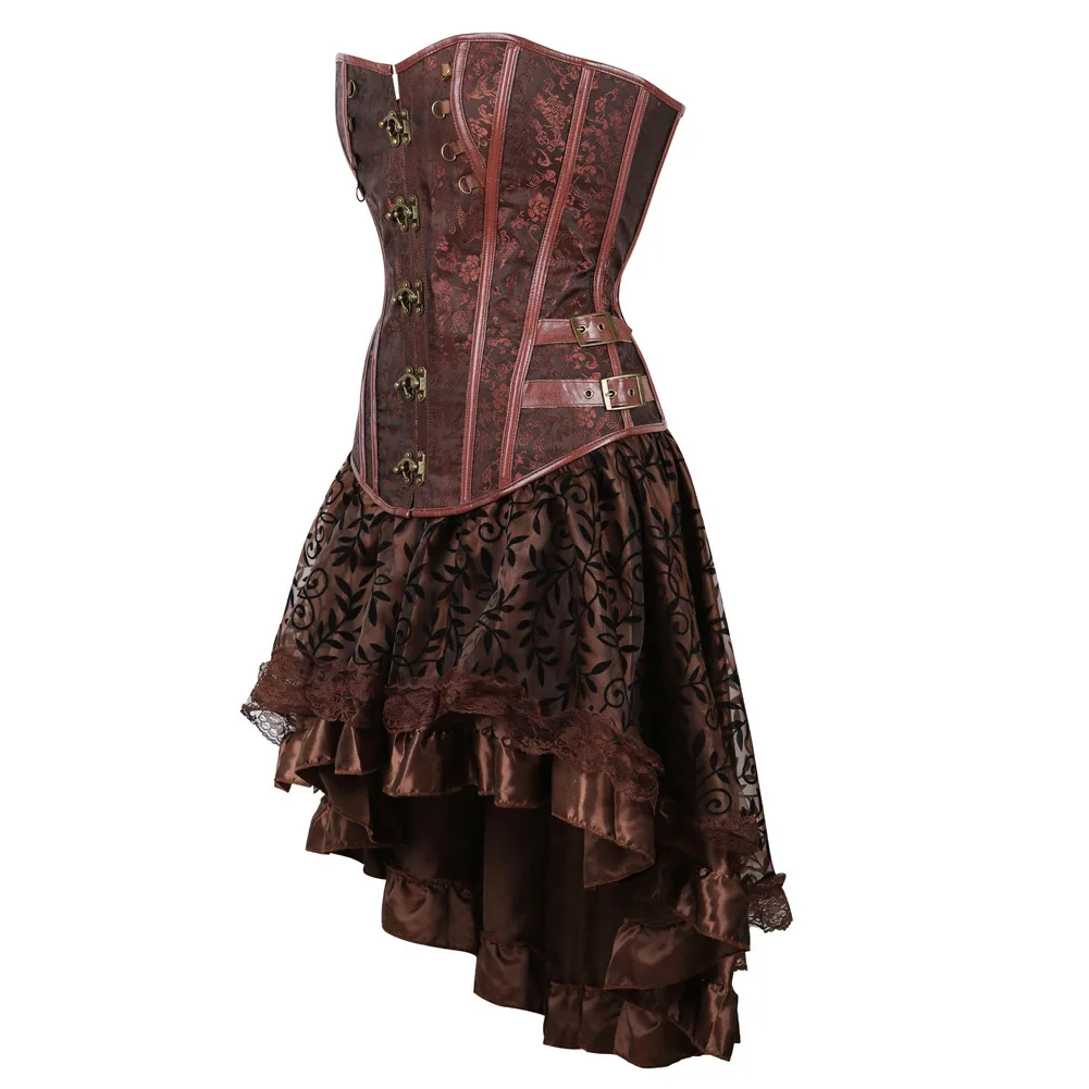 Steampunk Corset Bustier Dresses Skirt Set Burlesque Basques Women Plus Size Vintage Lingerie Pirate Brown