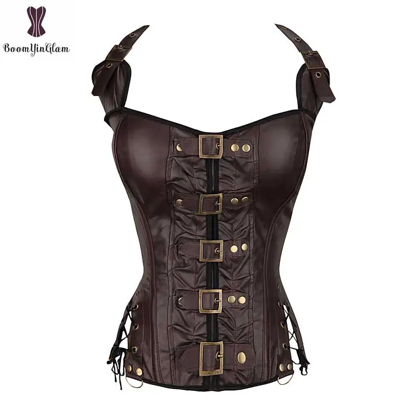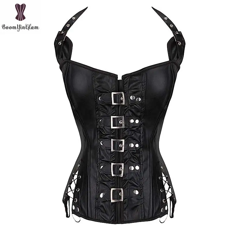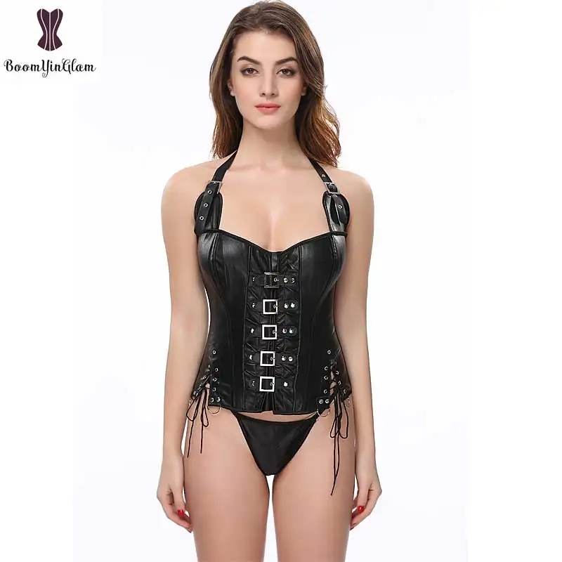 Steampunk Gothic Corset Top Buckle Belt Punk Black Coffee Halter Neck Overbust Corselet Elastic Boned Bustier Gorset Sexy Outfit
