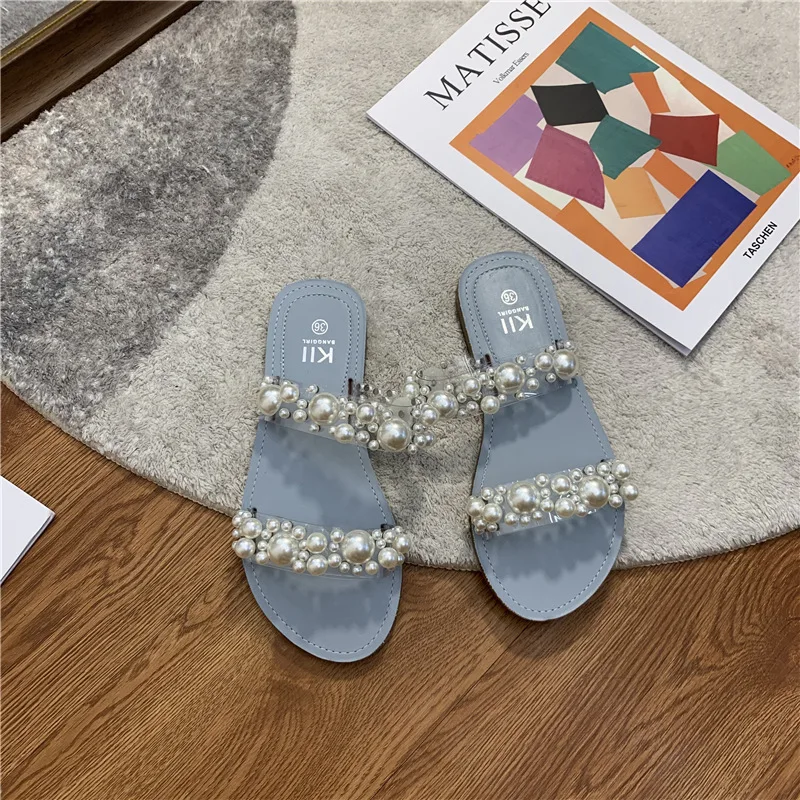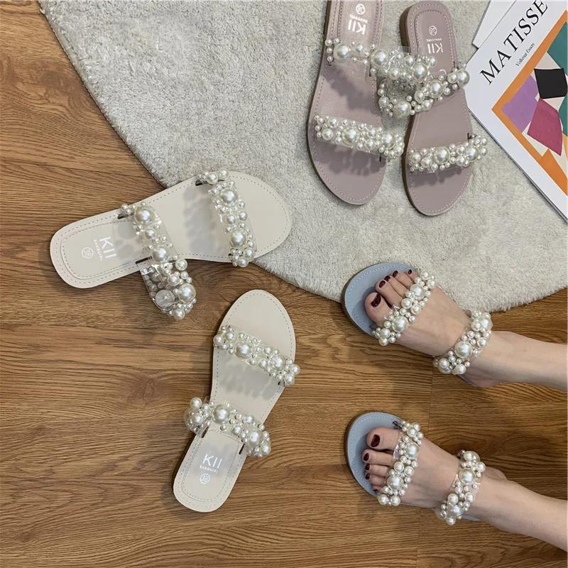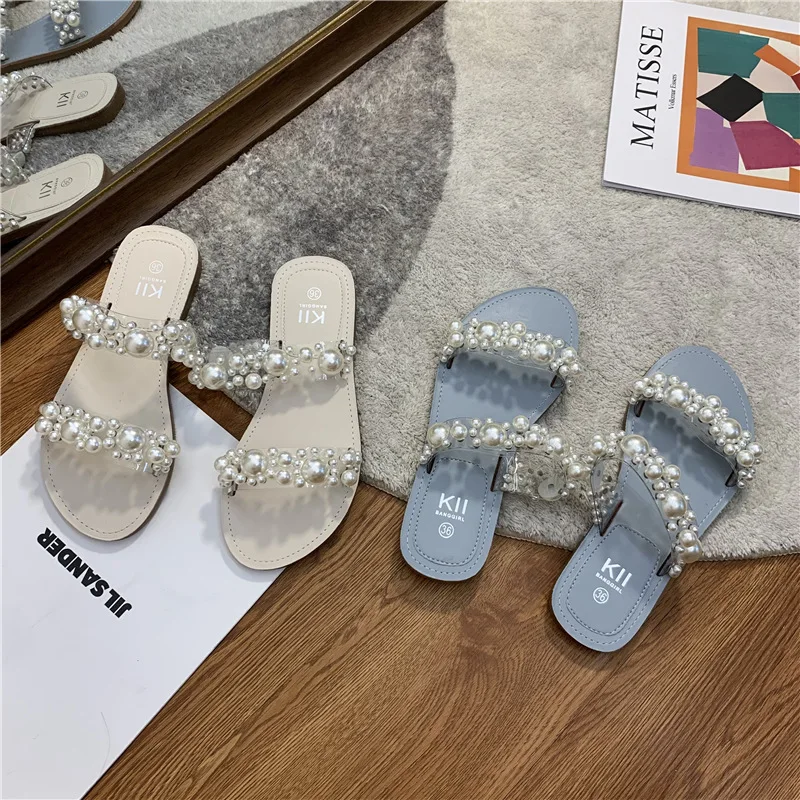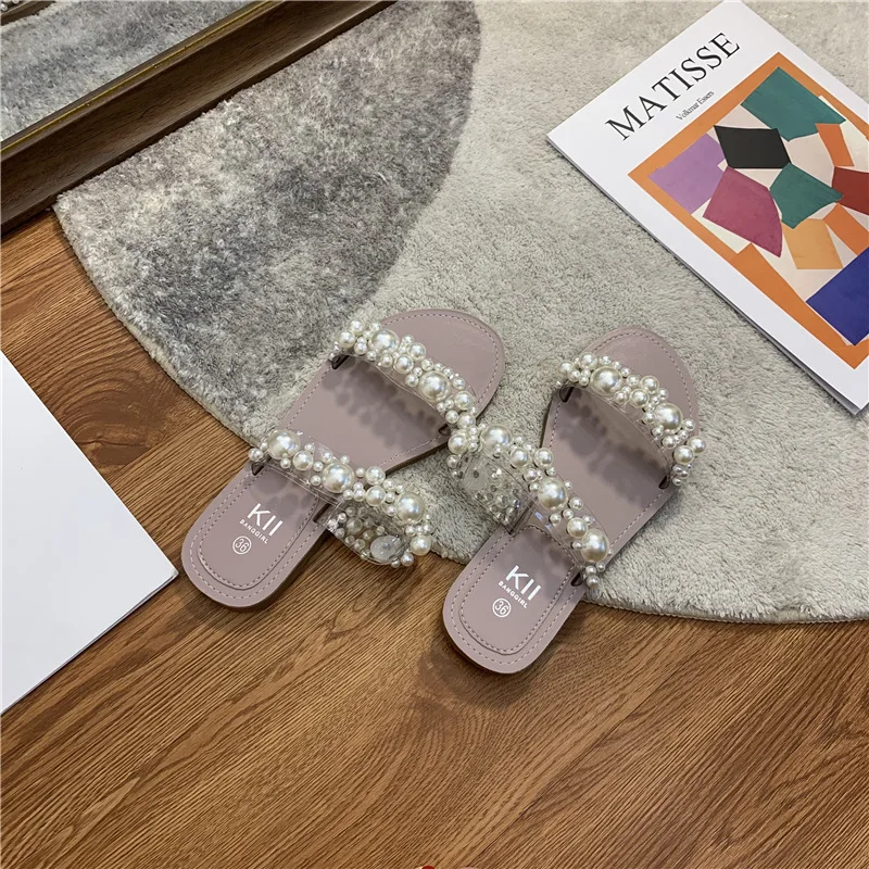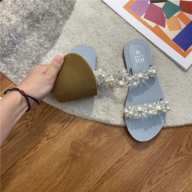 Hot PopularItem DescripptionsNet Celebrity Beads Clear BandSlippers Women Open Toe Flat Summer Shoes Slides Heel Height: 1.5CM Platform Height: 1 CM |