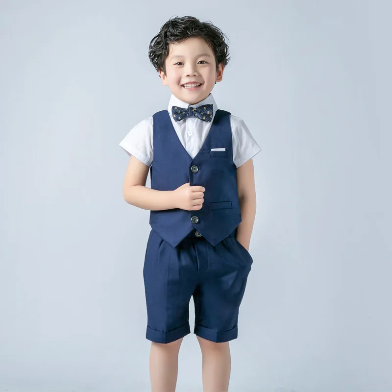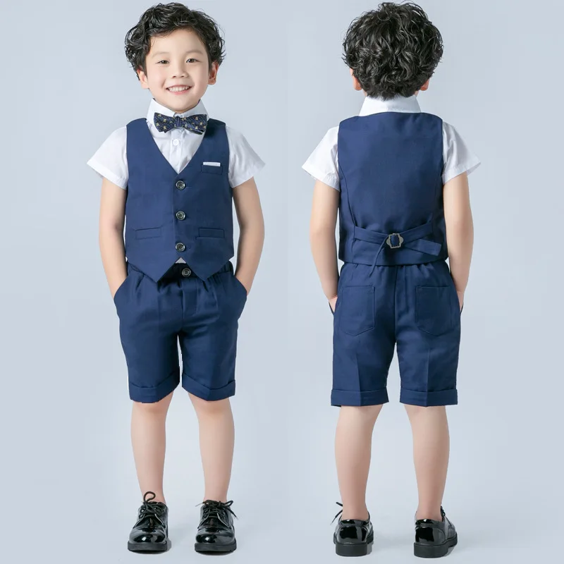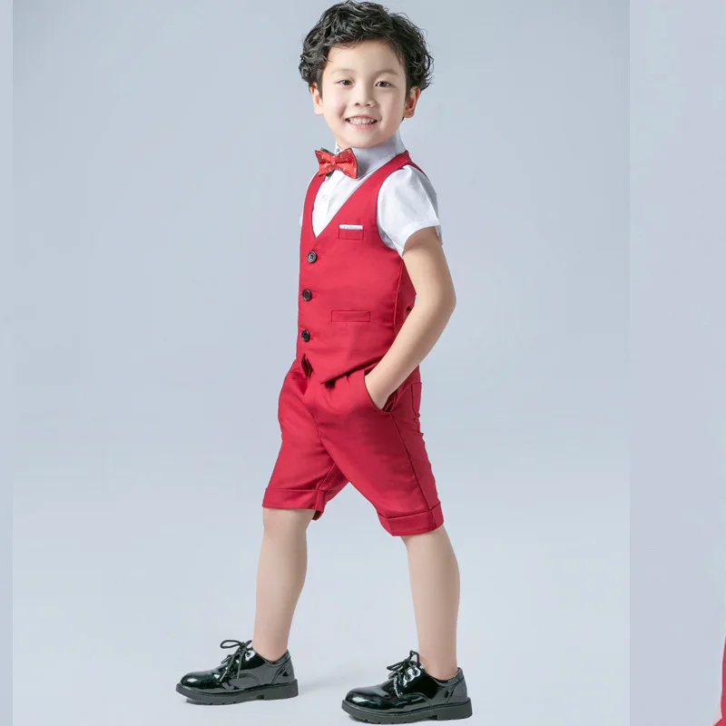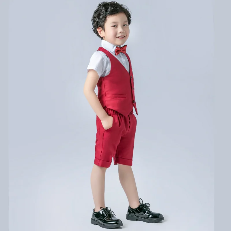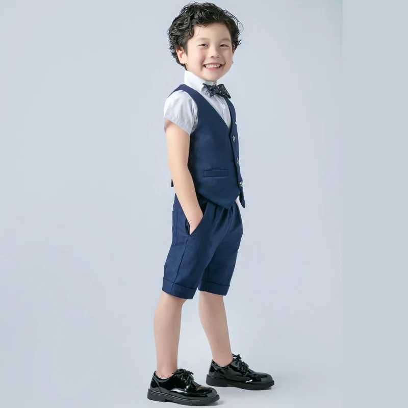 Summer Children’s Vest Dress Suit Set Boy Performance Party Wedding Costume Kids Waistcoats Shorts Bowtie Clothing Set 2-16t