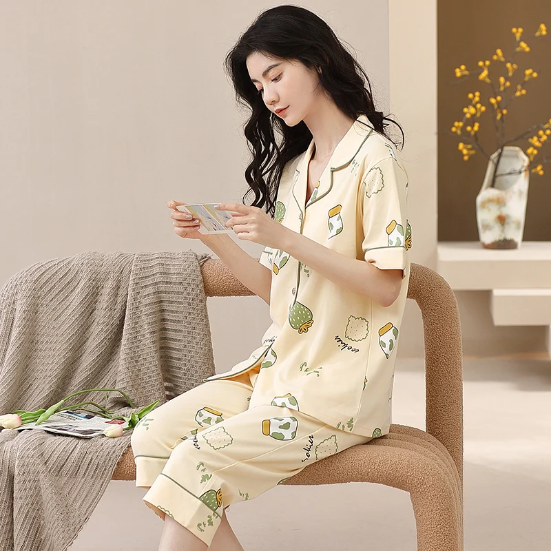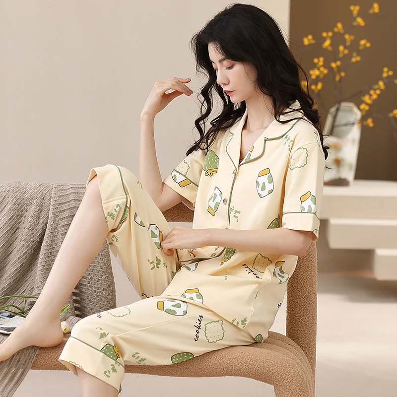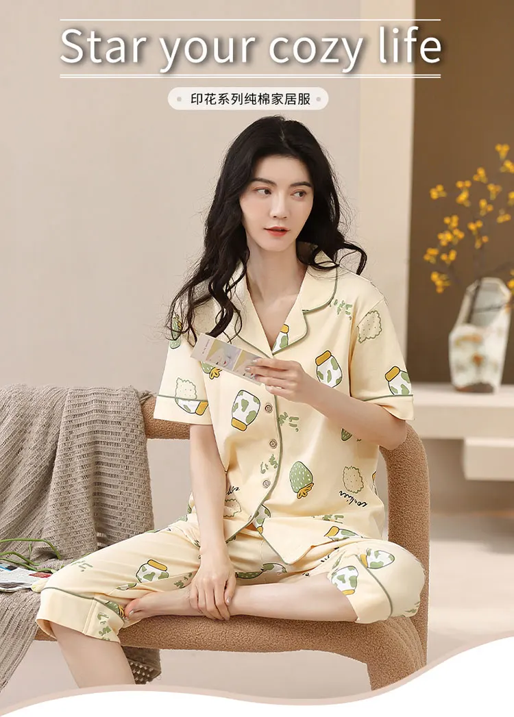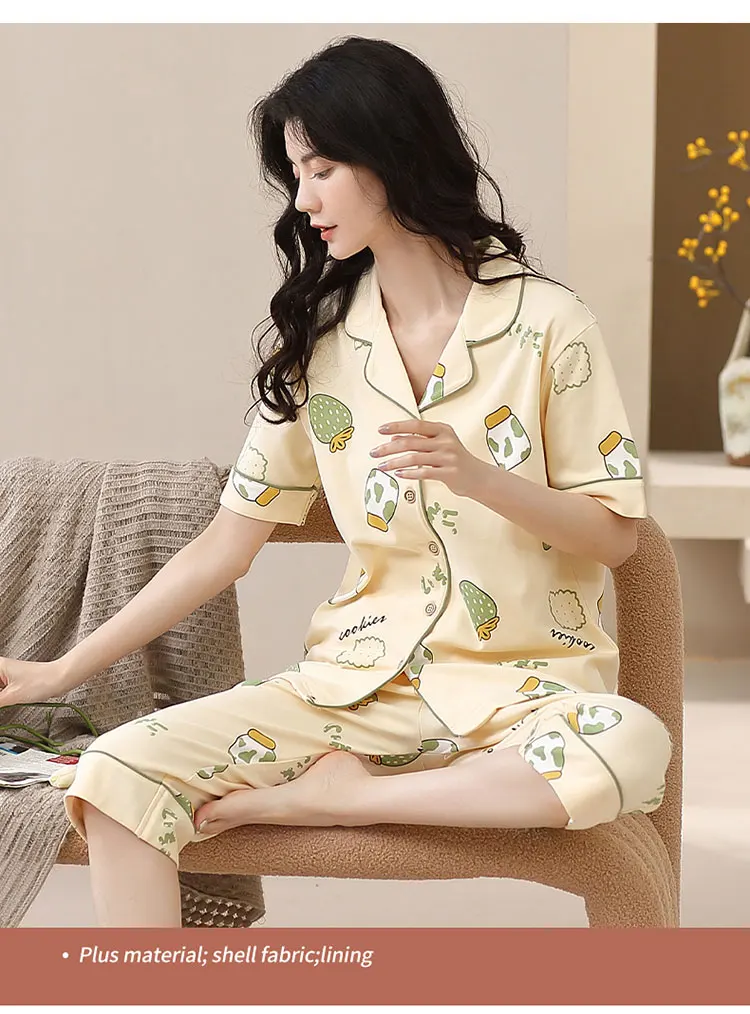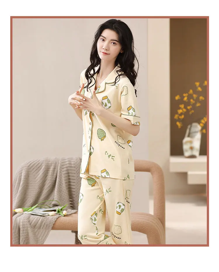 Summer Cotton Cartoon Women Pajamas Set Short Sleeve Turn-down Collar Female Homewear Casual Soft Elegant Cardigan Woman Sleepwe