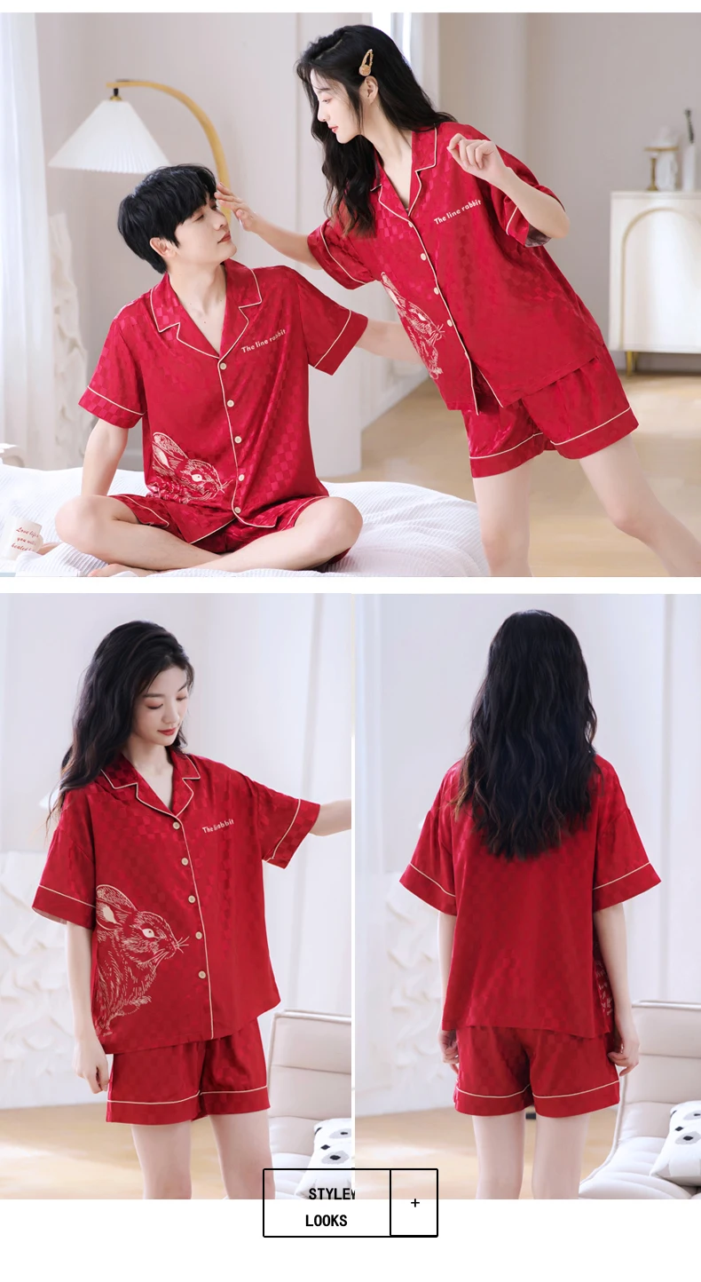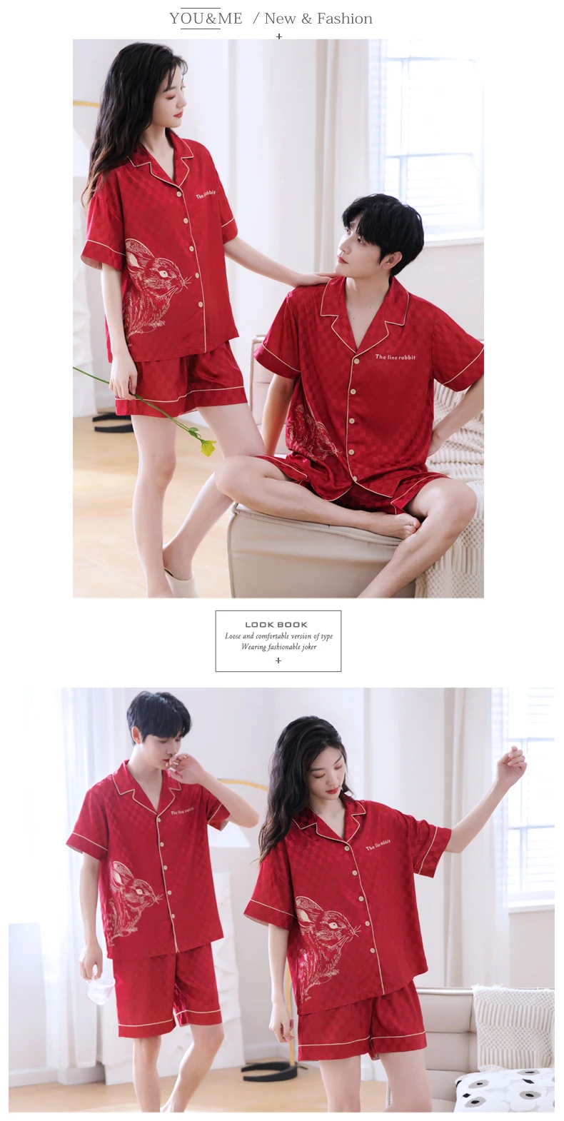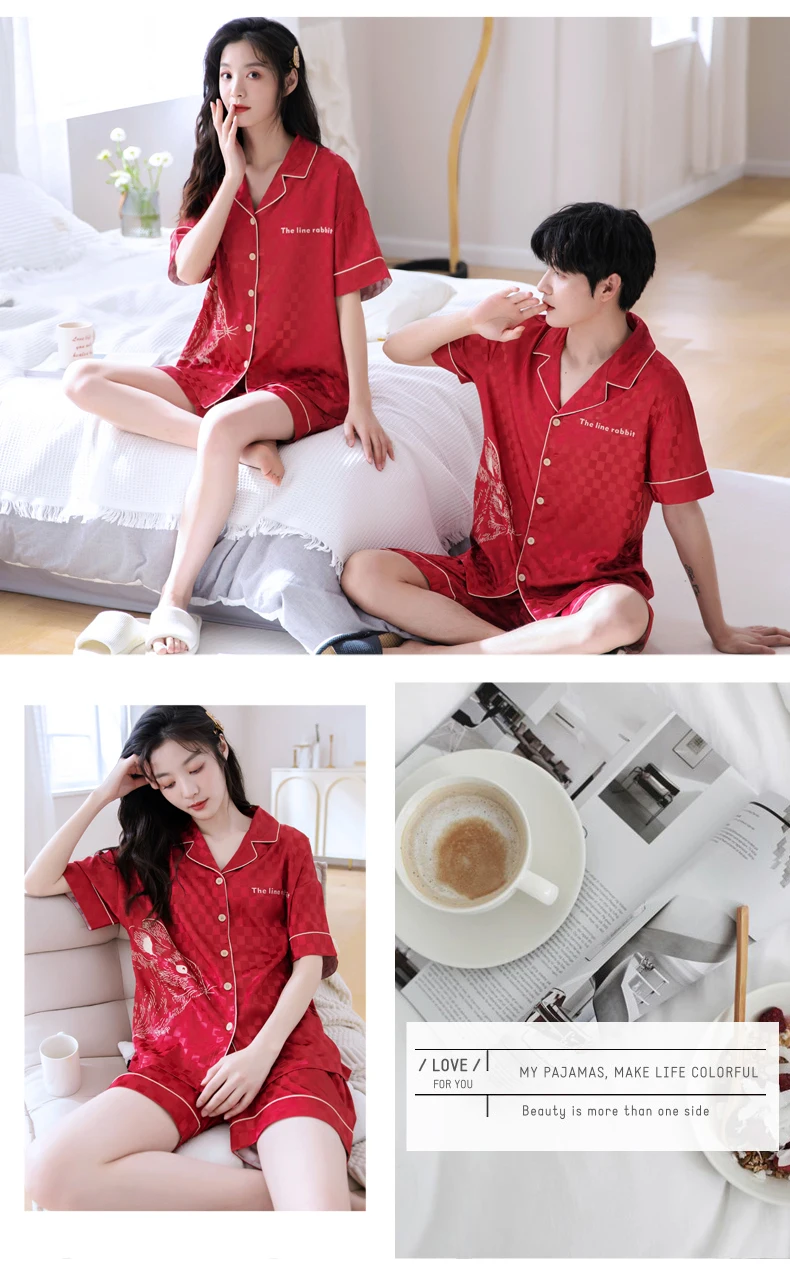 Summer Couple Pajamas Set Cute Cartoon Short Sleeve Sleepwear Men and Women Silk Pijamas Suit